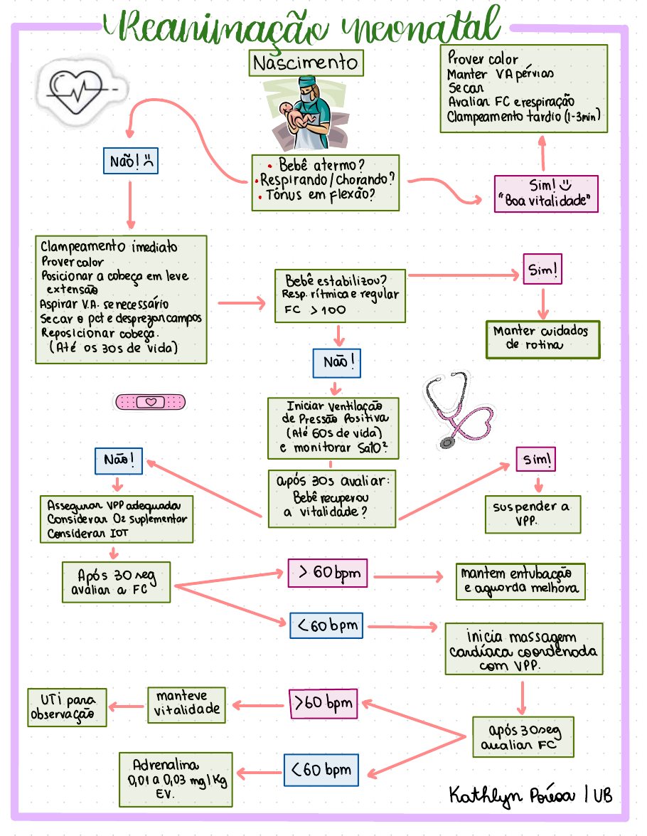 Nascimento Prover calor Manter ✗Apertas secar Avaliar Fcerespiração Clampeamentotardioll -3min) pNão! • Bebêatermo ? • Respirando / Chorando ?\ " Boa vitalidade"• Tônus em flexão? Sim ! E clampeamento imediato Prover calor Posicionar acobeçaemleve Bebê estabilizou? > Sim ! extensão Resp. rítmica e regular Aspirar V. A. se necessario secaropcte desprezarcampos > FC > 100 ✓ Reposicionar cabeça . Manter cuidados ( Até os 30s de vida) ✓ de rotina Não ! ✓ Iniciar ventilação depressão Positiva (Até 60s devida) e monitorar Sato? Não ! r > sim! APÓS 30s avaliar : v & Bebê recuperouAssegurar VPP adequada a vitalidade ? suspendera considerar 02 suplementar VPP. Considerar IOT Ir Após 30mg > > Gobpm > mantem entubação avaliar a FC e aguarda melhora > <Gobpm > inicia massagem cardíaca coordenada com VPP. UTI para manteve observação ✓ vitalidade e 760 bpmr ✓ Após 30dg avaliar FC Adrenalina (60 bpm e 0,0190103mg/ Kg < Eu . Kathlynpáeoou / UB