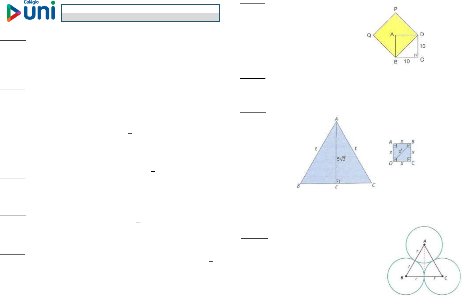 Aplicações do Teorema de Pitágoras – Exercícios de Fixação Professor: Alexandre Ziebarth Turma: 9º ano – Ensino Fundamental II Data: Questão 01. Um quadrado tem 𝟒√𝟓 𝒄𝒎 de lado. Determine a medida da diagonal desse quadrado de duas maneiras: [1.1] usando a fórmula. [1.2] sem usar a fórmula. Questão 02. O lado de um triângulo equilátero mede 𝟏𝟐 𝒄𝒎. Determine a medida da altura desse triângulo de duas maneiras: [2.1] usando a fórmula. [2.2] sem usar a fórmula. Questão 03. A diagonal de um quadrado mede 𝟏𝟏√𝟐 𝒄𝒎. Determine a medida do lado e o perímetro desse quadrado. Questão 04. Em um triângulo equilátero a altura mede 𝟑√𝟑 𝒄𝒎. Qual é o perímetro desse triângulo equilátero? Questão 05. Se um quadrado tem de área 𝟐𝟐𝟓 𝒄𝒎𝟐, qual é a medida, expressa em forma decimal, da diagonal desse quadrado? [Use √𝟐 = 𝟏, 𝟒𝟏]. Questão 06. A área de um triângulo pode ser calculada multiplicando-se a medida de um lado pela metade da altura relativa a esse lado. Nessas condições e fazendo √𝟑 = 𝟏, 𝟕𝟑, determine a área de um triângulo equilátero cujo lado mede 𝟒 𝒄𝒎. Questão 07. Na figura abaixo, as medidas estão expressas em centímetros. Determine: [7.1] a medida do lado do quadrado 𝐁𝐃𝐏𝐐. [7.2] o perímetro desse quadrado. [7.3] a área desse quadrado. Questão 08. A medida do lado de um triângulo equilátero é igual à medida da diagonal de um quadrado de lado 𝟔 𝒄𝒎. Determine a medida da altura desse triângulo. Questão 09. Observe as figuras abaixo e determine o que se pede. Sabendo que o perímetro do quadrado 𝐀𝐁𝐂𝐃 é um terço do perímetro do triângulo equilátero 𝐀𝐁𝐂, determine a medida da diagonal do quadrado. Questão 10. Na figura abaixo, cada circunferência tem 𝟏, 𝟓 𝒄𝒎 de raio. Determine a área do triângulo 𝐀𝐁𝐂.