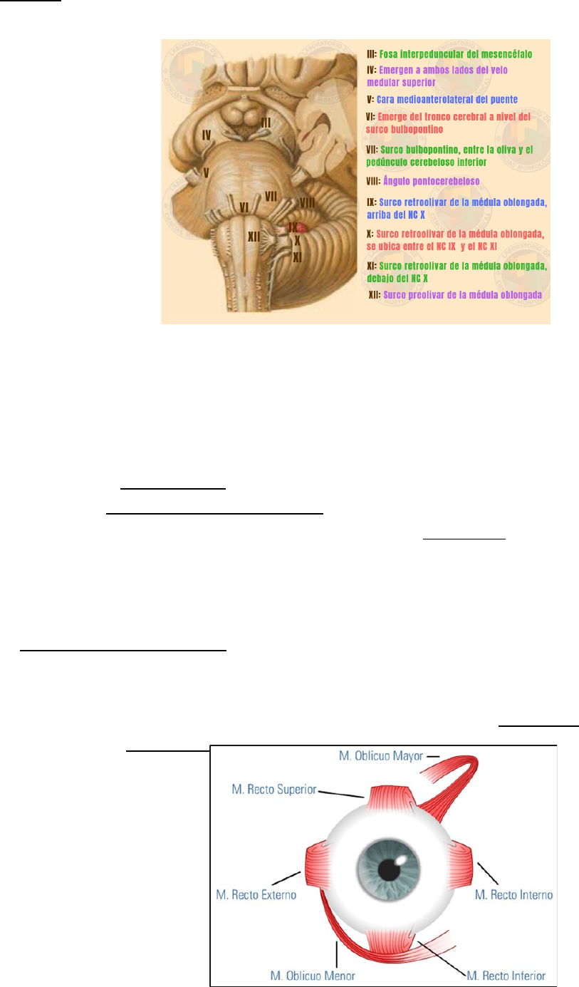 PARES CRANEALES ORIGENS Y RECURRIDOS: OBS: - Los pares cuanto mayor el nº, más abajo está. - Los pares van de 4 en 4 por el tronco del encéfalo (ejemplo: del IX al XII están en el bulbo) - Los pares pueden ser motores, sensitivos o mixtos (pueden tener un componente parasimpático) - Los núcleos son posteriores -Los nervios sensitivos tienen su origen real en los ganglios geniculados, pero los sensitivos sensoriales tiene origen en los órganos de los sentidos (ej: olfato, óptico, auditivo). Los nervios motores tienen origen en los núcleos motores dentro del tronco - El par III, IV, VI son nervios oculomotores, o sea, responsables por la musculatura extrínseca de los ojos, anillo de zinn (movilidad globular). El Motor Ocular Común inerva el músculo ciliar, esfínter de pupila, recto superior (rama superior), recto inferior (rama inferior), recto interno (rama inferior), oblicuo menor (rama inferior) y parpado superior (rama superior), como también la musculatura INTRISECA. Ya el Patético inerva el oblicuo mayor y el Motor Ocular Externo inerva el recto externo. - La inervación de la glándula submaxilar y sublingual es gracias a la anastomose de la rama de la cuerda del tímpano (nervio facial) y la rama lingual (rama maxilar inferior- nervio trigémino) - La inervación de la lengua gracias a la anastomose de la rama facial (nervio facial), rama de la cuerda del tímpano (nervio facial) y la rama lingual (rama maxilar inferior- nervio trigémino) - Inervación de la parótida se da con la rama auriculotemporal (rama maxilar inferior – trigémino) y con el nervio glosofaríngeo (IX) I PAR: OLFATORIO - Neuronas sensitivas sensoriales - Origen real: células bipolares en la mucosa olfatoria/pituária - Origen aparente: cara inferior del bulbo olfatorio que es el área olfatoria primaria del cerebro - Recurrido: Neuronas bipolares en la macha amarilla de la mucosa nasal (coana superior) emiten prolongaciones ascendentes que van se reunir hasta llegar en la lámina cribosa, bulbo olfatorio y hasta al cerebro por la cintilla olfatoria para llegar al trígono olfatorio. Llega en la región hipotalámica, más específicamente (Perforado anterior) II PAR: ÓPTICO · Sensitivo sensorial con origen en el globo ocular · Origen real: células bipolares · Origen aparente: ángulo anterior a través del quiasma óptico en la masa encefálica (papilla óptica) · Recurrido: · 1ª Intraocular: desde la formación de la retina hasta la salida del glóbulo. Para atravesar el glóbulo tiene que pasar por dos capas superficiales (Esclerótica y Coroides en la zona cribosa) · 2ª Intraorbitário: cuando atravesar queda dentro de la fosa orbitaria hasta salir por el agujero óptico donde el nervio se relaciona con la arteria oftálmica y externamente con el ganglio oftálmico. · 3ª Intracanicular: el nervio atraviesa el agujero óptico · 4ª Intracraneal: es entre el agujero óptico y el quiasma óptico donde se encontra con el nervio contralateral para producir la decusación óptica (quiasma óptico). Una vez realizada van, como cintilla óptica, en la región del tálamo (cuerpo geniculado externo) para producir fibras para formar las radiaciones ópticas e ir hacia el lóbulo occipital III PAR: MOTOR OCULAR COMUN: · Es motor y tiene un componente parasimpático · Origen real: · Motor: en la sustancia gris periacueductal del mesencéfalo hay el núcleo somatomotor · Parasimpático/Visceral: en la sustancia gris periacueductal del mesencéfalo el núcleo de Edinger-Wesphal/Iridioconstritor · Origen aparente: fosa intrapeduncular del mesencéfalo · Recurrido: fosa intrapeduncular, ingresa al seno cavernoso donde recorre la pared externa, abandona y ingresa la órbita a través de la hendidura esfenoidal donde hay una región medial que tiene el orificio óptico que está marcado por el Anillo de Zinn donde ingresan ambas ramas superiores y inferiores. · Recurrido Parasimpático: Neurona preganglionar (Núcleo Edinger-Wesphal) -> Neurona postganglionar (Ganglio oftálmico) -> Hendidura esfenoidal (rama superior y inferior) ->Nervio Ciliar corto -> Iris - Función: colocar el glóbulo ocular en su lugar exacto, enfoque de distancia, enfoque de los objetos, acomodación de la luz/ controla la cantidad de luz, mirar hacia arriba y abajo, o sea, fijar la vista IV PAR: PATÉTICO: - Motor - Origen real: núcleos somatomotores del mesencéfalo en la sustancia gris periacueductal - Origen aparente: Lados del frenillo de la válvula de Viussens/Velo medular superior (nivel mesencefálico posterior) - Único par en la cara posterior del mesocéfalo y que se decusa antes de salir. - Recurrido: pared externa de los senos cavernosos debajo del M.O.C., ingresa en la hendidura esfenoidal por la cauda esfenoidal, o sea, por fuera del anillo de zinn - Función: mirar hacia abajo y adentro. V PAR: TRIGEMINO: · Nervio mixto: Moto (inerva los músculos masticatorios) y Sensitivo (inerva la cara y mitad anterior de la cabeza) · No tiene contenido parasimpático, pero cada rama se reúne con un componente parasimpático · Función: sensibilidad de la piel de la cara, mucosa de cavidad nasal, oral y lengua. Inervación motora a los músculos de la masticación · Origen real: · Motor: Núcleo masticador en la protuberancia y núcleo accesorio en el mesencéfalo · Sensitiva: Ganglio de Gasser (se inserta en el hueso temporal). Hay 3 orígenes sensitivas. Sensitiva mesencefálica, sensitiva protuberancial (la mas importante) y sensitiva espinal que queda en el bulbo · Origen aparente: región protuberancial anterolateral (fóvea superior) · Recurrido: Las dos raíces viajan en conjunto ubicándose la raíz motora debajo de la sensitiva. La raíz sensitiva al llegar al ganglio de gasser forma la RAMA MAXILAR SUPERIOR e INFERIOR gracias a su RAMA OFTÁLMICA que está en la pared externa del seno cavernoso. La raíz motora al llegar al ganglio de gasser pasa debajo incorporándose a la rama maxilar 