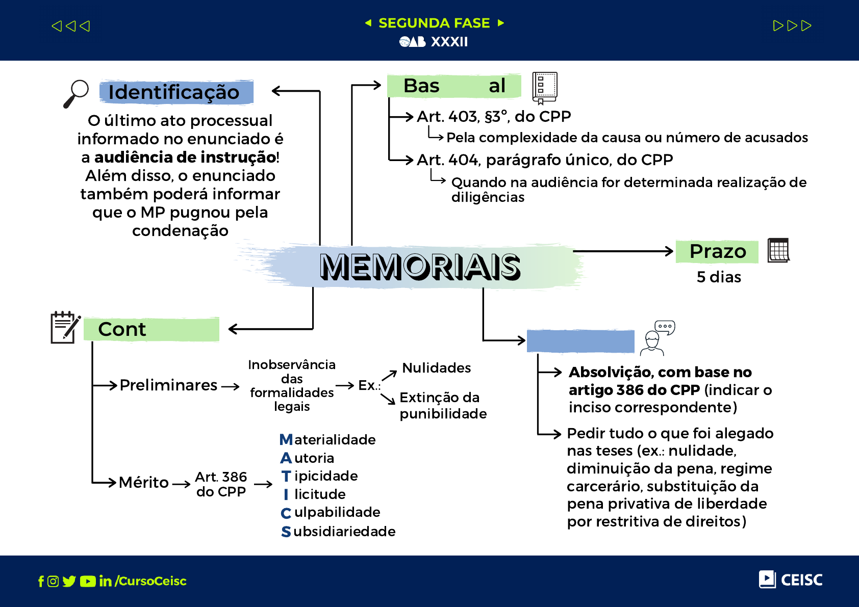 Preliminares Memoriais Prazo Mérito Identificação Base legal Conteúdo Pedidos O último ato processual informado no enunciado é a audiência de instrução! Além disso, o enunciado também poderá informar que o MP pugnou pela condenação Art. 403, §3º, do CPP Absolvição, com base no artigo 386 do CPP (indicar o inciso correspondente) 5 dias Pedir tudo o que foi alegado nas teses (ex.: nulidade, diminuição da pena, regime carcerário, substituição da pena privativa de liberdade por restritiva de direitos) Inobservância das formalidades legais Ex.: Extinção da punibilidade Nulidades Art. 386 do CPP Pela complexidade da causa ou número de acusados Art. 404, parágrafo único, do CPP Quando na audiência for determinada realização de diligências M A T I C S aterialidade utoria ipicidade licitude ulpabilidade ubsidiariedade
