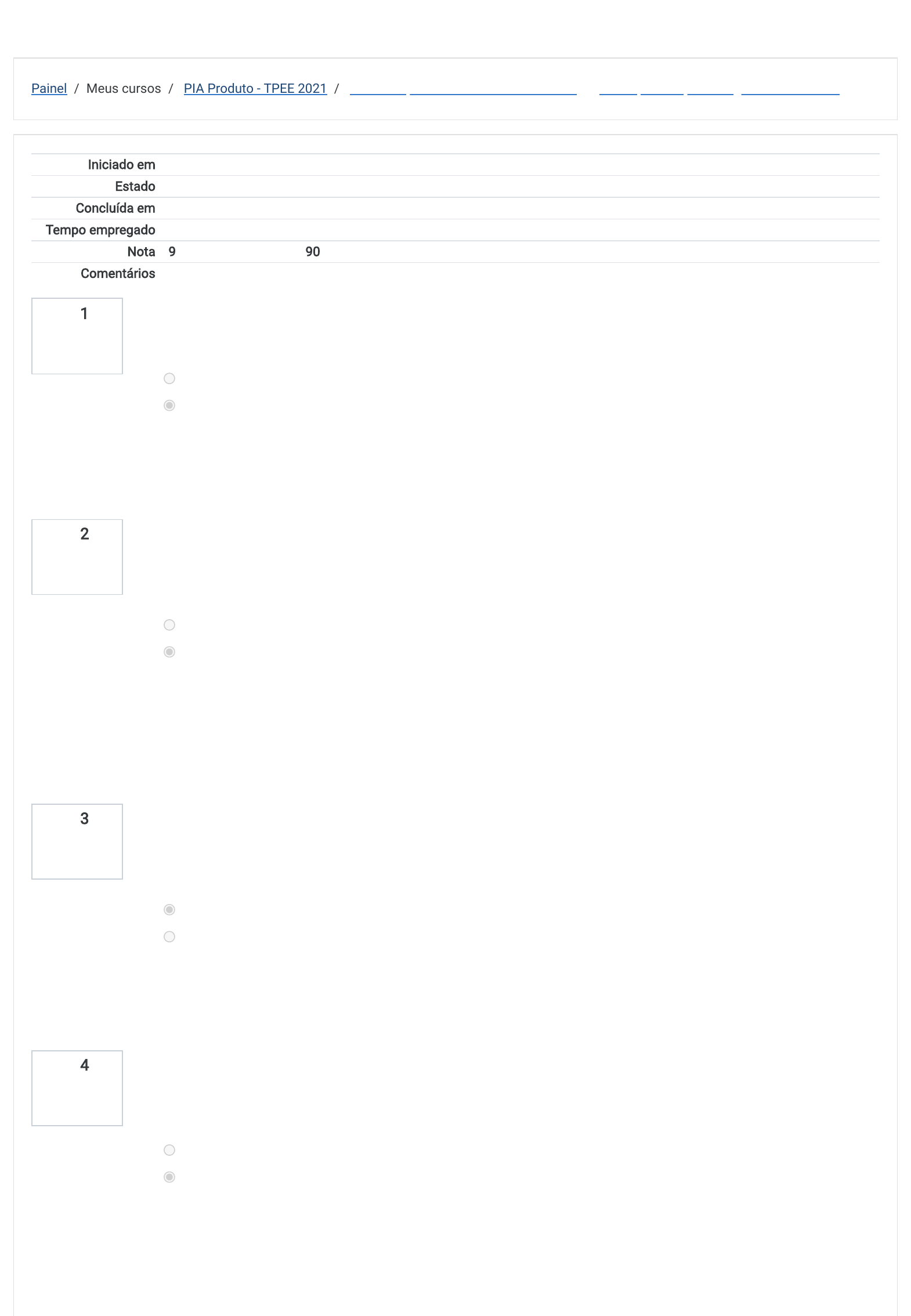 Painel / Meus cursos / PIA Produto - TPEE 2021 / PIA - Pesquisa Industrial Anual Produto / Avaliação da aprendizagem - PIA Produto Questão 1 Correto Atingiu 1 de 1 Questão 2 Correto Atingiu 1 de 1 Questão 3 Correto Atingiu 1 de 1 Questão 4 Correto Atingiu 1 de 1 Iniciado em quarta, 4 Ago 2021, 10:00 Estado Finalizada Concluída em quarta, 4 Ago 2021, 10:21 Tempo empregado 20 minutos 10 segundos Nota 9 de um máximo de 10(90%) Comentários Excelente!Você compreendeu muito bem o conteúdo deste módulo. A PIA-Produto baseia-se em uma lista de produtos chamada de Prodlist com mais de 6.400 produtos. Escolha uma opção: Verdadeiro Falso A Prodlist tem cerca de 3.400 produtos. A Quantidade Vendida (QV) do produto, informada no Capítulo 04, deverá ser igual à Quantidade Produzida (QP) do produto. Escolha uma opção: Verdadeiro Falso A QV não precisa ser necessariamente igual a QP, dado que a empresa pode vender estoque de anos anteriores, transferir QP para unidades de venda da empresa, dentre outras situações. A receita líquida da PIA-Empresa (item 20) pode englobar a receita da atividade industrial e de outras atividades, enquanto a receita líquida informada na PIA-Produto corresponde somente à receita líquida industrial. Escolha uma opção: Verdadeiro Falso A receita líquida na PIA-Produto está exclusivamente ligada a atividades industriais Quando a UL produtiva industrial transfere toda sua produção, devem ser declaradas as quantidades produzidas e o valor das transferências na coluna receita líquida de vendas. Escolha uma opção: Verdadeiro Falso Na PIA-Produto, só se preenche RLV quando existe quantidade vendida. O valor das transferências será registrado apenas na Parte III do questionário da PIA-Empresa, item 196. https://encecapacitacao.ibge.gov.br/ev/my/ https://encecapacitacao.ibge.gov.br/ev/course/view.php?id=463 https://encecapacitacao.ibge.gov.br/ev/course/view.php?id=463#section-1 https://encecapacitacao.ibge.gov.br/ev/mod/quiz/view.php?id=11847 Questão 5 Correto Atingiu 1 de 1 Questão 6 Incorreto Atingiu 0 de 1 Questão 7 Correto Atingiu 1 de 1 Questão 8 Correto Atingiu 1 de 1 A receita líquida de venda de produtos e serviços industriais, solicitada no Capítulo 03 da PIA-Produto, é igual à receita líquida industrial declarada nas UL produtivas industriais da PIA-Empresa (V197). Escolha uma opção: Verdadeiro Falso As receitas são as mesmas porque referem-se à mesma produção industrial. Faz parte da rotina de crítica, a veri�cação dos produtos declarados na PIA-Produto em comparação com a CNAE de seleção do IBGE para a UL e também a CNAE do informante, ambas informadas no cap. 2 - Dados cadastrais da Unidade Local. Escolha uma opção: Verdadeiro Falso A conferência se faz necessária para veri�car a compatibilidade dos produtos e serviços industriais declarados com a atividade vinculada à empresa na seleção da mesma ou a declarada pelo INFORMANTE no momento do preenchimento do questionário. A Pesquisa Industrial Anual - Produto (PIA-Produto), junto com a Pesquisa Industrial Anual - Empresa (PIA-Empresa), formam o núcleo central das estatísticas industriais. Além de apresentarem informações importantes em si mesmas, estas pesquisas são a base de referência para o desenho de pesquisas conjunturais (como a PIM-PF) e de pesquisas especiais. Escolha uma opção: Verdadeiro Falso O conjunto das duas pesquisas provê uma visão das estatísticas da indústria nacional, além de suas bases servirem de ponto de partida para a criação da amostra de pesquisas conjunturais de indústria. As informações de quantidades produzidas ou vendidas em uma unidade de medida divergente da solicitada pelo IBGE não representa nenhuma di�culdade na apuração da pesquisa. Escolha uma opção: Verdadeiro Falso As quantidades informadas podem ser respondidas em unidades de medida conversíveis ou não conversíveis à unidade de medida solicitada pelo IBGE de um produto qualquer, sendo uma di�culdade a mais na apuração da pesquisa. É preciso rati�car para o informante a importância dele auxiliar na conversão por meio de observações no questionário, caso não seja possível que ele mesmo faça a conversão. Questão 9 Correto Atingiu 1 de 1 Questão 10 Correto Atingiu 1 de 1 Na coluna Quantidade Produzida (QP) no ano, deve ser declarada a totalidade dos produtos fabricados no ano independentemente de terem sido vendidos ou não. Escolha uma opção: Verdadeiro Falso Quantidade Produzida (QP) é a quantidade do produto fabricado pela UL no ano de referência, seu valor não tem relação natural com a Quantidade Vendida (QV). São condições necessárias para uma empresa fazer parte da PIA-Produto: ter registro no Cadastro Nacional de Pessoa Jurídica – CNPJ, do Ministério da Economia e estar classi�cada no Cadastro de Empresas – CEMPRE, do IBGE como empresa industrial, tendo atividade principal compreendida nas seções B (indústrias extrativas) e C (indústrias de transformação) da Classi�cação Nacional de Atividades Econômicas (CNAE 2.0). Escolha uma opção: Verdadeiro Falso O universo pesquisado da PIA-Produto é o das empresas formais com 30 ou mais empregados ou que tenham receita superior a um determinado valor anualmente atualizado. ◄ 1 - PIA-Produto - Apostila do módulo Seguir para... Questionário da PIA - Produto ► https://encecapacitacao.ibge.gov.br/ev/mod/resource/view.php?id=11846&forceview=1 https://encecapacitacao.ibge.gov.br/ev/mod/resource/view.php?id=11849&forceview=1