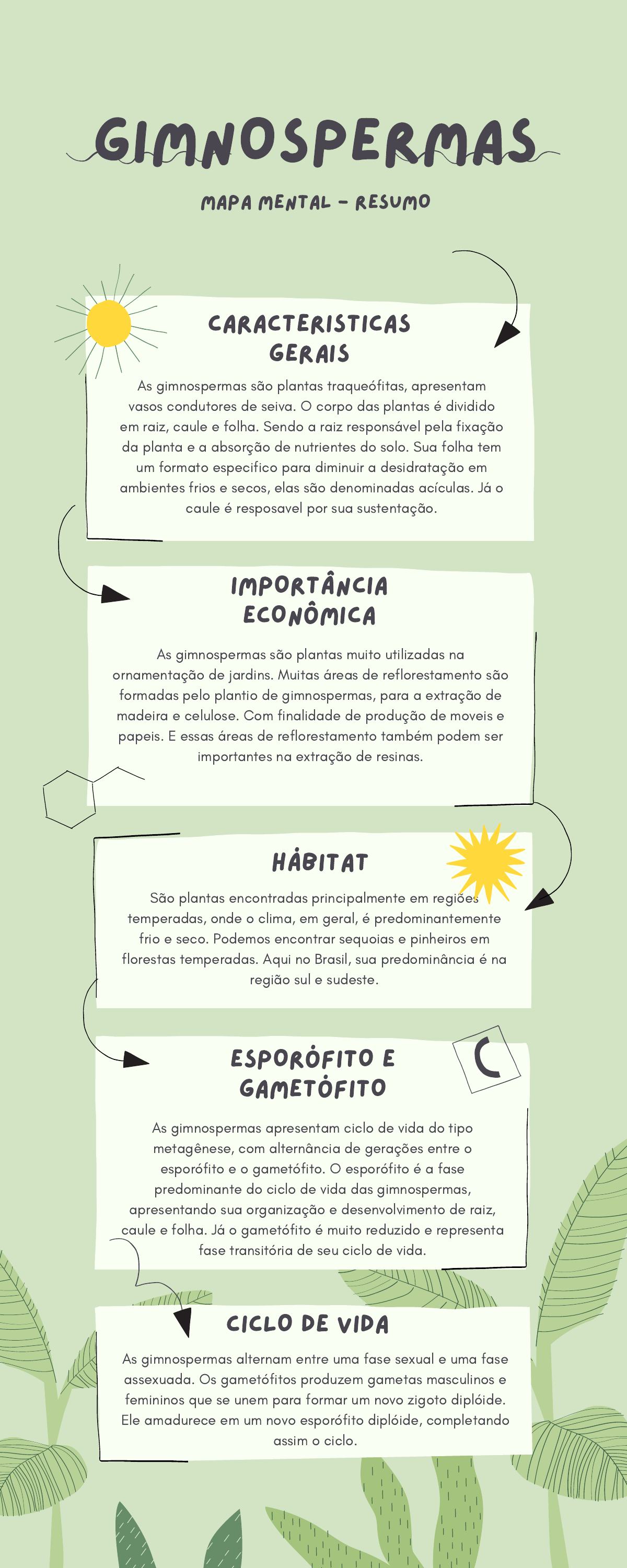 CICLO DE VIDA MAPA MENTAL - RESUMO GIMNOSPERMAS As gimnospermas alternam entre uma fase sexual e uma fase assexuada. Os gametófitos produzem gametas masculinos e femininos que se unem para formar um novo zigoto diplóide. Ele amadurece em um novo esporófito diplóide, completando assim o ciclo. São plantas encontradas principalmente em regiões temperadas, onde o clima, em geral, é predominantemente frio e seco. Podemos encontrar sequoias e pinheiros em florestas temperadas. Aqui no Brasil, sua predominância é na região sul e sudeste. HÁBITAT As gimnospermas são plantas traqueófitas, apresentam vasos condutores de seiva. O corpo das plantas é dividido em raiz, caule e folha. Sendo a raiz responsável pela fixação da planta e a absorção de nutrientes do solo. Sua folha tem um formato especifico para diminuir a desidratação em ambientes frios e secos, elas são denominadas acículas. Já o caule é resposavel por sua sustentação. CARACTERISTICAS GERAIS As gimnospermas são plantas muito utilizadas na ornamentação de jardins. Muitas áreas de reflorestamento são formadas pelo plantio de gimnospermas, para a extração de madeira e celulose. Com finalidade de produção de moveis e papeis. E essas áreas de reflorestamento também podem ser importantes na extração de resinas. IMPORTÂNCIA ECONÔMICA As gimnospermas apresentam ciclo de vida do tipo metagênese, com alternância de gerações entre o esporófito e o gametófito. O esporófito é a fase predominante do ciclo de vida das gimnospermas, apresentando sua organização e desenvolvimento de raiz, caule e folha. Já o gametófito é muito reduzido e representa fase transitória de seu ciclo de vida. ESPORÓFITO E GAMETÓFITO CICLO DE VIDA MAPA MENTAL - RESUMO ANGIOSPERMAS As angiospermas são as únicas plantas que ocupam praticamente todos os ecossistemas do planeta. Sendo o maior grupo de plantas existente, as angiospermas se caracterizam por possuírem a capacidade de produzir flores e frutos. São plantas vasculares, com sua classificação em constante mudança. Atualmente costuma-se classificar as angiospermas em monocotiledôneas, eudicotiledôneas, magnolídeas e um grupo com plantas denominado de “angiospermas basais”. CARACTERISTICAS GERAIS HÁBITAT PRINCIPAIS GRUPOS ESTRUTURA DA FLOR O grão de pólen é liberado na antera, ele possui uma célula vegetativa e uma célula geradora, a qual se divide e forma os dois gametas masculinos (núcleos espermáticos). A célula vegetativa será responsável pela formação do tubo polínico, que garantirá a transferência dos gametas até a parte feminina da flor. Grão de pólen, ao chegar no estigma da flor, germina e produz o tubo polínico, que cresce pelo estilete até chegar no ovário, penetra no óvulo pela micrópila (abertura do óvulo) e encontra o saco embrionário. Os dois gametas masculinos agirão na dupla fecundação. POLINIZAÇÃO https://brasilescola.uol.com.br/biologia/monocotiledoneas.htm