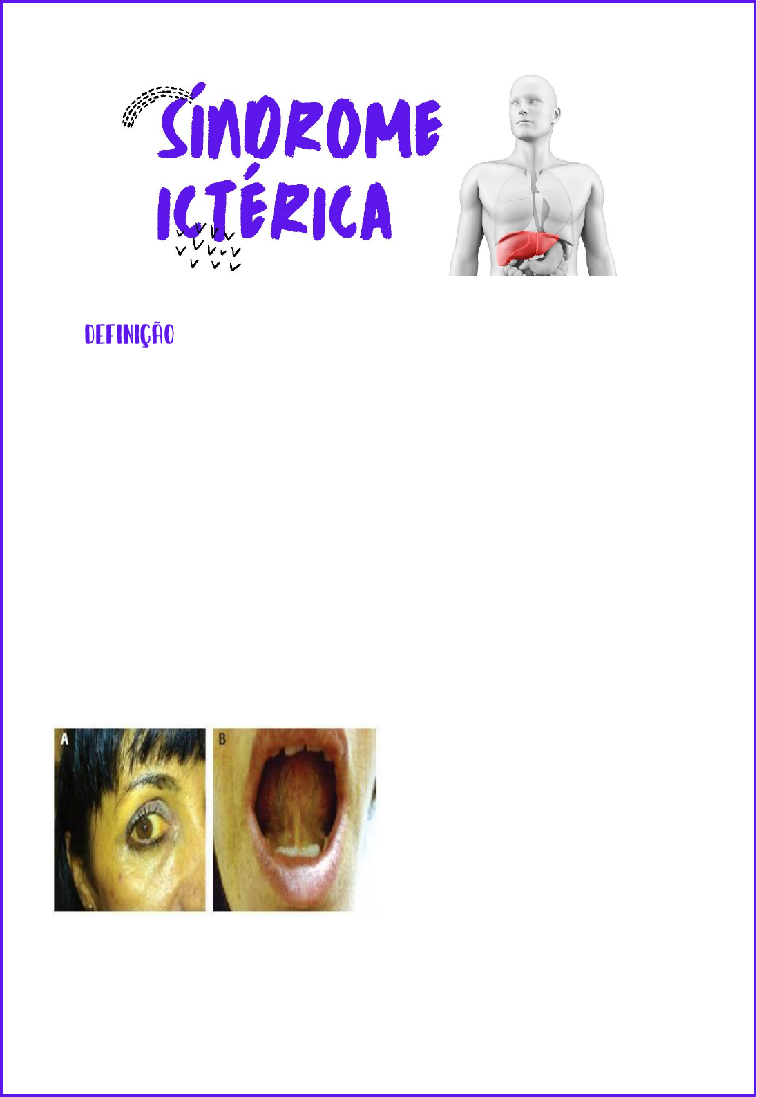 @Marcos André A icterícia é definida como o aparecimento de aspecto amarelado tanto na pele quanto nas mucosas, como regiões da esclera e frênulo da língua. A origem do aspecto amarelado característico da síndrome ictérica advém do aumento das bilirrubinas, sem necessariamente estar acompanhada de colestase, essa que é caracterizada pelo aumento das enzimas de ductos biliares (fosfatase alcalina e gama-GT). Bilirrubina sérica total: 0,2 a 1,2 mg/100ml. OBS: Fração conjugada: inferior a 15% - de 0 a 0,2 mg/100ml. Fração não conjugada: até 1 mg/100ml Fase inicial da icterícia: • Bilirrubina acima de 2 mg/100 ml • Ligação com a elastina (proteína presente no olho com afinidade com a bilirrubina) Icterícia- causas: • Hiperbilirrubinemia sérica: o Pré hepática – ex.: Distúrbios Hemolíticos (aumento de bilirrubina indireta), como a quebra de hemoglobina o Doenças Hepáticas o Pós hepática – ex.: Obstrução de vias biliares @Marcos André por tumor de cabeça de pâncreas Existe uma subdivisão das apresentações clínicas da síndrome ictérica: !) Icterícia flavínica, que consiste na presença icterícia com palidez, associada ao aumento da bilirrubina indireta, por meio da hemólise. 2) Icterícia verdínica, é caracterizada por um quadro de icterícia esverdeada, relacionada em geral a pacientes com colestase, decorrente do aumento da bilirrubina direta. 3) Icterícia rubínica, é aquela que cursa com vasodilatação, dado um quadro de aumento da bilirrubina direta por quadros de leptospirose e cirrose. As moléculas de hemoglobina são formadas por um grupo denominado heme, que é degradado inicialmente em biliverdina, a qual é transformada em bilirrubina insolúvel, e por isso, se liga à albumina para circular pelo sangue, sendo essa combinação a chamada bilirrubina indireta (ou não conjugada). No fígado, essa bilirrubina indireta é captada pelos hepatócitos, via difusão facilitada, e lá, por meio da enzima glucuronil-transferase, é transformada em bilirrubina direta, sendo excretada para a via biliar por meio de transporte celular dependente de ATP. No intestino, quando a bilirrubina é excretada junto à bile, as bactérias da flora intestinal a transformam em urobilinogênio, o qual pode seguir dois caminhos. Um deles consiste no segmento pelas fezes, culminando na formação de estercobilina, a qual dará a coloração marrom às fezes. Caso o urobilinogênio seja reabsorvida, será futuramente excretado pelos rins na forma de urobilina, a qual confere a coloração amarelada à urina. OBS: Justamente por meio desses mecanismos, nos casos de icterícia é comum observarmos a presença de urina escurecida, mas não somente alaranja da, mas com o aspecto “urina em coca- -cola”, quadro @Marcos André esse chamado de colúria, consequente do acúmulo de bilirrubina, que gera mais urobilina para ser excretada, levando ao escurecimento da urina. Diversas causas, cursam com o aumento de bilirrubina direta ou indireta, a depender do seu mecanismo: 1) O aumento da produção de bilirrubina cursa com o aumento da sua forma não conjugada e, de acordo com o que vimos, sendo produto da degradação do grupo heme, faz sentido que quadros assim ocorram quando da ocorrência de hemólise ou de eritropoiese ineficaz 2) A redução da captação também pode cursar com o aumento da bilirrubina indireta, uma vez que, se o fígado capta pouca bilirrubina não conjugada, essa ficará acumula da no sangue, levando à síndrome que é alvo do nosso estudo. Casos assim podem ocorrer quando da ocorrência de jejum prolonga do, pelo uso de medicações, infecções e por causas intrínsecas aos hepatócitos. 3) Outro mecanismo para o aumento da bilirrubina indireta consiste na diminuição da conjugação, uma vez que a não ocorrência desse processo cursa com o acúmulo da substância em sua forma não conjugada. Nesses casos, a etiologia se encontra na maquinaria celular dos hepatócitos, como ocorre nas síndromes de Gilbert e de Crigler-Najjar, bem como na deficiência adquirida. 4) Se houver alteração quanto à excreção, temos o aumento da bilirrubina direta, que pode ser decorrente de problemas celulares, na questão do transporte da substância via ATP, como ocorre nas síndromes de Dubin Johnson e de Rotor, ou por quadros de colestase, como a gestacional, medicamentosa ou a denominada colestase intra-hepática recorrente benigna. 5) A icterícia de origem obstrutiva consiste na dificuldade quanto à excreção de origem mecânica- obstrutiva, já que nesse caso o trajeto da bile se encontra interrompido, sendo que isso pode ocorrer tanto por tumores e estenose das vias biliares quanto pela presença de cálculos e por corpos estranhos. @Marcos André A bilirrubina direta é produzida no hepatócito e jogada no ducto biliar, qualquer alteração dentro dessas células, como por exemplo uma hepatite, pode causar uma alteração dessa dinâmica DA BILIRRUBINA O metabolismo se dá em três níveis sistêmicos: 1. Sistema retículo endotelial (SER) 2. Fígado 3. Intestino 1) SER Bilirrubina – produto de degradação do grupo heme, por destruição dos eritrócitos senescentes pelo SER (baço e medula) – 80 – 85% eritrócitos senis o Cerca de 70-80% da bilirrubina produzida diariamente é derivada da hemoglobina É degradado 250 a 300 mg/dia Fígado tem capacidade de conjugar até 3x a taxa diária (250 mg x 3) A bilirrubina não conjugada é lipossolúvel e extremamente tóxica. Alguns mecanismos fisiológicos protegem contra a toxicidade da bilirrubina, como a ligação à albumina plasmática, a rápida entrada da molécula no hepatócito, sua conjugação e seu clearance pelo fígado. Porém, quando sua concentração aumenta muito, principalmente em neonatos, começam a surgir evidências de danos no sistema nervoso central, como encefalopatia severa. A bilirrubina é gerada a partir da degradação do heme, sendo mediada por dois