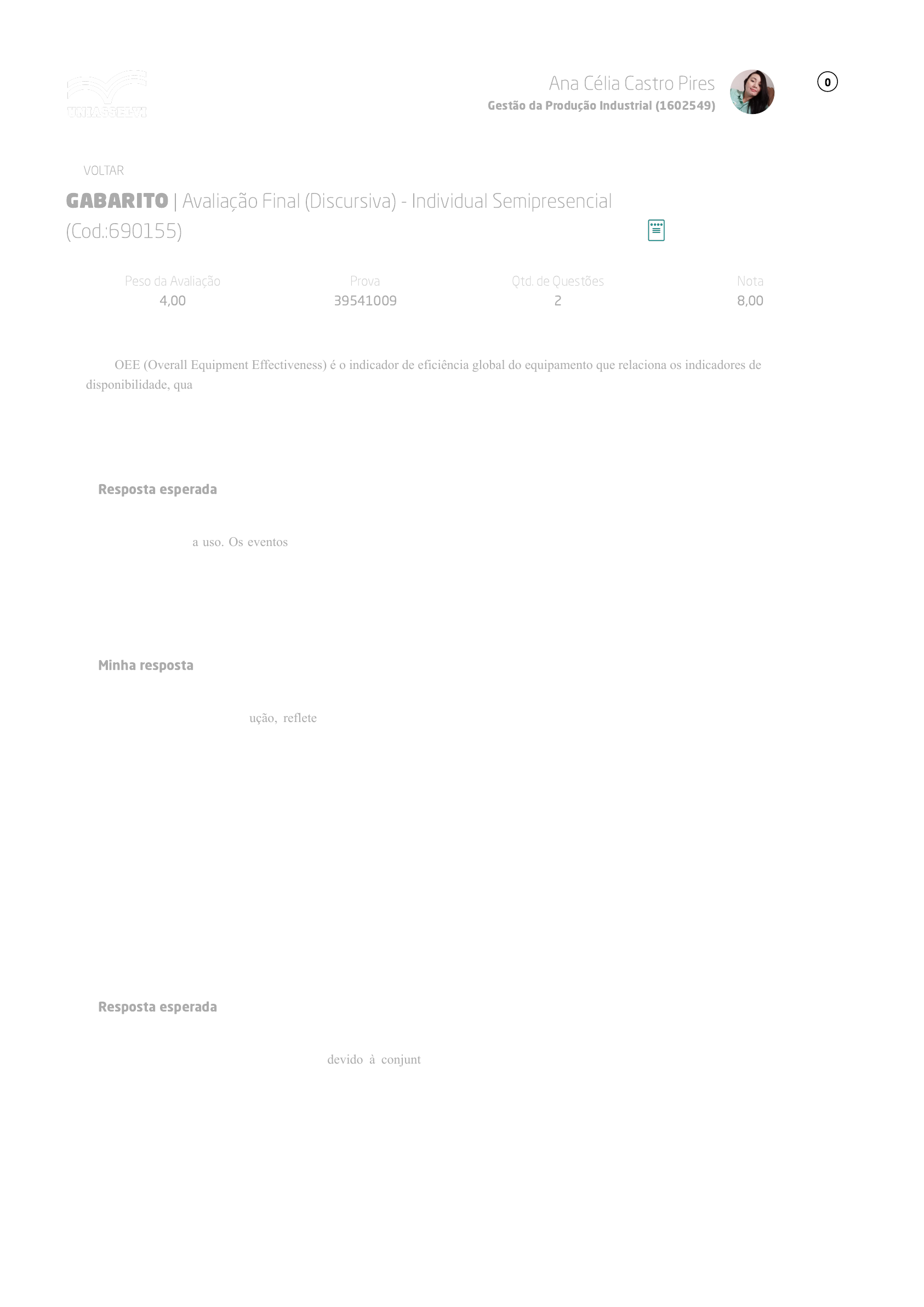 18/11/2021 09:14 AVA https://ava2.uniasselvi.com.br/subject/grades-and-tests/answer-book/eyJ0ZXN0Ijp7InRlc3RDb2RlIjoiNjkwMTU1IiwiZGVzY3JpcHRpb24iOiJBdmFsaWHDp8OjbyBGaW5hbCAoRGlzY3Vyc2l2YSkgLSBJbmRpdmlkdW… 1/2 GABARITO | Avaliação Final (Discursiva) - Individual Semipresencial (Cod.:690155) Peso da Avaliação 4,00 Prova 39541009 Qtd. de Questões 2 Nota 8,00 OEE (Overall Equipment Effectiveness) é o indicador de eficiência global do equipamento que relaciona os indicadores de disponibilidade, qualidade e performance. É uma metodologia muito utilizada para medir a eficiência operacional de um equipamento, linha de produção ou pode ainda ser utilizada para medir a eficiência global de uma empresa. A análise de eficiência de processos pode ser efetuada como a aplicação do OEE e a eficiência da planta industrial é categorizada de acordo com este resultado. Com base neste conceito, disserte sobre o indicador 'disponibilidade' utilizado nesta análise. Resposta esperada A disponibilidade reflete os eventos que causam a parada da linha de produção e impactam diretamente na disponibilidade dos equipamentos para uso. Os eventos mais comuns relatados neste indicador estão relacionados à quebra e falta de materiais ou matéria- prima. Estas ocorrências não esperadas e imprevisíveis são chamadas de Downtime e o tempo que sobra para execução de paradas planejadas e produção é o Tempo Operacional Programado. O indicador de disponibilidade contabiliza as paradas para manutenções programadas. Minha resposta O indicador de disponibilidade ou medida do desempenho de disponibilidade, é utilizado para gerenciar o tempo que os equipamentos estão disponíveis para produção, reflete os eventos que impactam diretamente e causam a parada da linha de produção, como por exemplo a quebra e falta de materiais ou matéria-prima. O indicador de disponibilidade tem como objetivo mensurar o tempo das paradas para manutenções programadas, que otimizam a confiabilidade e a disponibilidade dos equipamentos e ativos para a produção. Conforme Gurski (2002), podemos classificar a história da manutenção industrial em três eras: Primeira Geração - antes da Segunda Guerra Mundial, Segunda Geração - após a Segunda Guerra Mundial até os anos 1960, e Terceira Geração - após a década de 1970. Descreva sobre as três gerações. FONTE: GURSKI, Carlos Alberto. Noções De Confiabilidade e Manutenção Industrial. 2002. Disponível em: http://www.tecnicodepetroleo.ufpr.br/apostilas/petrobras/confiabilidade_e_manutencao.pdf. Acesso em: 28 dez. 2013. Resposta esperada Primeira Geração - antes da Segunda Guerra Mundial: indústria era pouco mecanizada, os equipamentos eram simples e, na sua maioria, superdimensionados. Aliado a tudo isto, devido à conjuntura econômica da época, a questão da produtividade não era prioritária. Consequentemente, não era necessária uma manutenção sistematizada; apenas serviços de limpeza, lubrificação e reparo após a quebra, ou seja, a manutenção era, fundamentalmente, corretiva. Segunda Geração - após a Segunda Guerra Mundial até os anos 1960: aumentaram a demanda por todo tipo de produtos, ao mesmo tempo em que o contingente de mão de obra industrial diminuiu sensivelmente. Como consequência, neste período, houve forte aumento da mecanização, bem como da complexidade das instalações industriais. Começa a se evidenciar a necessidade de mais disponibilidade, bem como maior confiabilidade: a indústria estava bastante dependente do bom funcionamento das máquinas. Terceira Geração - a paralisação da produção era uma preocupação generalizada, já que diminui a capacidade de produção, aumenta os custos e afeta a qualidade dos produtos. Na manufatura, os efeitos dos períodos de paralisação foram se agravando pela tendência mundial de utilizar sistemas just-in-time, em que estoques reduzidos para a produção em andamento significam que pequenas pausas na produção/entrega, naquele momento, poderiam paralisar a fábrica. O crescimento da automatização e da mecanização passou a indicar que confiabilidade e disponibilidade tornaram-se pontos-chave na Terceira Geração, VOLTAR A+ Alterar modo de visualização 1 2 Ana Célia Castro Pires Gestão da Produção Industrial (1602549) 0 18/11/2021 09:14 AVA https://ava2.uniasselvi.com.br/subject/grades-and-tests/answer-book/eyJ0ZXN0Ijp7InRlc3RDb2RlIjoiNjkwMTU1IiwiZGVzY3JpcHRpb24iOiJBdmFsaWHDp8OjbyBGaW5hbCAoRGlzY3Vyc2l2YSkgLSBJbmRpdmlkdW… 2/2 reforçou-se o conceito de uma manutenção preditiva. A interação entre as fases de implantação de um sistema (projeto, fabricação, instalação e manutenção) e a Disponibilidade/Confiabilidade torna-se mais evidente. Minha resposta Na primeira geração da manutenção industrial, somente alguns serviços simples de limpeza e lubrificação eram suficientes para garantir o funcionamento do equipamento, na época os recursos de manutenção eram poucos, não existia a manutenção preventiva. Nessa geração apenas as manutenções corretivas eram consideradas. A segunda geração, este foi um período de expansão das indústrias, onde se tornaram mais mecanizadas, com um fluxo maior na produção devido o aumento da demanda de produtos, e com isso veio o aumentam das falhas nos equipamentos, foi ai então que começaram a entender o conceito de manutenção preventiva, que as falhas não poderiam se tornar tão comuns e que de tempos em tempos as manutenções deveriam ser realizadas dentro de um espaço de tempo, garantindo assim a disponibilidade dos equipamentos. A terceira geração é marcada pela automação e mecanização dos equipamentos, que se tornam cada vez mais comuns dentro das indústrias, introduzindo novos conceitos como confiabilidade e disponibilidade, juntamente com uma nova forma de se fazer manutenção, chamada de preditiva. A manutenção preditiva prever o tempo de vida útil dos componentes 