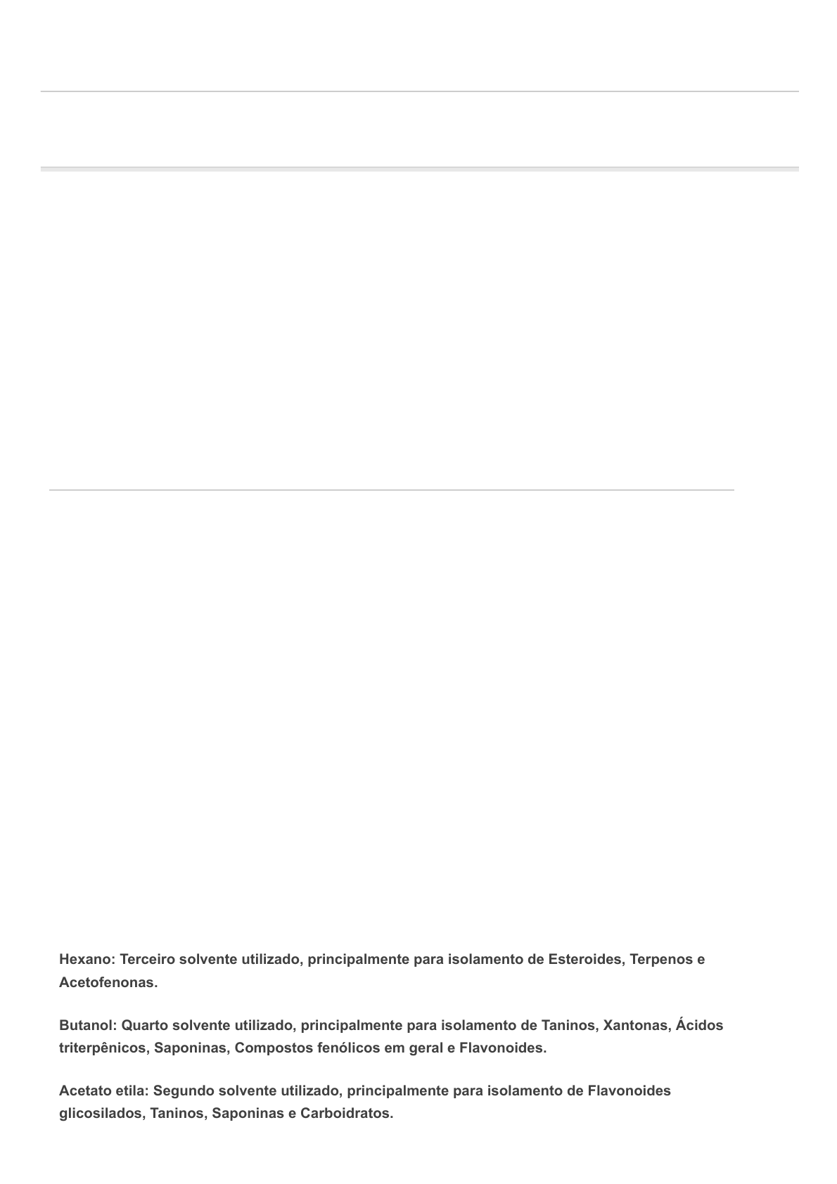 08/11/2021 08:46 Comentários https://sereduc.blackboard.com/ultra/courses/_74262_1/outline/assessment/_4395301_1/overview/attempt/_15456665_1/review/inline-feedback?… 1/8 Conteúdo do exercício Ocultar opções de resposta Avaliação On-Line 1 (AOL 1) - Questionário Ivana Roberta Gomes Alves de Souza Gal… Pergunta 1 -- /1 Se o extrato bruto apresentar algum efeito biológico de interesse terapêutico, é recomendado prosseguir com uma extração mais específica (partição líquido-líquido), usando solventes orgânicos mais adequados e com polaridades crescentes. Das alternativas abaixo, qual a alternativa está CORRETA, a respeito dos solventes orgânicos (extração líquido-líquido) para o isolamento específico de alguns metabólitos secundários presentes em plantas: Resposta correta Diclometano: Segundo solvente utilizado, principalmente para isolamento de Lignanas, Flavonoides metoxilados, Sesquiterpenos, Lacionas, Triterpenos e Cumarinas. Hexano: Terceiro solvente utilizado, principalmente para isolamento de Esteroides, Terpenos e Acetofenonas. Butanol: Quarto solvente utilizado, principalmente para isolamento de Taninos, Xantonas, Ácidos triterpênicos, Saponinas, Compostos fenólicos em geral e Flavonoides. Acetato etila: Segundo solvente utilizado, principalmente para isolamento de Flavonoides glicosilados, Taninos, Saponinas e Carboidratos. 10/10 Nota final Enviado: 08/11/21 08:45 (BRT) 08/11/2021 08:46 Comentários https://sereduc.blackboard.com/ultra/courses/_74262_1/outline/assessment/_4395301_1/overview/attempt/_15456665_1/review/inline-feedback?… 2/8 Ocultar opções de resposta Hexano: Primeiro solvente utilizado, principalmente para isolamento de Lignanas, Flavonoides metoxilados, Sesquiterpenos, Lacionas, Triterpenos e Cumarinas. Pergunta 2 -- /1 A obtenção de drogas requer o emprego de métodos de extração, que consistem na dissolução do material vegetal em um solvente orgânico ou em uma mistura de solventes (etanol, acetona, etc.), para a retirada de alguns constituintes químicos de interesse terapêutico. Sobre esses métodos, assinale a alternativa CORRETA: O processo de extração independe do grau de fracionamento de vegetais, porque se podem escolher solventes de polaridade crescente. Decocção é sinônimo de infusão, porque ambas consistem na extração pela permanência do vegetal em água fervente. A extração sob refluxo consiste em submeter o material vegetal imerso em solvente fervente, que vai sendo adicionado ao sistema. A extração exaustiva pode ser obtida por maceração, bastando para isso aumentar o tempo de imersão do vegetal no líquido extrator. Resposta correta A turbolização consiste em proceder à extração concomitante com a redução de tamanho das partículas vegetais. Pergunta 3 -- /1 De acordo com as principais reações químicas, utilizadas para identificar constituintes bioativos de plantas medicinais, avalie as afirmativas de I a IV a seguir: I. Reações específicas de Alcaloides: Mayer, Dragendorff, Wagner e Bertrand; II. Reações específicas de Triterpenos Esteroides: Lieberman-Buchard; 08/11/2021 08:46 Comentários https://sereduc.blackboard.com/ultra/courses/_74262_1/outline/assessment/_4395301_1/overview/attempt/_15456665_1/review/inline-feedback?… 3/8 Ocultar opções de resposta Ocultar opções de resposta III. Reações específicas de Glicosídeos Heterocíclicos: Shinoda;IV. Reações específicas de Taninos: Murexida. Assinale a alternativa correta: As afirmativas I, II e IV estão CORRETAS. As afirmativas II, III e IV estão CORRETAS. Resposta corretaAs afirmativas I e II estão CORRETAS. As afirmativas III e IV estão CORRETAS. Todas as afirmativas estão CORRETAS. Pergunta 4 -- /1 Ensaios cromatográficos têm por objetivo o isolamento de um metabólito específico (processo preparativo) ou verificar a presença e o teor deste composto em um determinado extrato (processo analítico). Acerca de técnicas cromatográficas, assinale a opção CORRETA: Na cromatografia gasosa, a fase estacionária é sólida e a fase móvel é um gás inerte. Resposta correta Na técnica de cromatografia em camada delgada (CCD) é a técnica mais indicada para caracterizar qualitativamente a presença de um determinado grupo de constituintes bioativos. A diferença de peso molecular dos componentes de uma mistura é o que permite a separação desses componentes por cromatografia. A cromatografia líquida de alta eficiência tem alto poder de resolução devido ao tamanho da coluna cromatográfica utilizada, que pode atingir até 1m de comprimento. É impossível utilizar a cromatografia gasosa para a investigação de substâncias voláteis. 08/11/2021 08:46 Comentários https://sereduc.blackboard.com/ultra/courses/_74262_1/outline/assessment/_4395301_1/overview/attempt/_15456665_1/review/inline-feedback?… 4/8 Ocultar opções de resposta Pergunta 5 -- /1 Após a correta coleta do material vegetal de interesse, é possível iniciar os processos de tratamento, que têm como finalidade torná-lo adequado para a produção do medicamento fitoterápico desejado. De acordo com os processos preliminares de tratamento, assinale as afirmativas CORRETAS: I- Informações sensoriais (coloração, forma, textura e odor) do material vegetal, não ajudam a fortalecer a sua correta identificação; II- No caso de material de origem vegetal, é recomendado retirar partes da planta que não possuam a substância química desejada, evitando, assim, a presença de impurezas na matéria-prima final; III- Uperização: emprega-se o calor (seco ou úmido) por meio de vapor de água ou etanol, sob pressão normal ou elevada, promovendo a perda de água e a desnaturação proteica, o que inviabiliza a crescimento microbiano e a atividade de enzimas; IV- Em alguns casos, a fragmentação deve ser feita sob refrigeração (criomoagem) para se evitar a destruição térmica, química ou física dos seus componentes. II e III.