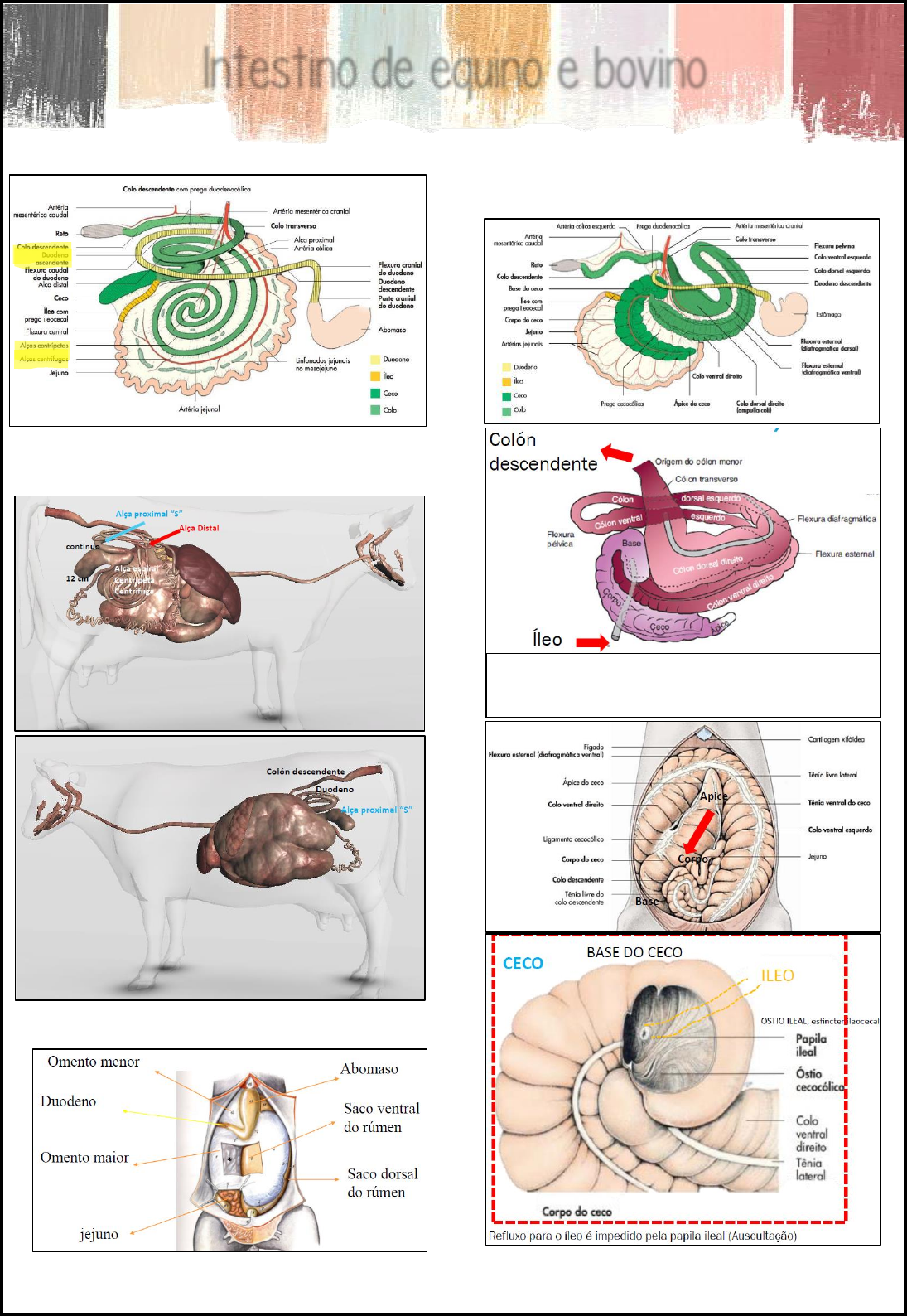 Intestino bovino No colo ascendente dos bovinos e suínos, ele se apresenta em espiral. Antes da alça central está o giro centrípeto (fora para dentro) e posterior é giro centrífugo (dentro para fora). Topografia das vísceras abdominais em bovinos Intestino de equinos O cólon maior e menor possui contrações de segmentação relativamente forte. Intestino de equino e bovino Devido à diferença considerável de diâmetro, as duas primeiras partes também são chamadas de “cólon maior”, e a terceira, de “colo menor” (cólon descendente) Tênias São camadas longitudinais externas das túnicas musculares, contendo numerosas fibras elásticas. A maior parte do ceco possui 4 faixas que diminuem em direção ao ápice. O cólon ventral direito, flexura esternal e cólon ventral esquerdo possuem 4 faixas. A flexura pélvica e o cólon dorsal esquerdo possuem 1 faixa. A flexura diafragmática e o cólon dorsal direito possuem 3 faixas. O cólon descendente possui 2 faixas. O forame epiploicos situa-se entre o processo caudado do fígado e o duodeno e o lobo direito do pâncreas, entre a veia cava caudal dorsalmente e a veia porta ventralmente.