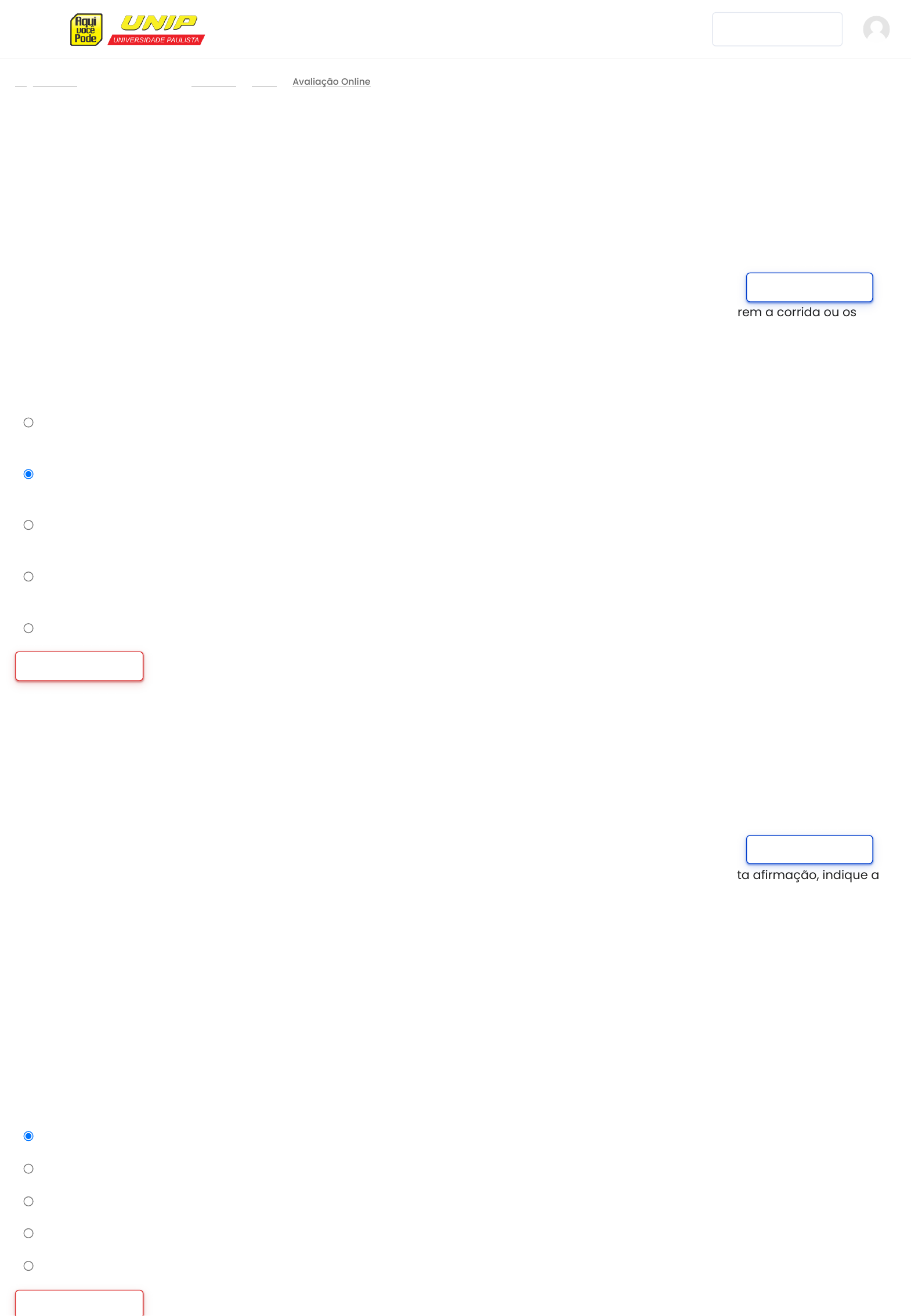 - Minhas disciplinas - - - Bibliotecas Virtuais Página inicial S6-B0247 Geral Avaliação Online Quando um grupo de crianças está explorando os movimentos do próprio corpo em parques, é bastante provável usarem a corrida ou os saltos como forma de locomoção em suas brincadeiras. Imagine uma criança correndo para se afastar de outra criança na brincadeira de pega-pega e ao se deparar com um banco do parque em sua frente ela executa um salto para subir e transpor este banco. Com base nos movimentos de corrida e salto, assinale a alternativa correta. Escolha uma opção: a. A aterrissagem do salto com um único pé gera menos impacto do que a aterrissagem com os dois pés, então, as articulações do membro inferior do único pé que suporta a força não realizam muita flexão. b. Para o corpo ser acelerado para cima no salto, uma das articulações que se precisa estender é o joelho e, para isto, o complexo do quadríceps é acionado. c. Para o corpo ser acelerado para frente na corrida, uma das articulações que precisa realizar o movimento de extensão é o tornozelo e, para isto, o complexo iliopsoas é acionado. d. No salto, a realização da fase aérea depende da extensão das articulações do tornozelo, joelho e quadril e estes movimentos ocorrem no plano frontal. e. Na corrida, os movimentos mais visíveis das articulações do tornozelo, joelho e quadril ocorrem no plano frontal. Limpar minha escolha Em um movimento, vários músculos são acionados, cada qual para produzir uma determinada função. Com base nesta afirmação, indique a alternativa correta. I. No movimento de agachamento, os músculos do membro inferior são acionados na flexão das articulações do tornozelo, joelho e quadril, eles trabalham como agonistas, ação excêntrica, controlando a aceleração do corpo para baixo. II. No movimento de abdominal com o sujeito deitado em decúbito dorsal e elevando totalmente a coluna vertebral do solo, os músculos agonistas são os flexores de quadril (complexo iliopsoas) e os músculos flexores de coluna são os estabilizadores no exercício. III. No movimento de flexão de cotovelo, o músculo bíceps braquial poderá flexionar o cotovelo e o ombro ao mesmo tempo no instante que é acionado para encurtar por ser biarticular. Para o ombro não se movimentar, haverá um músculo neutralizador, que inibirá a ação do bíceps braquial no ombro e permitirá sua ação somente no cotovelo. IV. Na fase de propulsão do salto, os músculos do membro inferior são acionados para estender as articulações do tornozelo, joelho e quadril, eles trabalham como agonistas, ação concêntrica, para aceleração do corpo para cima. Escolha uma opção: a. As afirmações I, II, III e IV estão corretas. b. As afirmações I e IV estão corretas. c. As afirmações I, III e IV estão corretas. d. As afirmações III e IV estão corretas. e. As afirmações II, III e IV estão corretas. Limpar minha escolha Remover marcação Questão 1 Ainda não respondida Vale 1,00 ponto(s). Remover marcação Questão 2 Ainda não respondida Vale 1,00 ponto(s). http://www.unipvirtual.com.br/avaunip http://www.unipvirtual.com.br/avaunip/ http://www.unipvirtual.com.br/avaunip/course/view.php?id=2309 http://www.unipvirtual.com.br/avaunip/course/view.php?id=2309#section-0 http://www.unipvirtual.com.br/avaunip/mod/quiz/view.php?id=74585 http://www.unipvirtual.com.br/avaunip/mod/quiz/attempt.php?attempt=4367181&cmid=74585 http://www.unipvirtual.com.br/avaunip/mod/quiz/attempt.php?attempt=4367181&cmid=74585 A arquitetura do músculo é um fator importante para entender sua vocação quanto à produção de força ou de velocidade em um gesto motor. Em acordo com o comprimento e angulação da fibra em relação ao eixo longitudinal do músculo, pode-se ter um músculo mais veloz ou mais forte. Sabendo disso, assinale a alternativa correta. I. Um músculo com miofibrilas compridas possui muitos sarcômeros em série. Ao receber um estímulo elétrico do neurônio motor que o estimula, verifica-se seu encurtamento imediato. Esta é uma característica dos músculos fusiformes. II. Um músculo com miofibrilas curtas e anguladas em relação ao seu eixo longitudinal tem muitos sarcômeros em paralelo. Estas são características do músculo peniforme. III. Um exemplo de músculo peniforme é o gastrocnêmio, importante propulsor do aparelho locomotor. Escolha uma opção: a. As alternativas I, II e III estão corretas. b. As alternativas I e III estão corretas. c. As alternativas I e II estão corretas. d. As alternativas II e III estão corretas. e. A alternativa I está correta. Limpar minha escolha Uma criança, ao caminhar na quadra de esporte, começou a perceber que ora seu pé encostava no solo e ora o mesmo pé ficava no ar, e que aquele movimento permitia sua progressão para a frente. Curiosa para entender a mecânica do movimento da marcha, ela questionou sobre as fases desse movimento. Quais afirmações a seguir correspondem à resposta correta? I. Quando iniciamos o movimento da marcha o calcanhar entra em contato com o solo dando início à fase de apoio. Esta fase termina com a retirada dos dedos do pé do solo, após a transferência de peso do calcanhar para o antepé. II. Em uma parte do ciclo da marcha, o pé perde o contato com o solo, o que permite a troca do apoio de uma perna para outra, esta é a fase de duplo apoio na marcha. III. No final da fase de apoio de um pé e início da fase de apoio do outro pé ocorre a fase de balanço da marcha, por ser o instante em que os dois pés estão em contato com o solo. IV. O ciclo da marcha ocorre quando um dos pés realiza a fase de apoio e em seguida a fase de balanço. Para um sujeito saudável, a proporção de tempo da fase de apoio e de balanço para concluir o ciclo da marcha é de 60% e 40%, respectivamente. Escolha uma opção: a. As afirmações II e III estão corretas.. b. As afirmações II e IV estão corretas. 