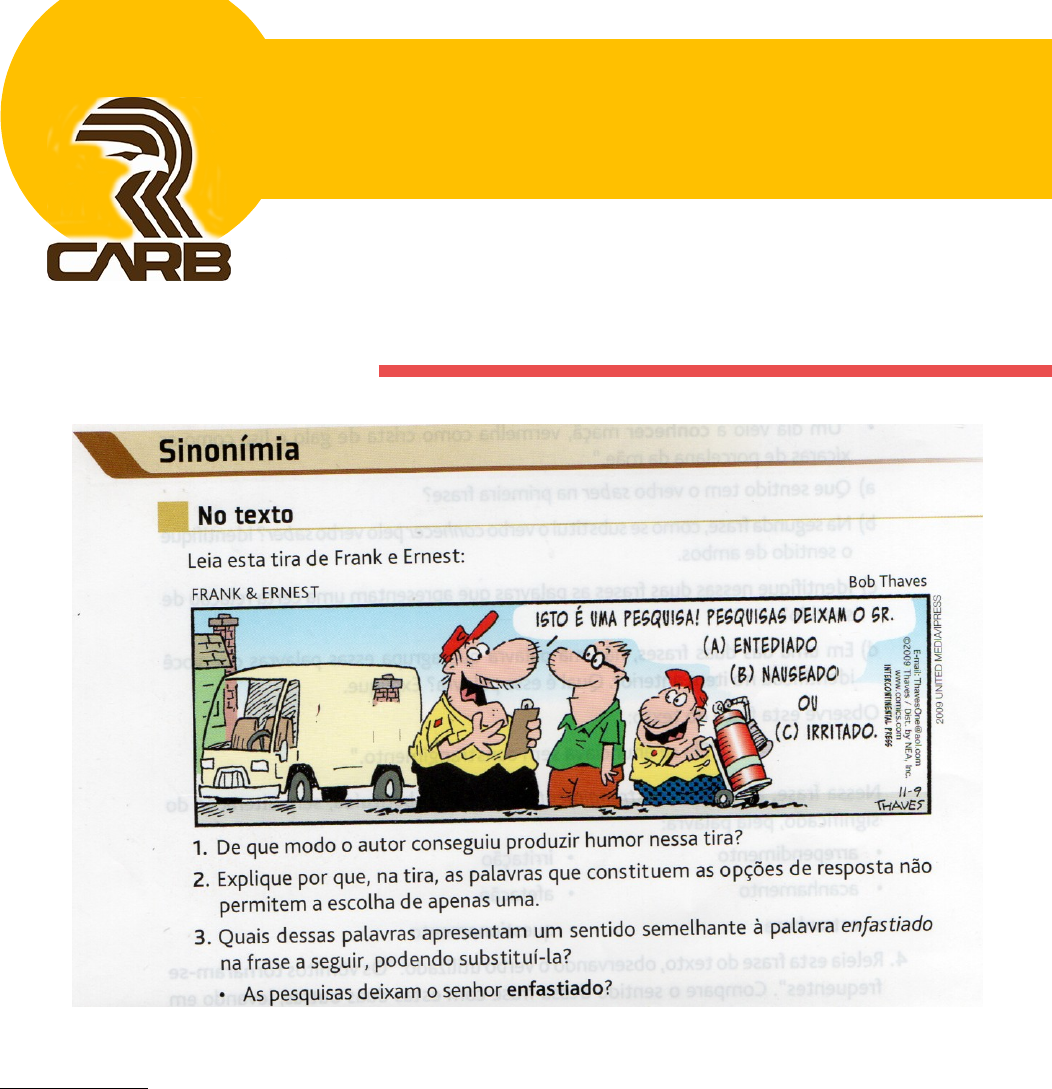 LÍNGUA PORTUGUESA PROFESSORa adriana azambuya nome: ________________________________ DATa: ___ / ___ SEMÂNTICA RESPOSTAS a) ___________________________________________________________________________________________________________________________________________________________________________________________________________________________ b) ___________________________________________________________________________________________________________________________________________________________________________________________________________________________ c) ___________________________________________________________________________________________________________________________________________________________________________________________________________________________ RESPOSTAS 1. __________________________________________________________________________________________________________________________________________________________________________________________________________________ 2. __________________________________________________________________________________________________________________________________________________________________________________________________________________ RESPOSTAS a) ___________________________________________________________________________________________________________________________________________________________________________________________________________________________ b) ___________________________________________________________________________________________________________________________________________________________________________________________________________________________ c) ___________________________________________________________________________________________________________________________________________________________________________________________________________________________ RESPOSTAS a) ___________________________________________________________________________________________________________________________________________________________________________________________________________________________ b) ___________________________________________________________________________________________________________________________________________________________________________________________________________________________ c) ___________________________________________________________________________________________________________________________________________________________________________________________________________________________ a) Observe o último quadrinho. Que hiperônimo a personagem adulta usa para se referir aos itens daquela refeição? R. __________________________________________________________________________________________________________________________________________________________ b) O hiperônimo empregado pela personagem adulta expressa um juízo de valor. Qual? R. __________________________________________________________________________________________________________________________________________________________ c) Que outros hiperônimos ela poderia utilizar para não revelar esse ponto de vista? R. ____________________________________________________________________________ d) Que hiperônimo a menina usa para se referir a "uma lagartixa"? Esse hiperônimo poderia ser usado para retomar "a mais cara e melhor ração do mercado"? Explique. R. __________________________________________________________________________________________________________________________________________________________ Leia o texto introdutório do médico e escritor Drauzio Varella para uma entrevista produzida para seu site a respeito de gripes e resfriados. Gripes e resfriados Na cultura brasileira, qualquer espirro é sinônimo de gripe. A pessoa abre a geladeira, espirra porque entrou em contato com o ar frio e imediatamente se considera gripada. Essa banalização do que é a gripe tem inconveniente sério, pois não se trata de uma doença com a benignidade que a maioria imagina. Em crianças, pessoas idosas ou imunodeprimidas, pode ser uma moléstia grave e até causar a morte. Gripe e resfriados são doenças virais e vão muito além de um simples espirro. Embora os sintomas sejam semelhantes, os da gripe são bem mais intensos. Há até uma regra prática para distinguir uma enfermidade da outra. Se a pessoa foi trabalhar apesar do nariz escorrendo, do peso na cabeça e da irritação na garganta, não está com gripe, está resfriada. A gripe derruba a pessoa, deixa-a de cama, sem a menor condição de sair de casa e trabalhar. [...] Gripes e resfriados. Entrevista com o médico João Silva de Mendonça. QUESTÕES 1. O que o dr. Drauzio Varella explica ao dizer que, para os brasileiros, "qualquer espirro é sinônimo de gripe"? R. ________________________________________________________________________________________________________________________________________________ 2. Do ponto de vista da língua, as palavras espirro e gripe não poderiam ser consideradas sinônimas. Por quê? R. ________________________________________________________________________________________________________________________________________________ 3. Que substantivos foram usados ao longo do texto para retomar a palavra gripe? R. ________________________________________________________________________________________________________________________________________________ 4. Em relação a gripe, as palavras anotadas no item c são hiperônimos ou hipônimos? R. ________________________________________________________________________________________________________________________________________________ 5. No segundo parágrafo, quais palavras podem ser consideradas sinônimas? R. ________________________________________________________________________________________________________________________________________________ 6. Qual é a vantagem de não usar sempre a mesma palav