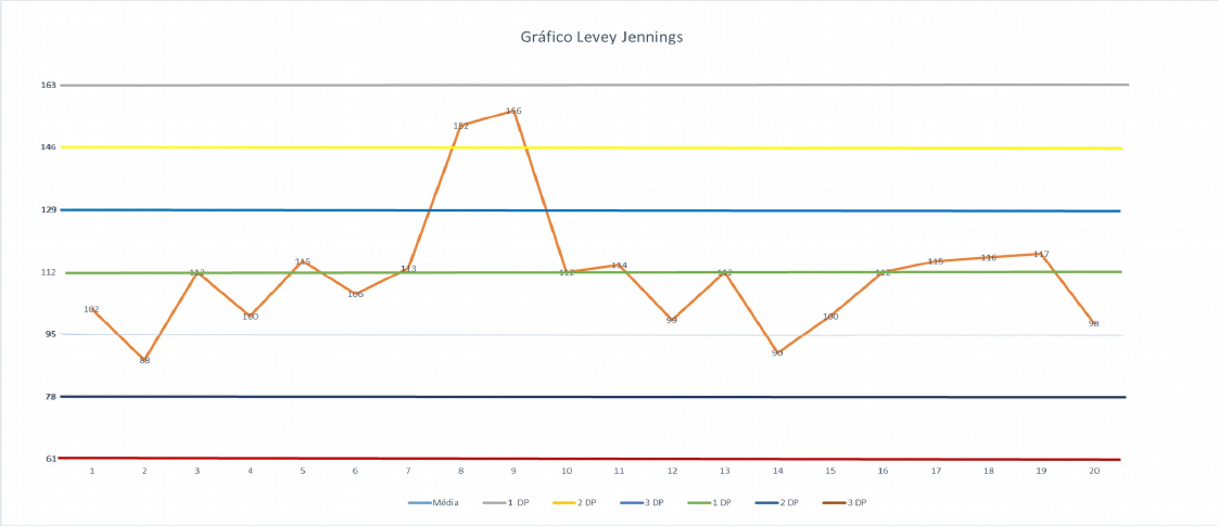 UNIG- Universidade Iguaçu Alunos: Thalia Reis, Luan Sarmento, Igor Turino Professor: Fabiano Lacerda. FARMÁCIA- Noite 8° Trabalho bioquímica a) Elabore o gráfico de controle de Levey Jennings. B) Os resultados indicam a rejeição ou aprovação da corrida analítica em questão? Citar as Regras de Westgard violadas em caso de rejeição. R - Indicação rejeição, 2:2s: Regra de Rejeição. A regra é inicialmente aplicada em uma mesma batelada para os valores de 2 controles (2 níveis). Os resultados não são liberados quando os valores de 2 controles excedem os limites de + 2s ou – 2s, no mesmo dia. A violação indica um erro sistemático. 1:3s: Regra de Rejeição. Significa que os resultados devem ser rejeitados porque o valor de um dos controles excede o limite de Xm ± 3s. A violação dessa regra indica um aumento do erro aleatório, mas pode significar eventualmente um erro sistemático de grandes dimensões. R:4s: Regra de Rejeição. Os valores obtidos devem ser rejeitados quando a diferença entre os dados dos 2 controles é maior que 4s, sendo aplicável somente quando há 2 níveis numa mesma corrida instalados. É indicadora da ocorrência de erros aleatórios. 4:1s: Regra de Rejeição. Os resultados devem ser rejeitados quando 4 valores consecutivos de um controle excedem os mesmos limites ou seja Xm +1s ou Xm 1s. Essas observações requerem análise por 4 dias consecutivos, ou em 2 níveis. A violação indica um erro sistemático. 7x: Regra de Rejeição. Esta regra é violada quando os valores do controle estão no mesmo lado da média em 7 dias consecutivos, não sendo necessário que os limites de +-2s ou +-3s sejam ultrapassados. Esta regra é indicadora da ocorrência de um erro sistemático. 7T: Regra de Rejeição. Esta regra é violada quando os valores do controle em 7 dias consecutivos mostram uma tendência crescente ou decrescente, não sendo necessário que os limites de +-2s ou +- 3s sejam ultrapassados. A violação indica incidência de erro sistemático. 10X: Regra de Rejeição. Os resultados não podem ser liberados quando os valores do controle estão no mesmo lado da média em 10 dias consecutivos. Essas observações podem ocorrer para o valor de um controle ou para os 2 controles, significando a observação de 10 ou 5 dias respectivamente.