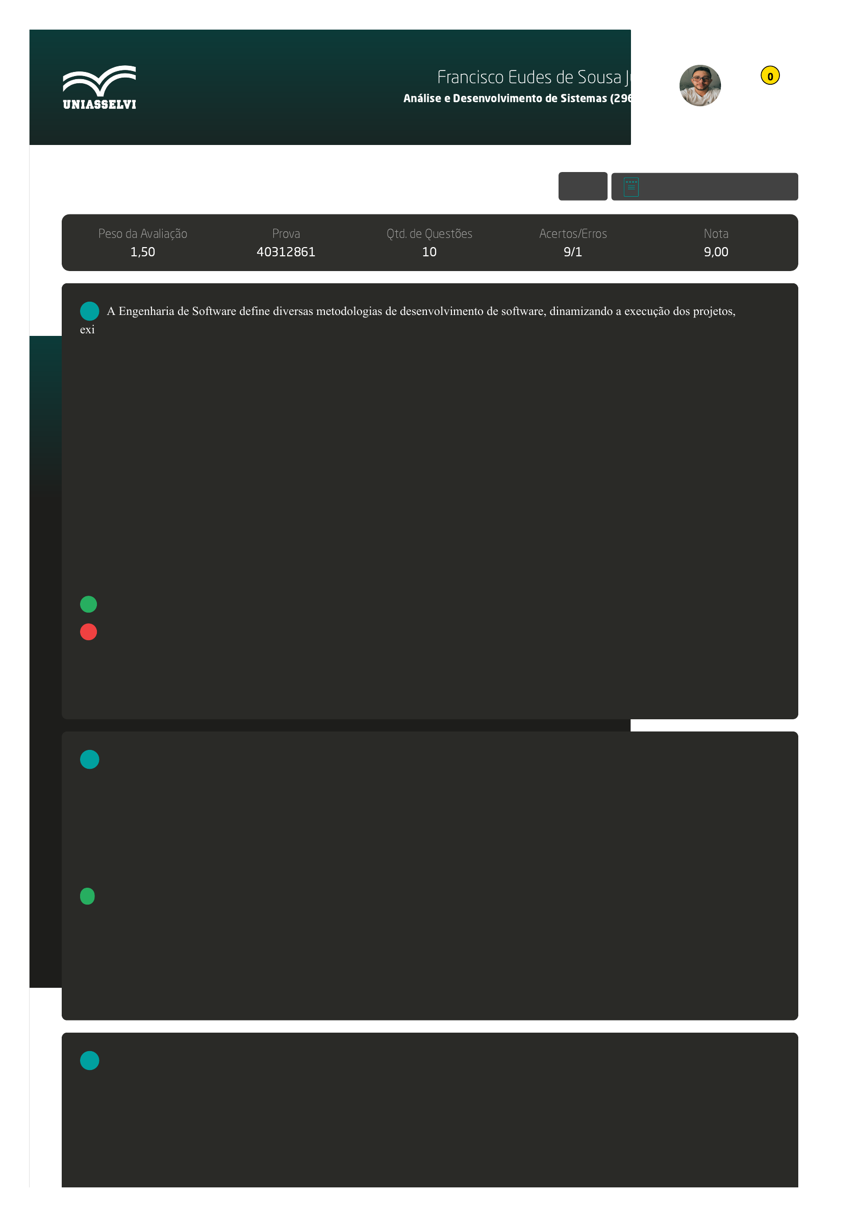25/11/21, 18:14 AVA https://ava2.uniasselvi.com.br/subject/grades-and-tests/answer-book/eyJ0ZXN0Ijp7InRlc3RDb2RlIjoiNjg5NjE4IiwiZGVzY3JpcHRpb24iOiJBdmFsaWHDp8OjbyBJIC0gSW5kaXZpZHVhbCIsInBhcmFtZXRlciI6NTQ1LC… 1/4 GABARITO | Avaliação I - Individual (Cod.:689618) Peso da Avaliação 1,50 Prova 40312861 Qtd. de Questões 10 Acertos/Erros 9/1 Nota 9,00 A Engenharia de Software define diversas metodologias de desenvolvimento de software, dinamizando a execução dos projetos, exigindo, desde a definição do escopo, análise, desenvolvimento e até sua implantação, maior experiência dos envolvidos para atingir maior produtividade e qualidade. A respeito das etapas de análise e especificação de requisitos, implementação, operação e manutenção do projeto, classifique V para as sentenças verdadeiras e F para as falsas: ( ) Análise e especificação de requisitos: compreende a etapa do levantamento das necessidades do cliente, identifica os problemas e definição da documentação dos requisitos, detalhando os resultados esperados da aplicação a ser desenvolvida. ( ) Implementação: é a etapa que se materializa o projeto na construção do seu código-fonte, etapa que busca criar o que foi definido no planejamento, especificação de requisitos e arquitetura do projeto. ( ) Operação: assim que o projeto for liberado ao cliente esta é a fase de acompanhamento de uso do software, aferindo a estabilidade da aplicação. ( ) Manutenção: esta etapa irá garantir o funcionamento correto do software através de testes integrados no sistema, a fim de verificar se está correto ao especificado. Assinale a alternativa que apresenta a sequência CORRETA: A V - V - V - F. B V - V - F - V. C V - V - F - F. D V - F - F - V. Em uma organização, o desenvolvimento do modelo de negócio é realizado por equipes diferentes das equipes que desenvolvem a modelagem de software. O modelo de negócio serve de suporte para o projeto do software, cujos detalhes técnicos do modelo de software não estarão contemplados ou detalhados no modelo de negócio. Para auxiliar no desenvolvimento destes modelos, pode-se utilizar a técnica i, proposta por Eric Yu, que define quem executará os processos, as diferentes formas para executá-los e quem deverá receber as informações. Esta técnica utiliza-se do Modelo de Dependência Estratégica (SD) e do Modelo de Razão Estratégica (SR). Sobre a definição do Modelo de Dependência Estratégica (SD), assinale a alternativa CORRETA: A Fornece uma definição intencional de um processo com relação a uma rede de relacionamento de dependência entre atores que executarão estes processos. B Fornece um guia de uso e razões de validação dos processos organizacionais. C Fornece uma definição do processo de integração entre os recursos tecnológicos e os recursos humanos de um projeto. D Fornece uma descrição dos elementos do projeto e instruções para a utilização dos processos. Cada organização possui missão, objetivos e processos próprios e é importante dar atenção à modelagem desses itens. A modelagem organizacional pode ser compreendida como um processo através do qual é possibilitada a formação da estrutura organizacional. Levando-se em conta que nenhuma estratégia pode ser seguida sem uma estrutura que a suporte, o processo de modelagem desempenha, então, um papel fundamental dentro de qualquer organização, seja ela de pequeno, médio ou grande porte. Referente à abordagem da Modelagem Organizacional definida por Alencar (1999), analise as sentenças a seguir: I- Oferece maior habilitação de respostas e questionamentos para tarefas da cadeia de fornecimento que não estão explicitamente VOLTAR A+ Alterar modo de visualização 1 2 3 Francisco Eudes de Sousa Júnior Análise e Desenvolvimento de Sistemas (2961044) 0 25/11/21, 18:14 AVA https://ava2.uniasselvi.com.br/subject/grades-and-tests/answer-book/eyJ0ZXN0Ijp7InRlc3RDb2RlIjoiNjg5NjE4IiwiZGVzY3JpcHRpb24iOiJBdmFsaWHDp8OjbyBJIC0gSW5kaXZpZHVhbCIsInBhcmFtZXRlciI6NTQ1LC… 2/4 representados no modelo. II- Permite visualizar o modelo de forma fácil, correta e intuitiva. III- Permite reutilizar os ativos internos da organização e obter controle centralizado da cadeia de fornecimento de informação e conhecimento. IV- Oferece maior habilidade para compartilhamento das informações e conhecimentos da organização, sem reúso destes recursos. Assinale a alternativa CORRETA: ALENCAR, F. M. R. Mapeando a modelagem organizacional em especificações precisas. 1999. 304 f. Tese (Doutorado) - Centro de Informática, Universidade Federal de Pernambuco, Recife, 1999. A As sentenças I, III e IV estão corretas. B As sentenças I, II e IV estão corretas. C As sentenças III e IV estão corretas. D As sentenças I e II estão corretas. O modelo sequencial, conhecido também como cascata, corresponde à principal metodologia tradicional de desenvolvimento de software. Neste modelo, há a necessidade de que o software seja todo planejado e documentado antes de sua implementação. Acerca do modelo sequencial de desenvolvimento de software, assinale a alternativa CORRETA: A Traz, como uma de suas fases, a análise de riscos. B O custo de manutenção do software é inferior aos outros modelos. C Divide-se em fases, sendo que a próxima fase somente inicia com o término da anterior. D A fase de Design sempre exige a criação de um protótipo. A busca pela qualidade e produtividade no desenvolvimento de software fez com que a cultura das organizações mudasse suas maneiras de trabalho de forma que a melhoria contínua fizesse parte dos seus objetivos estratégicos. O mercado consumidor de hoje vive mudanças muito rápidas em vários aspectos, como mais exigência, mais competitividade e novos recursos tecnológicos. Os modelos de processos CMMI e MPS.BR são focados na melhoria de qualidade e produtividade de processo de software. Sobre os modelos CMMI e MPS.BR, analise as s
