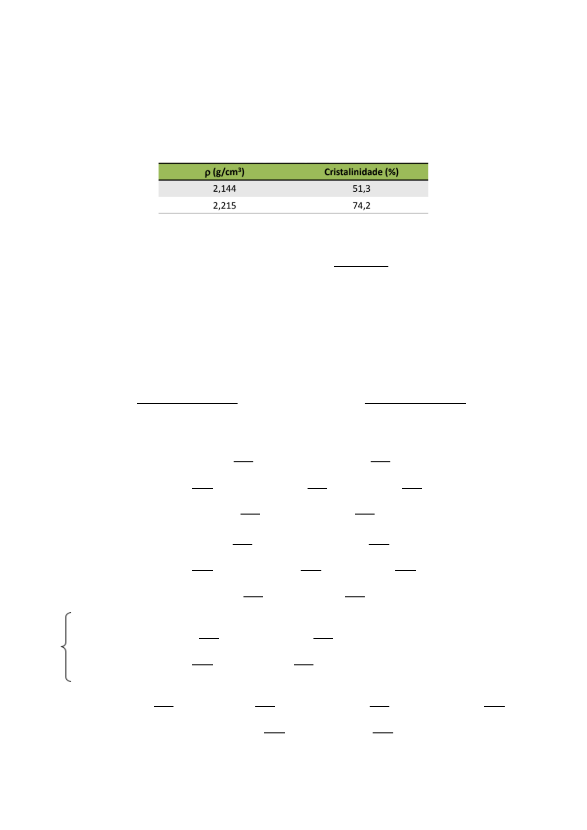 Ciência e Engenharia dos Materiais Professora Cristiane Reis Martins Aluno: Aline Beatriz Soares Passerini RA: 148849 1. As densidades e as cristalinidades percentuais associadas para dois materiais feitos em PTFE (politetrafluoroetileno) são as seguintes: a) Calcule as densidades do polímero politetrafluoroetileno totalmente cristalino e do polímero politetrafluoroetileno totalmente amorfo; % 𝑑𝑒 𝑐𝑟𝑖𝑠𝑡𝑎𝑙𝑖𝑛𝑖𝑑𝑎𝑑𝑒 (𝑒𝑚 𝑚𝑎𝑠𝑠𝑎): ρ 𝐶 ρ 𝑆 −ρ 𝐴( ) ρ 𝑆 ρ 𝐶 −ρ 𝐴( ) · 100 ρ 𝑆 : 𝑑𝑒𝑛𝑠𝑖𝑑𝑎𝑑𝑒 𝑑𝑎 𝑎𝑚𝑜𝑠𝑡𝑟𝑎. ρ 𝐶 : 𝑑𝑒𝑛𝑠𝑖𝑑𝑎𝑑𝑒 𝑑𝑎 𝑎𝑚𝑜𝑠𝑡𝑟𝑎 𝑞𝑢𝑎𝑛𝑑𝑜 𝑡𝑜𝑡𝑎𝑙𝑚𝑒𝑛𝑡𝑒 𝑐𝑟𝑖𝑠𝑡𝑎𝑙𝑖𝑛𝑜. ρ 𝐴 : 𝑑𝑒𝑛𝑠𝑖𝑑𝑎𝑑𝑒 𝑑𝑎 𝑎𝑚𝑜𝑠𝑡𝑟𝑎 𝑞𝑢𝑎𝑛𝑑𝑜 𝑡𝑜𝑡𝑎𝑙𝑚𝑒𝑛𝑡𝑒 𝑎𝑚𝑜𝑟𝑓𝑜. Substituindo os valores da tabela, na equação, obtemos um sistema de 2 equações: e51, 3 = ρ 𝐶 2,144 𝑔/𝑐𝑚3−ρ 𝐴( ) 2,144 𝑔/𝑐𝑚3 ρ 𝐶 −ρ 𝐴( ) · 100 74, 2 = ρ 𝐶 2,215 𝑔/𝑐𝑚3−ρ 𝐴( ) 2,215 𝑔/𝑐𝑚3 ρ 𝐶 −ρ 𝐴( ) · 100 1) 51, 3 2, 144 𝑔 𝑐𝑚3 ρ 𝐶 − ρ 𝐴( )( ) = ρ𝐶 2, 144 𝑔𝑐𝑚3 − ρ𝐴( ) · 100 109, 9872 · ρ 𝐶 𝑔 𝑐𝑚3 − 109, 9872 · ρ 𝐴 𝑔 𝑐𝑚3 = 214, 4 · ρ 𝐶 𝑔 𝑐𝑚3 − ρ 𝐶 · ρ 𝐴 109, 9872 · ρ 𝐴 𝑔 𝑐𝑚3 + 104, 4128 · ρ 𝐶 𝑔 𝑐𝑚3 = ρ 𝐶 · ρ 𝐴 2) 74, 2 2, 215 𝑔 𝑐𝑚3 ρ 𝐶 − ρ 𝐴( )( ) = ρ𝐶 2, 215 𝑔𝑐𝑚3 − ρ𝐴( ) · 100 164, 353 · ρ 𝐶 𝑔 𝑐𝑚3 − 164, 353 · ρ 𝐴 𝑔 𝑐𝑚3 = 221, 5 · ρ 𝐶 𝑔 𝑐𝑚3 − ρ 𝐶 · ρ 𝐴 164, 353 · ρ 𝐴 𝑔 𝑐𝑚3 + 57, 147 · ρ 𝐶 𝑔 𝑐𝑚3 = ρ 𝐶 · ρ 𝐴 ρ 𝐶 · ρ 𝐴 = 109, 9872 · ρ 𝐴 𝑔 𝑐𝑚3 + 104, 4128 · ρ 𝐶 𝑔 𝑐𝑚3 ρ 𝐶 · ρ 𝐴 = 164, 353 · ρ 𝐴 𝑔 𝑐𝑚3 + 57, 147 · ρ 𝐶 𝑔 𝑐𝑚3 164, 353 · ρ 𝐴 𝑔 𝑐𝑚3 + 57, 147 · ρ 𝐶 𝑔 𝑐𝑚3 = 109, 9872 · ρ 𝐴 𝑔 𝑐𝑚3 + 104, 4128 · ρ 𝐶 𝑔 𝑐𝑚3 47, 2658 · ρ 𝐶 𝑔 𝑐𝑚3 = 54, 3658 · ρ 𝐴 𝑔 𝑐𝑚3 ρ 𝐶 𝑔 𝑐𝑚3 = 1, 15 · ρ 𝐴 𝑔 𝑐𝑚3 Substituindo encontramos: ρ 𝐴 = 2, 000 𝑔 𝑐𝑚3 ρ 𝐶 = 2, 301 𝑔 𝑐𝑚3 b) determine o percentual de cristalinidade de uma amostra que possui uma densidade igual a 2,26 g/cm3; .% 𝑑𝑒 𝑐𝑟𝑖𝑠𝑡𝑎𝑙𝑖𝑛𝑖𝑑𝑎𝑑𝑒 (𝑒𝑚 𝑚𝑎𝑠𝑠𝑎): ρ 𝐶 ρ 𝑆 −ρ 𝐴( ) ρ 𝑆 ρ 𝐶 −ρ 𝐴( ) · 100 %𝐶𝑟𝑖𝑠𝑡𝑎𝑙𝑖𝑛𝑖𝑑𝑎𝑑𝑒 = 2,301 𝑔 𝑐𝑚3 2,260 𝑔 𝑐𝑚3 −2,000 𝑔 𝑐𝑚3( ) 2,260 𝑔 𝑐𝑚3 2,301 𝑔 𝑐𝑚3 −2,000 𝑔 𝑐𝑚3( ) · 100 %𝐶𝑟𝑖𝑠𝑡𝑎𝑙𝑖𝑛𝑖𝑑𝑎𝑑𝑒 = 87, 9% 1. 2. Pesquisar uma inovação do termoplástico PTFE e comentar do processamento, condições de processo e aplicação. O PTFE (Teflon) é um polímero fluorado, e o flúor assim como outros elementos da coluna dos halogênios possui a propriedade de não propagar fogo.O PTFE é considerado um plástico de alto desempenho, possui viscosidade muito alta, o que impede de ser processado da mesma forma que outros termoplásticos (por injeção, extrusão), sendo necessária à sua utilização na forma de pó, para compactação em molde e sintetização a altas temperaturas. Podendo ser aplicado de várias maneiras, como revestimento de frigideiras, cobertura de estádio e tubos que substituem veias humanas. Uma inovação do termoplástico de PTFE é o tratamento de refluxo vesicoureterico por injeção endoscópica de Teflon, pelo artigo de Barry O’Donnell e P Puri . Onde 13 meninas com refluxo vesicouretérico grau III-V foram tratadas por injeção endoscópica de pasta de Teflon atrás do ureter intravesical. Quatorze dos 18 ureteres tratados mostraram ausência completa de refluxo após uma injeção de Teflon. Três ureteres precisaram de uma segunda injeção de Teflon para o tratamento bem-sucedido do refluxo. Um ureter com refluxo grau IV foi convertido em refluxo grau II Treze meninas, 12 com refluxo vesicoureteral primário e uma com refluxo secundário por bexiga neuropática, foram incluídas no estudo. Suas idades variaram de 6 meses a 12 anos (média de 6 a 8 anos). Cinco pacientes tiveram refluxo bilateral e oito unilateral; destes, nove ureteres apresentavam refluxo de grau III, sete apresentavam refluxo de grau IV e dois apresentavam refluxo de grau V. (O'DONNELL, BARRY; PURI, P, 1984). Um cateter de polietileno 5F especialmente projetado em uma agulha de calibre 18 foi guiado por um cistoscópio 14. A bexiga foi preenchida com solução salina de irrigação por meio do cistoscópio. A agulha foi inserida 2-3mm abaixo do orifício uretérico. Em seguida, a agulha foi avançada 0 5 cm no espaço atrás do ureter intravesical e 0-2 a 0,5 ml de pasta polytef (Ethicon) injetada com seringa de 1 ml com folha metálica Storz e pistão.(O'DONNELL, BARRY; PURI, P, 1984). Fonte:O'DONNELL, BARRY; PURI, P. Tratamento do refluxo vesicouretérico por injeção endoscópica de Teflon. Br Med J (Clin Res Ed), v. 289, n. 6436, p. 7-9, 1984.