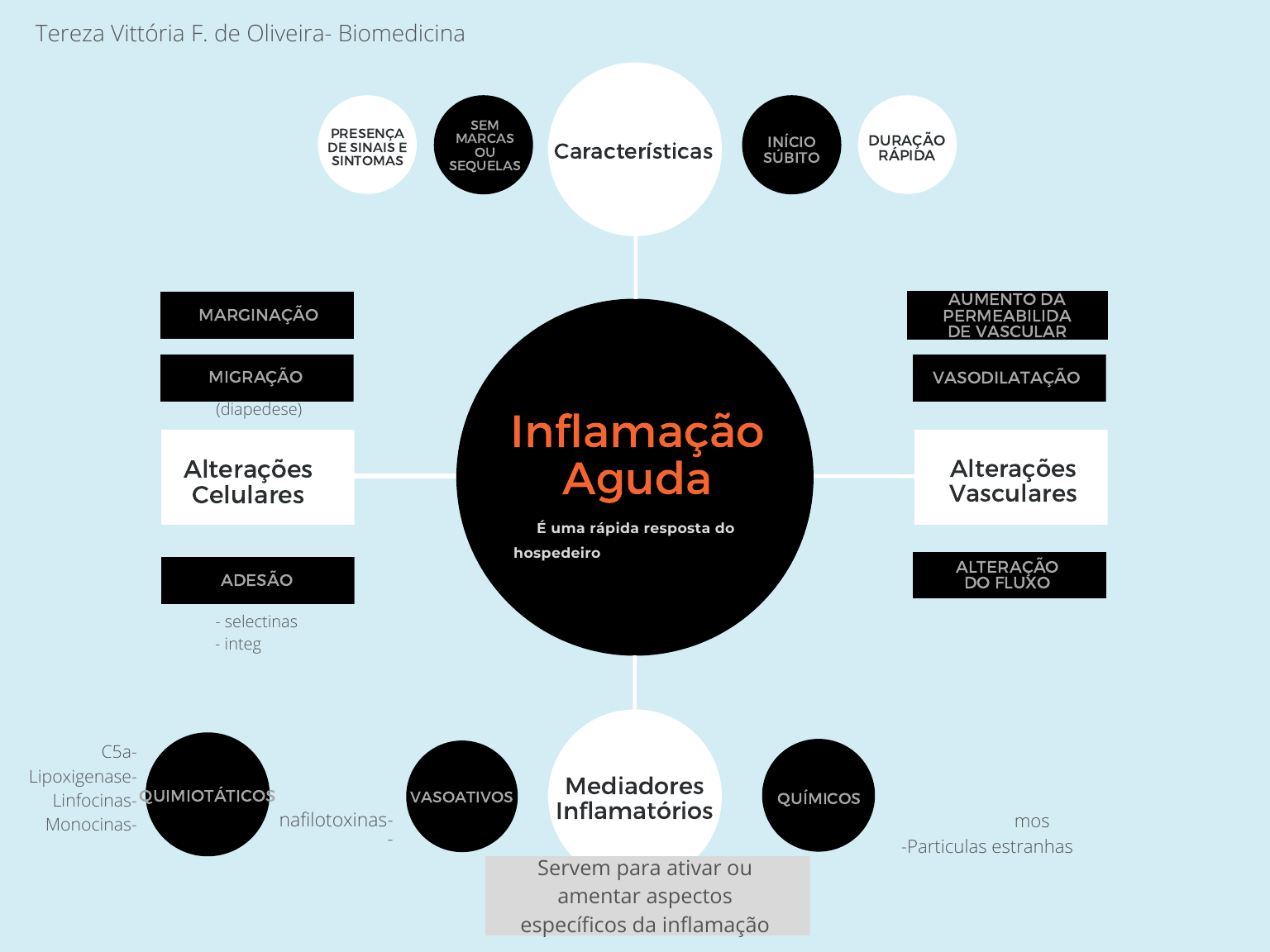 Alterações Celulares Inflamação Aguda É uma rápida resposta do hospedeiro que serve pra levar leucócitos e proteínas do plasma para os locais de infecções Alterações Vasculares Características MARGINAÇÃO Histamina- Serotonina- Bradicinina- Anafilotoxinas- - AUMENTO DA PERMEABILIDA DE VASCULAR ADESÃO MIGRAÇÃO VASODILATAÇÃO ALTERAÇÃO DO FLUXO Mediadores Inflamatórios SEM MARCAS OU SEQUELAS PRESENÇA DE SINAIS E SINTOMAS INÍCIO SÚBITO DURAÇÃO RÁPIDA VASOATIVOS QUÍMICOS (diapedese) - selectinas - integrinas -Isquemia -Traumatismo -Neoplasia -Microorganismos -Particulas estranhas Servem para ativar ou amentar aspectos específicos da inflamação QUIMIOTÁTICOS C5a- Lipoxigenase- Linfocinas- Monocinas- Tereza Vittória F. de Oliveira- Biomedicina
