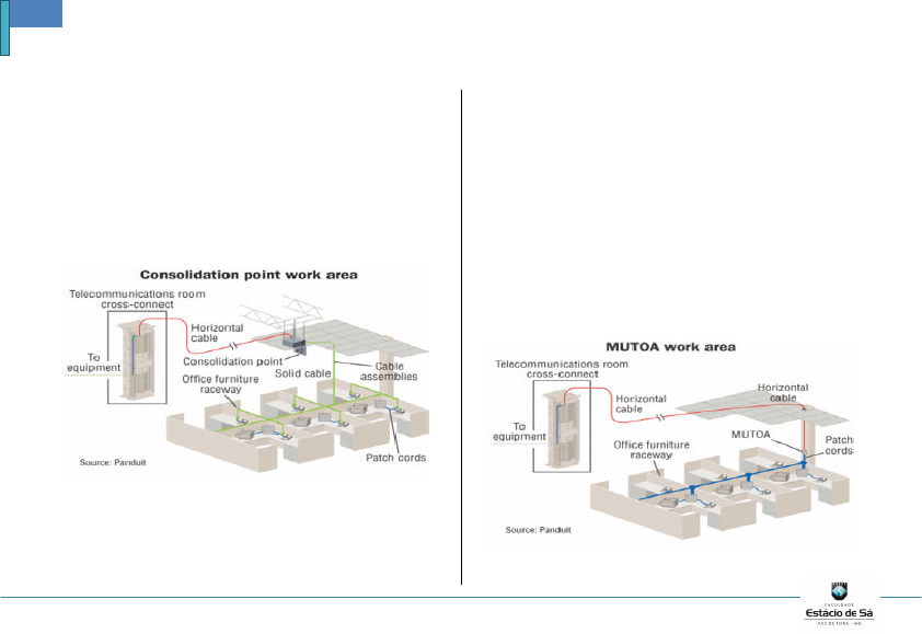 Guia de Referência sobre Normas de Cabeamento Estruturado 2011.2 NORMA: TIA/EIA TSB-75 Integrantes da Equipe: Lucas Porto, Marcelo Alves, Marcos Rocha, Tiago Menezes 1 A norma TSB-75 complementa as normas TIA/EIA 568-A e 569-A e especifica metodologias de cabeamento para atender a ambientes abertos ou escritórios modulares e com reconfigurações constants. Seu principal objetivo é reduzir os custos onde haja mudança frequente de layout. Tem como principais métodos de implementação a utilização de Pontos de Consolidação ou por Multi User Telecommunications Outlet Assembly, conhecido como MUTO ou MUTOA. Implementação utilizando Pontos de Consolidação (Consolidation Points) É um ponto de interconexão no interior do cabeamento horizontal. O ponto de consolidação executa uma ligação direta (straight-through) intermediária entre o cabeamento horizontal que parte da conexão cruzada e o cabeamento horizontal que vai para um MUTO ou o outlet de telecomunicações na área de trabalho. Conexão cruzada entre estes cabos não são permitidas. Um ponto de consolidação pode ser útil quando reconfigurações são freqüentes, mas não tão freqüentes quanto a exigência do MUTO por flexibilidade. Assegurar que a distância total do canal de maneira alguma ultrapasse a distância de 100 metros. Assegurar a fixação dos cabos sem violar as especificações e características de cada material respeitando as exigências de mínimo raio de curvatura. Garantir que o ponto de consolidação esteja a pelo menos 15m de distância do armário de telecomunicações, evitando o NEXT adicional devido à ressonância do link de múltiplas conexões nas proximidades do armário. Garantir não mais que um ponto de consolidação e um MUTO no interior da mesma rota horizontal. Implementação “open office” utilizando Multi-user Telecommunications Outlet Assembly – MUTOA ou MUTO Guia de Referência sobre Normas de Cabeamento Estruturado 2011.2 NORMA: TIA/EIA TSB-75 Integrantes da Equipe: Lucas Porto, Marcelo Alves, Marcos Rocha, Tiago Menezes 2 Esta configuração permite a mudança da planta do escritório sem afetar o cabeamento horizontal. Esquema de tomada de telecomunicações provendo atendimento a múltiplas áreas de trabalho (máxima de 12) em um ambiente de “open office” Pré-requisitos da configuração MUTOA: MUTOA (tomada de telecomunicações multi-uso) não deve ser instalado no teto. O comprimento máximo dos cords modulares deve ser de 20m O cord modular conectando o MUTOA ao equipamento terminal deve ser etiquetado em ambas as pontas com um identificador único. O MUTOA deve ser identificado com o patch cord de maior comprimento da área de trabalho (cord modular). Distâncias Horizontais para Enlaces de Cobre (Em Open Office com Muto) Quando usa-se tomadas de telecomunicação multiusuário, os requisitos da TIA/EIA 568-A (seções 10.5 e 11.5) devem ser satisfeitos. Na seção 10.5 está determinado que o comprimento máximo dos cabos (patch e adapter cables) deve ser: C = (102 - H) / 1,2 W = C - 7 (< 20 m) Onde: C = é o comprimento máximo combinado do cabo que conecta o equipamento do usuário à tomada de telecomunicação, mais o cabo que conecta o equipamento no armário de telecomunicação e o cabo que interliga os patch panels; W = é o comprimento do cabo da área de trabalho; H = é o comprimento do cabo horizontal. As fórmulas acima assumem que existe um total de 7 m de patch cables interligando o equipamento e os patch panels no armário de telecomunicações. A tabela abaixo mostra a aplicação das fórmulas. O comprimento máximo dos cabos nas áreas de trabalho não podem exceder 20m. As tomadas multiusuário devem trazer a marcação do comprimento máximo de cabos permitido para a área de trabalho. Pré-requisitos da norma TSB 75 O cabo que percorre a área de trabalho (os patch cables) não pode exceder 20 metros O Comprimento combinado inclui o cabo de manobra, cabo de equipamento e cabo de estação. Cabos de fibra óptica deve sempre ter o limite máximo total de 100 metros Guia de Referência sobre Normas de Cabeamento Estruturado 2011.2 NORMA: TIA/EIA TSB-75 Integrantes da Equipe: Lucas Porto, Marcelo Alves, Marcos Rocha, Tiago Menezes 3 Bibliografia: � http://www.cercomp.ufg.br/pages/1480 � http://pt.scribd.com/doc/2699978/cabeamento-estruturado � http://dc220.4shared.com/doc/6WDs1kPN/preview.html#9 � http://higuita.com.br/if/prr/prr4.pdf