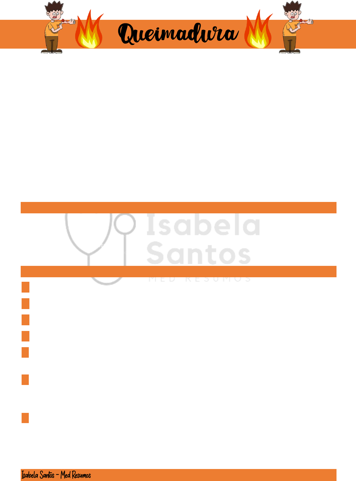 - Queimadura é uma lesão de pele causada por calor, frio, eletricidade, produtos químicos, gases, radiação e fricção. - Objetivo do tratamento de queimaduras: parar o processo de lesão, esfriar e cobrir o ferimento. - Resultado: alívio da dor e perda reduzida de tecido. 1º grau - insolação - atinge epiderme, dor, vermelhidão 2º grau - atinge a derme, dor intensa, forma bolhas, aparência vermelha 3º grau - destrói todas as camadas da pele, dor reduzida, escura, parece couro, pele clara nacarada. Classificação Pequena = menos de 10% Média = 10 a 30% Grande = acima de 30% Iniciando o atendimento 1º Segurança do local, sua segurança e da vítima 2º Utilização de EPI'S 3º Afastar o paciente do agente causador 4º Iniciar o XABCDE X- Hemorragias externas - conter com gaze algodoada estéril ou torniquete A- Permeabilidade das vias aéreas - Fazer juw trust estabilizando a coluna cervical - Inspecionar a cavidade oral e retirar fuligem B- Boa respiração - Avaliar a respiração - Avaliar posicionamento da traqueia e turgência jugular - Posicionar a cânula orofaríngea - Administrar oxigênio em alto fluxo 10 a 15L/min - Colocar colar cervical - Realizar apalpação do tórax C- Avaliar hemorragia interna - Avaliar o preenchimento capilar - Pulso radial e carotídeo - Avaliar a pele e qual grau da queimadura - Pelve, abdômen e membros inferiores - Se preciso acesso venoso- infusionar ringer lactato D- Disfunção neurológica - Avaliar a escala de coma e pupilas E- Expor e prevenir hipotermia - Cortar as vestes não aderidas a pele - Retirar adereços - Irrigar com soro fisiológico para resfriar a área queimada - Cobrir com compressa estéril e não aderente, cobrir com manta metálica - Entrar em contato com a regulação médica e informar a situação de forma sistematizada Superfície Corporal queimada - O paciente vítima de queimadura vai para o Centro de Queimados - Durante infusão do ringer lactato 50% é na primeira 8h e o restante nas outras 16h - Paciente vítima de queimadura elétrica, monitorar atividade cardíaca - Se a situação não houver indícios de politrauma (ex: queimadura em casa), o recomendado é ir para a letra E do protocolo XABCDE