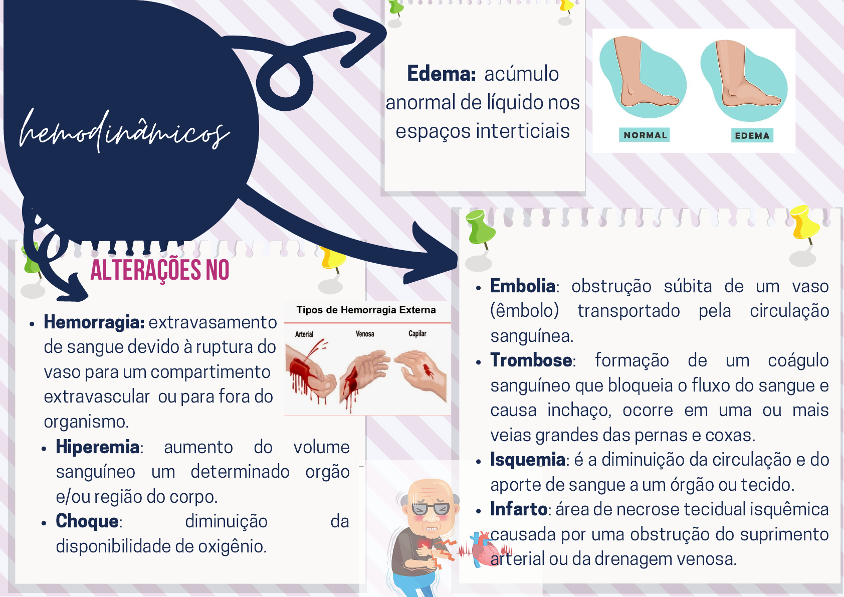 Associations Alterações Hídricas Interticais distúrbios hemodinâmicos Alterações no volume sanguíneo Alterações por obstrução intravascular Edema: acúmulo anormal de líquido nos espaços interticiais Embolia: obstrução súbita de um vaso (êmbolo) transportado pela circulação sanguínea. Trombose: formação de um coágulo sanguíneo que bloqueia o fluxo do sangue e causa inchaço, ocorre em uma ou mais veias grandes das pernas e coxas. Isquemia: é a diminuição da circulação e do aporte de sangue a um órgão ou tecido. Infarto: área de necrose tecidual isquêmica causada por uma obstrução do suprimento arterial ou da drenagem venosa. Hiperemia: aumento do volume sanguíneo um determinado orgão e/ou região do corpo. Choque: diminuição da disponibilidade de oxigênio. Hemorragia: extravasamento de sangue devido à ruptura do vaso para um compartimento extravascular ou para fora do organismo.
