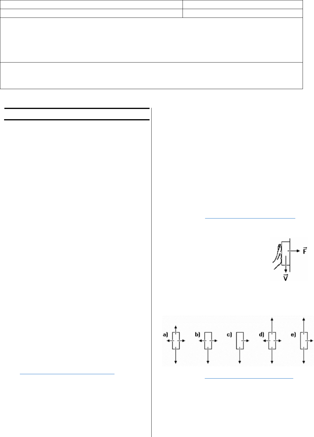 P á g i n a 1 | 4 Disciplina: Física (Etapa 3) Professor: Francisco Felipe ATIVIDADE 1 – Leis de Newton Carga horária: 3 h O estudante deverá ser capaz de: • Reconhecer os diferentes tipos de força como: normal, força de atrito, peso, força elástica, tração. • Aplicar a 2ª Lei de Newton para calcular grandezas como forças normal, tração, peso e aceleração. • Decompor forças em componentes horizontal e vertical. • Identificar forças em situações envolvendo polias, molas, plano inclinado. Orientações: • Faça as questões em seu caderno, scaneie e envie no SIGAA. • Caso tenha alguma dúvida utilize link da resolução Leis de Newton 1 – (UFPE) A Mecânica Clássica, também conhecida como mecânica newtoniana, fundamenta-se em princípios que podem ser sintetizados em um conjunto de três afirmações conhecidas como as leis de Newton do movimento. Assinale as sentenças verdadeiras: I. Se o motor de uma espaçonave que se move no espaço sideral suficientemente afastada de qualquer influência gravitacional deixar de funcionar, a espaçonave diminui sua velocidade e fica em repouso. II. As forças de ação e reação agem em corpos diferentes. III. Massa é propriedade de um corpo que determina a sua resistência a uma mudança de movimento. IV. Se um corpo está se dirigindo para o norte, podemos concluir que podem existir várias forças sobre o objeto, mas a maior deve estar direcionada para o norte. V. Se a resultante das forças que atuam sobre um corpo é nula, pode-se concluir que este se encontra em repouso ou em movimento retilíneo uniforme Link: https://youtu.be/imGb92m7q4E 2 – (UE-PA) Um livro está em repouso sobre a superfície de uma mesa. De acordo com o princípio da ação e reação de Newton, a reação do peso do livro é: a) a força que o livro exerce sobre a mesa. b) a força que a mesa exerce sobre o livro. c) a força que o livro exerce sobre a Terra. d) a força que a Terra exerce sobre o livro. e) a força de atrito entre o livro e a mesa. Resolvido em: https://youtu.be/UqBUx3hloL8 3 – (UFMG) A figura a seguir mostra um bloco que está sendo pressionado contra uma parede vertical com força horizontal �⃗⃗� e que desliza para baixo com velocidade constante. O diagrama que melhor representa as forças que atuam nesse bloco é: Resolvido em: https://youtu.be/Hh7sVyiv1Xo https://youtu.be/imGb92m7q4E https://youtu.be/UqBUx3hloL8 https://youtu.be/Hh7sVyiv1Xo P á g i n a 2 | 4 4 – A força de reação normal é uma força que surge quando existe contato entre o corpo e uma superfície, sendo definida como uma força de reação da superfície sobre a compressão que o corpo exerce sobre esta superfície. Abaixo temos quatro situações, com os respectivos diagramas de forças. Analise a representação da Força de Reação Normal (N) em cada uma das situações. a) A força de reação normal está corretamente representada em I, II e IV. b) A força de reação normal está corretamente representada em I, II e III. c) A força de reação normal está corretamente representada em I, III e IV. d) A força de reação normal está corretamente representada em II, III e IV. e) A força de reação normal está corretamente representada em todas as situações. Resolvido em: https://youtu.be/Q2IUScuySFQ 5 – (ENEM 2011) A força de atrito é uma força que depende do contato entre corpos. Pode ser definida como uma força de oposição à tendência de deslocamento dos corpos e é gerada devido a irregularidades entre duas superfícies em contato. Na figura, as setas representam forças que atuam no corpo e o ponto ampliado representa as irregularidades que existem entre as duas superfícies. Na figura, os vetores que representam as forças que provocam o deslocamento e o atrito são, respectivamente: Resolvido em: https://youtu.be/sKdCqHcjk64 6 – (UFV-MG) Desprezada a resistência do ar, a opção que representa corretamente a(s) força(s) que atua(m) sobre uma bola de futebol após ter sido chutada é: Resolvido em: https://youtu.be/NmPBP7Ynphs https://youtu.be/Q2IUScuySFQ https://youtu.be/sKdCqHcjk64 https://youtu.be/NmPBP7Ynphs P á g i n a 3 | 4 7 – A figura mostra um sistema em equilíbrio, indique qual das alternativas melhor representa o diagrama de corpo livre dos blocos A, B e C respectivamente. Resolvido em: https://youtu.be/NoA8cwo1ImE 8 – (Cesgranrio-RJ) Atira-se uma pedra verticalmente para cima. Assinale a opção que representa corretamente a velocidade v da pedra e a força resultante 𝐹 que atua sobre ela no ponto mais alto da trajetória Resolvido em: https://youtu.be/Fo9KYK7jZJg 9 – (Uflavras) Um bloco de gelo desprende-se de uma geleira e desce um plano inclinado com atrito. Qual o diagrama que representa correntemente as forças que atuam sobre o bloco? Resolvido em: https://youtu.be/NoA8cwo1ImE https://youtu.be/Fo9KYK7jZJg P á g i n a 4 | 4 10 – (Uerj) Um bloco de madeira desloca-se sobre uma superfície horizontal, com velocidade constante, na direção e sentido da seta, puxado por uma pessoa, conforme a figura abaixo. A resultante das forças que a superfície exerce sobre o bloco pode ser representada por: Resolvido em: https://youtu.be/NdQPiIU4_pA 11 – Os blocos A e B deslizam lentamente para baixo com velocidade constante. Determine o diagrama que melhor representa o diagrama de corpo livre do bloco A. Resolvido em: 12 – (Cesgranrio-RJ) Uma esfera de aço suspensa por um fio descreve uma trajetória circular de centro O, em um plano horizontal, no laboratório. As forças exercidas sobre a esfera (desprezando-se a resistência do ar) são: Resolvido em: https://youtu.be/hs_E1YfX_sA https://youtu.be/NdQPiIU4_pA https://youtu.be/hs_E1YfX_sA