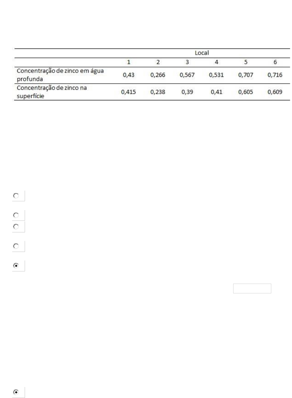 PERGUNTA 1 1. No artigo de Somashekar e colaboradores (1982), que apresentou a influência da concentração de zinco em água (em mg/L) em seis regiões diferentes do rio Kapila, Índia, coletando amostras da superfície e em água profunda, conforme a Tabela a seguir: Foi aplicado o teste t pareado, haja vista que na mesma região apresentou-se duas condições diferentes, de modo que para: I O nível de significância de 5% há diferenças significativas entre as amostras. II O nível de significância de 1% não há diferença significativa entre as amostras. III Ambos os níveis de significância há rejeição da hipótese nula. IV Qualquer nível de significância não é possível afirmar nenhuma análise. É VERDADEIRO o que se afirma em a. II, apenas. b. I e II, apenas. c. I, apenas. d. IV, apenas. e. III, apenas. 0,175 pontos PERGUNTA 2 1. No artigo intitulado Synovial fluid pH, lactate, oxygen and carbon dioxide partial pressure in various joint diseases (1971), foram reportados os valores de potencial Hidrogeniônico (pH) do fluido que lubrifica juntas e tendões com base na medição de pessoas que possuem artrite. A seguinte Tabela apresenta os dados dos indivíduos com e sem artrite: Com artrite 7,02 7,35 7,34 7,17 7,28 7,77 7,09 Sem artrite 7,22 7,45 6,95 7,4 7,1 7,32 7,14 Considerando a média verdadeira de pH para as pessoas que possuem artrite, um nível de significância de 5% e aplicando o teste pareado, assinale a alternativa CORRETA: a. Há diferenças entre as médias das pessoas com artrite e sem artrite em termos de valores de pH. b. Não há diferenças entre as médias das pessoas com artrite e sem artrite em termos de valores de pH. c. Se o nível de significância fosse de 10%, as amostras não apresentariam diferenças significativas. d. Se houvesse alteração para o nível de significância de 10%, o resultado da conclusão seria igual ao do item b. e. Se houvesse alteração para o nível de significância de 1%, o resultado da conclusão seria igual ao do item a. 0,175 pontos PERGUNTA 3 1. A exposição de crianças em ambientes com a presença de fumantes e não fumantes foi estudada pelo artigo intitulado Measuring the exposure of infants to tobacco smoke – nicotine and cotinine in urine and saliva, de modo que os dados são apresentados a seguir, tendo sido detectado um dos princípios metabólicos da urina das crianças: Não expostas 8 11 12 14 20 43 111 Expostas 35 56 83 92 128 150 176 208 Considerando estas informações, leia atentamente as seguintes afirmações: I A 5% de significância, a exposição ou não de crianças em uma casa com fumantes não alterará a quantidade de princípio ativo na urina. II A 5% de significância, a exposição ou não de crianças em uma casa com fumantes é diferente estatisticamente à quantidade de princípio ativo na urina. III A hipótese nula, para o teste de significância de 5% apresenta que as médias das concentrações na urina são diferentes para crianças expostas ou não a ambiente com fumante. IV A hipótese alternativa, para o teste de significância de 5% apresenta que as médias das concentrações na urina são iguais para crianças expostas ou não a ambiente com fumante. É VERDADEIRO o que se afirma em a. I, II, III e IV. b. III, apenas. c. IV, apenas. d. II, apenas. e. I, apenas. 0,175 pontos PERGUNTA 4 1. A quantidade de nitrogênio expirado (em litros) em quatro regimes de alimentação (1: jejum; 2: 23% de proteína; 3: 32% de proteína; e 4: 67% de proteína) foi estudada por Johnson e colaboradores no artigo intitulado Production of gaseous nitrogen in human steady-state conditions, dados estes sintetizados na seguinte Tabela: Assim, ao se aplicar o teste de Krusal-Wallis, o valor crítico para o nível de: I 1% permite concluir que não existem diferenças significativas entre os valores. II 1% de concentração de nitrogênio permite concluir que existem diferenças significativas entre os valores médios das distâncias de frenagem. III 5% permite concluir que há diferenças significativas entre os valores médios das concentrações de nitrogênio. IV 5% permite concluir que não existem diferenças significativas entre os valores médios das concentrações de nitrogênio, de modo que a hipótese nula é aceita. V 1% permite concluir que existem diferenças significativas entre os valores médios das distâncias de frenagem, de modo que a hipótese nula é aceita. É VERDADEIRO o que se afirma em a. IV, apenas. b. duas afirmativas, apenas. c. I, apenas. d. II, apenas. e. III, apenas.