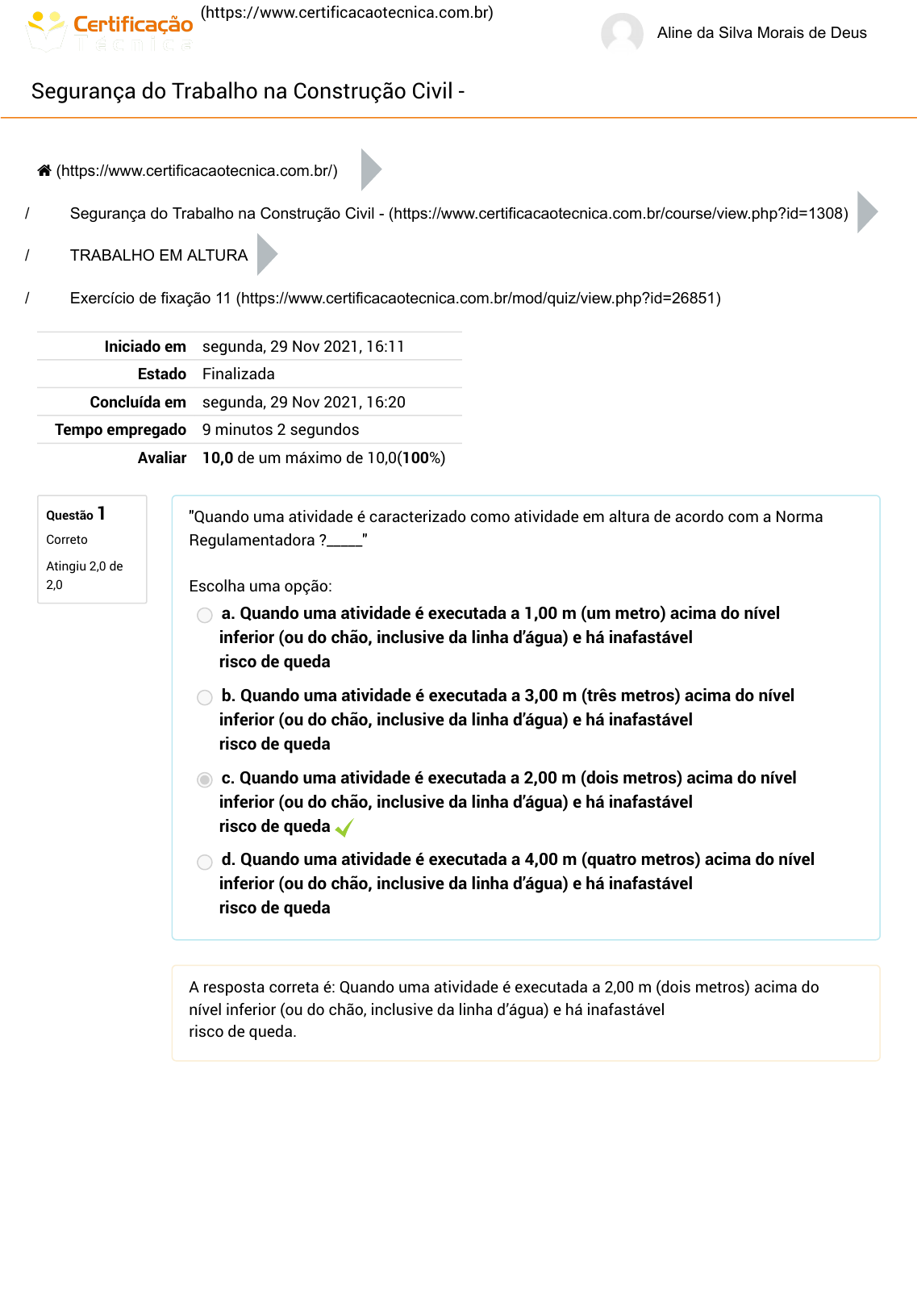 (https://www.certificacaotecnica.com.br) Aline da Silva Morais de Deus Segurança do Trabalho na Construção Civil - Questão 1 Correto Atingiu 2,0 de 2,0 / / / Iniciado em segunda, 29 Nov 2021, 16:11 Estado Finalizada Concluída em segunda, 29 Nov 2021, 16:20 Tempo empregado 9 minutos 2 segundos Avaliar 10,0 de um máximo de 10,0(100%) "Quando uma atividade é caracterizado como atividade em altura de acordo com a Norma Regulamentadora ?_____" Escolha uma opção: a. Quando uma atividade é executada a 1,00 m (um metro) acima do nível inferior (ou do chão, inclusive da linha d’água) e há inafastável risco de queda b. Quando uma atividade é executada a 3,00 m (três metros) acima do nível inferior (ou do chão, inclusive da linha d’água) e há inafastável risco de queda c. Quando uma atividade é executada a 2,00 m (dois metros) acima do nível inferior (ou do chão, inclusive da linha d’água) e há inafastável risco de queda d. Quando uma atividade é executada a 4,00 m (quatro metros) acima do nível inferior (ou do chão, inclusive da linha d’água) e há inafastável risco de queda A resposta correta é: Quando uma atividade é executada a 2,00 m (dois metros) acima do nível inferior (ou do chão, inclusive da linha d’água) e há inafastável risco de queda. (https://www.certificacaotecnica.com.br/) Segurança do Trabalho na Construção Civil - (https://www.certificacaotecnica.com.br/course/view.php?id=1308) TRABALHO EM ALTURA Exercício de fixação 11 (https://www.certificacaotecnica.com.br/mod/quiz/view.php?id=26851) https://www.certificacaotecnica.com.br/ https://www.certificacaotecnica.com.br/ https://www.certificacaotecnica.com.br/course/view.php?id=1308 https://www.certificacaotecnica.com.br/mod/quiz/view.php?id=26851 Questão 2 Correto Atingiu 1,0 de 1,0 Questão 3 Correto Atingiu 1,0 de 1,0 Questão 4 Correto Atingiu 2,0 de 2,0 Qual Norma Regulamentadora do Ministério do Trabalho trata dos assuntos relacionados a altura ? Escolha uma opção: a. NR - 33 b. NR - 35 c. NR - 34 d. NR - 36 A resposta correta é: NR - 35. "São equipamentos de proteção destinados a sustentar ou suportar o trabalhador enquanto realiza trabalho em altura, nas atividades em que o usuário não necessite deslocar-se ou quando o realiza, a direção e a amplitude do movimento são limitadas, porquanto não há a possibilidade de queda livre ?_____" Escolha uma ou mais: a. dispositivos antiquedas b. dispositivos de sustentação c. dispositivos antiquedas d. dispositivo de descida A resposta correta é: dispositivos de sustentação. "Com relação aos exames de ASO (Atestado de Saúde Ocupacional) do trabalhador que ira exercer atividades em altura, qual deverá ser o procedimento ?_____" Escolha uma opção: a. Deve proceder com exames clinicos, bem como teste de audiometria de forma complementar b. Deve proceder com exames clinicos, bem como teste de camara hiperbárica de forma complementar c. Devem proceder com exames clinicos de praxe apenas. d. Devem ser submetidos a rigorosa avaliação clínica, sendo, inclusive, submetidos a exames específicos, para que, somente assim, possam vir a ser considerados aptos para tal encargo. A resposta correta é: Devem ser submetidos a rigorosa avaliação clínica, sendo, inclusive, submetidos a exames específicos, para que, somente assim, possam vir a ser considerados aptos para tal encargo.. Questão 5 Correto Atingiu 1,0 de 1,0 Questão 6 Correto Atingiu 1,0 de 1,0 Questão 7 Correto Atingiu 2,0 de 2,0 "De acordo com a Norma Regulamentadora que trata do assunto de trabalho em altura, diz que todo trabalho antes da execução deve ser precedido de qual documento ?_____" Escolha uma ou mais: a. Permissão de Entrada de Trabalho b. Analise de Risco c. Atestado de Saude Ocupacional d. Programa de Proteção Respiratoria A resposta correta é: Analise de Risco. É uma das principais causas dos acidentes graves na indústria da Construção ? Escolha uma opção: a. Soterrramento b. Queda de ferramenta c. Ferimentos causados por mau uso de maquinario d. Queda de Nivel A resposta correta é: Queda de Nivel. Dentre os eventos indesejados nas atividade em altura, existe uma relacionado a uma Sindrime com qual denominação ? Escolha uma opção: a. Sindrome da fobia b. Sindrome da Suspensão Inerte c. Sindrome da tontura d. Sindrome da vertigem A resposta correta é: Sindrome da Suspensão Inerte.