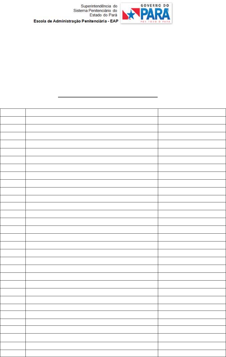 CURSO DE FORMAÇÃO PROFISSIONAL CONCURSO PÚBLICO C – 199 - EDITAL Nº 001/2017 – SEAD/SUSIPE, de15 de dezembro de 2017 RELAÇÃO DOS APROVADOS 1. VAGNER VASCONCELOS ALVES 9,84 2. JHONATAS GEORGE DOS SANTOS RICARDO 9,82 3. DORICLEIA MELO RIBEIRO 9,82 4. JOAO DAMASCENO LOPES NETTO 9,77 5. DHENNYSON SOARES DOS SANTOS 9,77 6. VICTOR MACEDO LEMOS 9,75 7. HERMESSON ENRIQUE LIMA DOS SANTOS 9,75 8. BRUNO JOSÉ CORREIA DA SILVA 9,74 9. ALBERT RAMOS FREITAS 9,71 10. ARTHUR DA ROCHA MARTINS BUENO 9,70 11. WILSON SOUSA FERREIRA 9,69 12. DARIO ALVES DA SILVA JUNIOR 9,68 13. TIAGO MAMEDES DE SOUZA 9,66 14. ALEX DOS SANTOS NOGUEIRA 9,66 15. WOLBER ANDERSON OLIVEIRA CAMPOS 9,65 16. LUCIANO GOMELLA DE SOUZA 9,65 17. JOSE NILDO DA CONCEIÇÃO DA SILVA 9,65 18. FABIO COSTA MONTEIRO 9,64 19. CHARLIANY ROLIM FREITAS 9,64 20. ANA PAULA DA SILVA FARIA 9,63 21. JAIRO GILFORT REIS DE LEMOS FILHO 9,63 22. WANDERSON DE SOUZA RAPOSO 9,62 23. SILAS SILVA FARIAS 9,62 24. RENAN CARDOSO NEGRÃO 9,62 25. INGRID SILVA DO AMARAL 9,62 26. CAIO CÉZAR SANTOS CONCEIÇÃO 9,62 27. OTÁVIO JÚNIOR MARTINS DA SILVA 9,61 28. FABRICIO DA SILVA MACHADO 9,61 29. TACIANO DA SILVA CAVALCANTE 9,60 30. FABRICIO SAULO ARAUJO MARTINS 9,60 31. FABIO AUGUSTO SAMPAIO DE ANDRADE 9,60 32. WOLCKMER GUILHERME MASTUB DE MACEDO FILHO 9,59 33. SIRLEY WEDER BARBOSA DUARTE 9,59 34. RENATO BOTELHO SACRAMENTO 9,59 35. RAYSSA KATHLYN RODRIGUES PAMPLONA 9,59 36. RAFAEL DA SILVA DAMASCENO 9,59 37. GLEYSON NASCIMENTO ANDRADE 9,59 38. GILDO DA SILVA RAMALHO 9,59 39. PEDRO BARRETO DE ALMEIDA 9,58 40. KILDAYRE JOSÉ ALMEIDA MIRANDA 9,58 41. KELLY DANIELLE COSTA DO NASCIMENTO 9,58 42. VANDERSON SANTOS DE MATOS 9,57 43. OLAVO GUIMARÃES ARAUJO JUNIOR 9,57 44. ALEXANDRE ROGERIO PEDROSO RIBEIRO 9,56 45. THIAGO ALEXANDRE DOS SANTOS TEIXEIRA 9,55 46. PAULO HENRIQUE SILVA LIRA 9,55 47. LIVALDO CORREA DE ARAÚJO 9,55 48. IGOR DIAS CASTELO BRANCO 9,55 49. FRANCISCO DA CONCEICAO 9,55 50. EDINHO DE ABREU DA SILVA 9,55 51. RODRIGO DOS SANTOS ALVES 9,54 52. RAPHAEL PATRICK DUARTE SENA DE OLIVEIRA 9,54 53. OTÁVIO DE SOUSA DE ARAUJO 9,54 54. JOSÉ LUIZ DOS SANTOS JÚNIOR 9,54 55. JOÃO CÉSAR DA SILVA MELO 9,54 56. JEFFERSON EDUARDO CARVALHO RAMOS 9,54 57. DANIELTON LIMA DA COSTA 9,54 58. ALEX FERNANDO COSTA GOMES 9,54 59. WANICI CORREA DOS ANJOS 9,53 60. ROGÉRIO LIMA BAIA 9,53 61. RODRIGO DE ALBUQUERQUE CARVALHO 9,53 62. LEANDRO PANTOJA DE MELO 9,53 63. EDIR VALE DE PINHO 9,53 64. DANILO LEAL DE BARROS 9,53 65. ANA RAQUEL SILVA SOUSA 9,53 66. WILSON FERREIRA VIEIRA 9,52 67. MACELO SOUSA CARNEIRO 9,52 68. FERNANDO FERREIRA DOS SANTOS 9,52 69. SUELLEN MARA OLIVEIRA DE OLIVEIRA 9,51 70. RODRIGO SANTOS PEDROSA 9,51 71. PAULO ALVES DA ROCHA 9,51 72. LUCIANO DELFINE PIVETA 9,51 73. LEANDRO MOREIRA SANTANA 9,51 74. JOSÉ IÇAN DIORGIS PICANÇO IVANOVITCH 9,51 75. DIEGO BERNARDO PACHECO 9,51 76. ANDRÉ OLIVEIRA DE MELO 9,51 77. ANDERSON CARRERA ALEIXO 9,51 78. AMILTON BARATA ALEIXO CORREA 9,51 79. WESLEY MARQUES MELO 9,50 80. SAMUEL JACINTO DE MELO 9,50 81. MAURICIO CARDOSO DA SILVA 9,50 82. MARCOS FELIPE SANCHES DE SOUSA 9,50 83. FERNANDO JORGE DOS SANTOS ALMEIDA JUNIOR 9,50 84. ROBERTO HEINEN BRAGA 9,49 85. RICK ARCANJO DOS SANTOS 9,49 86. RICHARD DE NIXON RAIOL LEÃO 9,49 87. JUNIELSON COSTA LEMOS PORTILHO 9,49 88. FABIANO ALBUQUERQUE DE OLIVEIRA 9,49 89. EWERTON BRENO SOUSA DO NASCIMENTO 9,49 90. ALEXANDRE MELO PESSOA 9,49 91. SILIA MAIRA FERREIRA RIBEIRO 9,48 92. SANDRA HELENA CARNEIRO BARROSO 9,48 93. RAIMUNDO IVAN NASCIMENTO COSTA 9,48 94. PAULO AFONSO MIRANDA GARRIDO 9,48 95. MATHEUS MARTINS BELO MARINO 9,48 96. LEONAN PEREIRA COSTA 9,48 97. FABIO BRITO DIAMANTINO 9,48 98. ARLYSSON MARTINS COUTINHO 9,48 99. VANESSA MOURA DE SOUZA LIMA 9,47 100. VANDO JOSE SOUSA MENDES 9,47 101. SILVIO DAVID MACHADO PRESTES 9,47 102. RONALD CEZAR PANTOJA TAVARES 9,47 103. MARCELA JOICY ROCHA MARTINS 9,47 104. DANILLO ALVES CAVALCANTE 9,47 105. SHEYSSON COELHO NUNES 9,46 106. RENATA VALESCA LEITE CORRÊA 9,46 107. JOSÉ CÉSAR DAS NEVES LIMA FILHO 9,46 108. JOÃO BOSCO DE AQUINO MACIEL FILHO 9,46 109. FREDERICK MACHADO FARIAS 9,46 110. FRANCISCO EUGÊNIO SOARES SALES FILHO 9,46 111. ERIVAN CUNHA SILVA 9,46 112. EDSON DA SILVA FERREIRA 9,46 113. CARLOS ANDRE MOTA DA CRUZ 9,46 114. RAFAEL VINAGRE SIDONIO 9,45 115. MARCELO DE MATOS VAZ 9,45 116. JONATAS COSTA DE SOUZA 9,45 117. JADAILSON FERNANDES MONTEIRO 9,45 118. EVERSON MAIA NASCIMENTO 9,45 119. CECILIO JUNIOR MOTA VIEIRA 9,45 120. CARLOS ANTONIO VIDAL DA SILVA 9,45 121. WILLIAME ARTHUR SOUSA PACHECO 9,44 122. PAULO NASCIMENTO NETO 9,44 123. OLIVAL DE FARIAS COSTA NETO 9,44 124. FABIO FERNANDO SANTOS DAS CHAGAS 9,44 125. ANTÔNIO DA CONCEIÇÃO DE OLIVEIRA 9,44 126. VIVIAN MARILIA DA SILVA OLIVEIRA 9,43 127. TÁSSIO DO NASCIMENTO SOUSA 9,43 128. MAURO SERGIO RAMOS DOS ANJOS 9,43 129. ALAN SANTOS PACHECO 9,43 130. WALDENOR PEREIRA DA SILVA JUNIOR 9,42 131. RONNY LISBOA OLIVEIRA 9,42 132. RAFAEL COSTA GUERREIRO 9,42 133. NATANAEL BARROS DA SILVA 9,42 134. DIEGO MONTEIRO SANTANA 9,42 135. DANIEL SILVA DE PAULA 9,42 136. CRISTHIANE ARAUJO SILVA DE MIRANDA 9,42 137. ANDERSON LUIS XAVIER RAMOS 9,42 138. ALAN SANTA ROSA DA SILVA 9,41 139. WANDERSON BRUNEO MOURA BENTES 9,41 140. PEDRO PAULO SANTOS DE SOUSA 9,41 141. JOSE JARBAS DE CARVALHO 9,41 142. JOÃO MARCOS SOUSA DA SILVA JUNIOR 9,40 143. DANILO PIMENTA DE MELO 9,40 144. ANA CECÍLIA DA COSTA PAIVA 9,40 145. KEYLLA DANIELLY CADETE DIAS 9,39 146. JOSÉ HINGLEY GONÇALVES DA COSTA 9,39 147. JOELTON PANTOJA DE OLIVEIRA 9,39 148. GESSE RODRIGUES BEZERRA 9,39 149. FABIO DE OLIVEIRA RIBEIRO 9,39 150. LUIZ HENRIQUE SARAIVA DE ALENCAR CARVALHO 9,38 151. KLEYTON PINTO GODINHO 9,38 152. JOSE MAURICIO VILHENA NOBREGA 9,38 153. DANIEL NAZARENO SILVA DOS SANTOS 9,38 154. ALAN CONCEIÇÃO MARTINS 9,38 155. ERICSON GEOVANNI PEDROSO DE ABREU 9,38 156. RODRIGO DUARTE DOS SANTOS 9,37 157. RENATO CORDEIRO GOMES 9,37 158. RENAM DE SOUSA ALVES 9,37 159. LUIZ ADALBERTO XAVIER CARDOSO 9,37 160. JULIETTE NAY