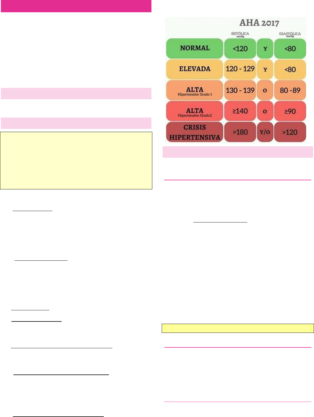 Bruna Pinto HIPERTENSION ARTERIAL SISTEMICA Niveles de presión arterial por encima de los valores normales. Cuanto más altos sean los valores de presión, mayores serán los riesgos de morbimortalidad de cardiovascular. Prevalencia de hipertensión en la población adulta de 20 a 44% Más frecuente en tercera y cuarta décadas de la vida, y la incidencia aumenta con Edad avanzada. FACTORES DE RIESGO Edad Etnia – negros Sal Obesidad Sedentarismo Fumar/Alcohol CAUSAS Y CLASIFICACION Hipertensión arterial esencial (95% de los pacientes) – Etiología desconocido (multifactorial y multicausal). Hipertensión secundaria (5% de los pacientes): la causa puede ser definido. HTA resistente – sin controle con + de 3 fármacos. Crisis ↑PA + síntomas y/o lesión en órgano diana. ➜ Causas renales: enfermedad del parénquima renal (glomerulonefritis Pielonefritis crónica aguda y crónica, riñones poliquísticos, nefropatía diabética, uropatía obstructiva, hidronefrosis), renovascular (estenosis de la arteria renal, arteritis intrarrenal), rumores Riñones productores de renina, retención primaria de sodio. ➜ Causas endócrinas: acromegalia, hipotiroidismo, hipertiroidismo, hiperparatiroidismo (hipercalcemia), rumores de células cromafines, síndrome carcinoide, feocromocitoma, síndrome Cushing, hiperaldosteronismo primaria, hiperplasia suprarrenal congénita. ➜ Causa vascular: coartación de la aorta. ➜ Trastornos del SNC: apnea del sueño, aumento de la presión intracraneal, porfiria aguda, disautonomía familiar, síndrome de Guillain-Barré. ➜ Enfermedad hipertensiva del embarazo: en el 7 al 10% en el tercer semestre de embarazo, acompañado proteinuria y, eventualmente, edema e hiperuricemia. ➜ Estrés agudo pre o posquirúrgico: hipoglicernia, quemaduras, pancreatitis, crisis de drepanocitosis de glóbulos rojos, posresucitación cardíaco, síndrome de abstinencia de alcohol u otros drogas, hiperventilación psicógena. ➜ Medicamentos y otras sustancias: anticonceptivos hormonales, corticosteroides, antiinflamatorios no esteroideos (AINE), descongestionantes nasales, antidepresivos tricíclicos, anfetaminas, cocaína, ciclosporina, eritropoyetina, bebidas alcohólicas. FISIOPATOLOGIA 1º MECANISMO: HORMONAL – SIST. RENINA- ANGIOTENSINA-ALDOSTERONA. Cel. Yuxtaglomerulares controla con la enzima pro-renina inactiva ➜ cuando ↓flujo ↓Na+ se convierte en renina y tiene la función de cambiar la proteína angiotensinógeno (presente en varias ubicaciones, ej: hígado) ➜ en angiotensina I (AI) ↳ Inactiva se cambia por la ECA en AII y esa tiene la acción metabólica de ligarse en AT1R. 1. Activa el SNC simpático ➜ libera catecolaminas (adrenalina, noradrenalina, dopamina) 2. Endotelio ➜ disfunción musculo liso por inflamación 3. Cel. Del miocardio ➜ crecimiento y fibrosis (dilatación) 4. Riñón ➜ retención de H20 y Na+ 5. Cortez adrenal ➜ aldosterona, fibrosis y retención de H20 y Na+ En resumo: vasoconstricción y retención de H20 y Na+ 2º MECANISMO: NEURAL – SNC SIMPATICO Estimula Liberación de renina ↑ reabsorción de H20 Y Na+ en túbulo T Vasoconstricción 3º MECANISMO: RENAL – CURVA PRESSION X NATRIURESE. Para la eliminación de Na+ las personas con HTA necesitan de una mayor PA. Y también existe personas sal sensibles, donde el bajo consumo de sal ya provoca el aumento de PA. Bruna Pinto SIGNOS Y SÍNTOMAS ➢ Asintomático u oligosintomatico (manifestaciones clínicas después de los primeros 15 a 20 años de evolución, asociado con complicaciones). ➢ Dolor de cabeza, acúfenos, mareos, palpitaciones, poliuria y nicturia. ➢ Disnea de esfuerzo ➢ Alteración del sueño ➢ Diferencia en las características semiológicas de los pulsos de miembros superiores e inferiores (coartación de la aorta). ➢ Crisis catecolaminicas (feocromocitoma). EXÁMENES COMPLEMENTARIOS (BÁSICOS) HMG Glucosa en sangre en ayunas Perfil lipidico Creatinina Na+ / k+ Ácido úrico en plasma Creatinina/Urea Orina tipo I + eas + albuminuria ECG Fundo de ojo Otros exámenes cuando se necesite una evaluación adicional. ➜ Detallado para tratamiento y seguimiento (hematocrito y hemoglobina, microalbúmina uria, prueba ergometrica, ecodoppler cardiograma, MAPA). En la sospecha de hipertensión son exámenes complementarios secundarios dependen de la sospecha diagnóstica. DIAGNÓSTICO posición sentada del pcte, con piernas descruzadas apoyadas. Sin ejercicio físico previo <1h, sin cafeína, sin fumar <30min. Vejiga vacía, brazo a nivel del corazón desnudo. En consultorio: 3x Hipotensión ortostática: queda significativa ≥ 20/10mmHg en ancianos – dm (neuropatia) MRPA: Medida residencial: 3x mañana; 3x noche; x 5 dias. ≥135x85 MAPA: a casa 15-20min x24h; vigília ≥135x85; media ≥130x80; sono ≥120x70 ➢ Normal en casa + consultorio: normo tensión ➢ Alta consultorio + normal en casa: HTA bata blanca ➢ Normal consultorio + casa alto: HTA mascarada ➢ Todos alta: HTA COMPLICACIONES ➢ Hipertrofia del ventrículo izquierdo (ecg/eco) ➢ Disfunción del ventrículo izquierdo (diastólica y sistólica) ➢ Arteriopatía coronaria ➢ Accidente vascular cerebral ➢ Enfermedad arterial periférica ➢ nefropatía hipertensiva (ERC 3: 30-60ml/mil/1,73) ➢ Retinopatía hipertensiva ¿QUE HACER? realizar estratificación de riesgo y estadificación de la hipertensión arterial. necesidad de tratamiento no farmacológico (TNF) y / o farmacológico (TF). • Tratamiento no farmacológico: apto para todos los pacientes hipertensos y personas con PA normal/ limítrofe. • Tratamiento farmacológico: cuando el TNF no es suficiente para la normalización de la PA y /o en presencia de factores de riesgo asociado y / o daño a órganos diana. • Obtener el cumplimiento del tratamiento por parte del paciente. MEV – “MODIFICACIÓN DE ESTILO DE VIDA”. ➜ Bajar peso ➜ menos alcohol ➜ Atv. Física ➜ buena alimentación FÁRMACO