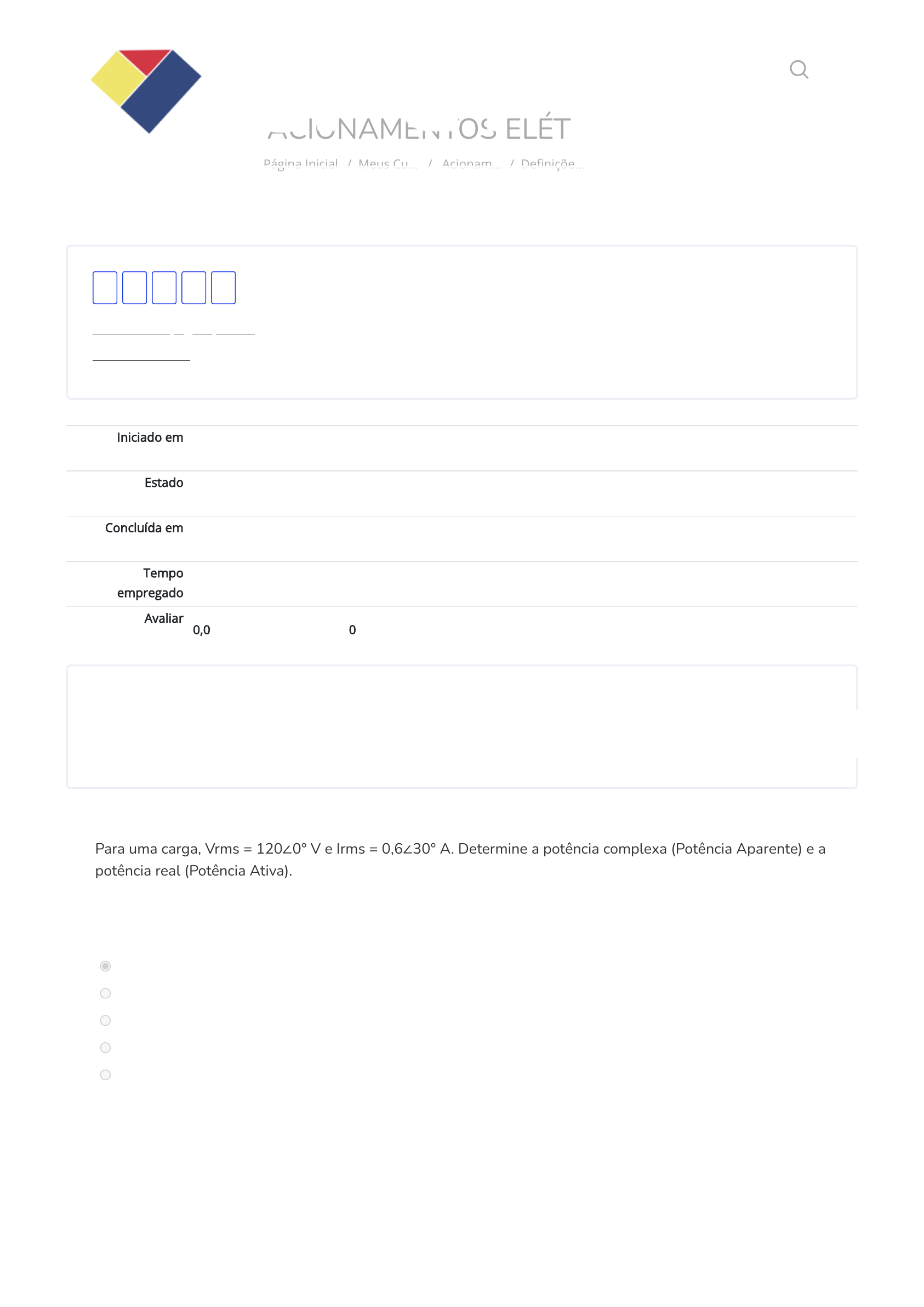 09/11/2021 12:47 Exercício de Fixação - Definições de potência elétrica: Revisão da tentativa https://cpetead.com.br/mod/quiz/review.php?attempt=1821731&cmid=52397 1/5 ACIONAMENTOS ELÉTRICOS Página Inicial / Meus Cu… / Acionam… / De�niçõe… / Exercício… Iniciado em terça, 9 Nov 2021, 12:39 Estado Finalizada Concluída em terça, 9 Nov 2021, 12:47 Tempo empregado 8 minutos 27 segundos Avaliar 0,0 de um máximo de 10,0(0%) QUESTÃO Incorreto Atingiu 0,0 de 2,0 Mostrar uma página por vez Terminar revisão 1 2 3 4 5 1 Para uma carga, Vrms = 120∠0° V e Irms = 0,6∠30° A. Determine a potência complexa (Potência Aparente) e a potência real (Potência Ativa). Escolha uma opção: a. 72∠-30° VA e 31W. b. 72∠-30° VA e 62W. c. 36∠30° VA e 31,17W. d. 51∠-30° VA e 31,17W. e. 72∠30° VA e 18W. Sua resposta está incorreta. A resposta correta é: 72∠-30° VA e 62W. https://cpetead.com.br/ https://cpetead.com.br/course/view.php?id=2092 https://cpetead.com.br/mod/quiz/view.php?id=52397 https://cpetead.com.br/mod/quiz/review.php?attempt=1821731&cmid=52397&showall=0 https://cpetead.com.br/mod/quiz/view.php?id=52397 https://cpetead.com.br/ 09/11/2021 12:47 Exercício de Fixação - Definições de potência elétrica: Revisão da tentativa https://cpetead.com.br/mod/quiz/review.php?attempt=1821731&cmid=52397 2/5 QUESTÃO Incorreto Atingiu 0,0 de 2,0 QUESTÃO Incorreto Atingiu 0,0 de 2,0 2 Para dimensionar condutores elétricos, deve-se considerar uma série de fatores, entre eles a maneira da instalação, a corrente de projeto (Ip), o tipo de condutor, o número de condutores carregados, o fator de correção de temperatura, o fator de correção de agrupamento, etc. Calcule a corrente de projeto de um circuito para alimentação de um motor monofásico de 0,5CV e tensão nominal de 127V, cujo fator de potência é de 0,85. Escolha uma opção: a. 4,21A b. 2,50A c. 3,41A. d. 3,05A. e. 2,89A. Sua resposta está incorreta. A resposta correta é: 3,41A. 3 Uma carga em série drena uma corrente i(t) = 3 cos (100 π t + 10°) A quando uma tensão de 150 cos (100 π t + 30°) é aplicada. Determine a potência aparente (S) e o fator de potência da carga (FP), respectivamente. Escolha uma opção: a. 180VA - FP = 0,851. b. 154VA - FP = 0,809. c. 422VA - FP = -0,342 d. 200VA - FP = 0,809. e. 225VA - FP = 0,766 Sua resposta está incorreta. A resposta correta é: 225VA - FP = 0,766 09/11/2021 12:47 Exercício de Fixação - Definições de potência elétrica: Revisão da tentativa https://cpetead.com.br/mod/quiz/review.php?attempt=1821731&cmid=52397 3/5 QUESTÃO Não respondido Vale 2,0 ponto(s). 4 Em determinada instalação elétrica, uma carga absorve 3,5kW, o que resulta em potência aparente de 5.000VA. Determine qual o fator de potência dessa instalação. Escolha uma opção: a. 0,700 b. 0,714 c. 1,42 d. 0,95 e. 1 Sua resposta está incorreta. A resposta correta é: 0,700 09/11/2021 12:47 Exercício de Fixação - Definições de potência elétrica: Revisão da tentativa https://cpetead.com.br/mod/quiz/review.php?attempt=1821731&cmid=52397 4/5 QUESTÃO Incorreto Atingiu 0,0 de 2,0 5 Em uma planta industrial, é necessário o correto dimensionamento de um ramal de alimentação para um motor, cujas informações estão contidas a seguir. Para dimensionar tal ramal, calcule os valores da potência ativa, reativa e aparente, respectivamente, para o referido motor. Escolha uma opção: a. 901W – 629Var – 1.099VA. b. 805W – 748Var – 1.099VA. c. 805W – 629Var – 1.100VA. d. 1.099W – 750Var – 805VA. e. 748W – 805Var – 1.099VA. Sua resposta está incorreta. A resposta correta é: 748W – 805Var – 1.099VA. ◄ Conteúdo de Estudo - De�nições de potência elétrica Seguir para... Potencia ativa, reativa, e aparente. Entenda! ► Quem somos Cursos Certi�cação Unidades Contato http://lrq.sagah.com.br/uasdinamicas/uploads/layouts/1484266591_1570566925f2f4f3ea1637373b0cb78d42d6a8b159ce38f99c.jpg https://cpetead.com.br/mod/lti/view.php?id=52425&forceview=1 https://cpetead.com.br/mod/url/view.php?id=61059&forceview=1 https://www.cpet.com.br/quem-somos-cpet-cursos-tecnicos-a-distancia-ead/ https://www.cpet.com.br/course-cat/cursos/cursos-online/ https://www.cpet.com.br/certificacao-cpet/ https://www.cpet.com.br/unidades-cpet/ https://www.cpet.com.br/contato/ 09/11/2021 12:47 Exercício de Fixação - Definições de potência elétrica: Revisão da tentativa https://cpetead.com.br/mod/quiz/review.php?attempt=1821731&cmid=52397 5/5 Copyright © 2021 CPET - Centro de Pro�ssionalização e Educação Técnica https://www.facebook.com/CPET-Centro-de-Profissionaliza%C3%A7%C3%A3o-e-Educa%C3%A7%C3%A3o-T%C3%A9cnica-1039179026236475/ https://twitter.com/soucpet/ https://www.instagram.com/soucpet/