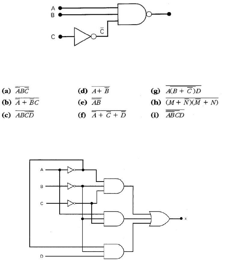 SEL0414 – Sistemas Digitais Prof. Dr. Marcelo A. C. Vieira Lista 3 – Álgebra de Boole 1) Determine a expressão de saída para o circuito da figura 1 e simplifique-a usando os teoremas de DeMorgan. FIGURA1 2) Simplifique cada uma das seguintes expressões usando os teoremas de DeMorgan. FIGURA2 3) Converta o circuito da figura 3 para um circuito que use apenas portas NAND. FIGURA 3 4) Um avião a jato emprega um sistema de monitoração dos valores de rpm, pressão e temperatura dos seus motores usando sensores que operam conforme descrito a seguir: a. Saída do sensor RPM = 0 apenas quando a velocidade for < 4800rpm; b. Saída do sensor P=0 apenas quando a pressão for < 1,33N/m2 c. Saída do sensor T=0 apenas quando a temperatura for < 93,3°C A figura 4 mostra o circuito lógico que controla a lâmpada de advertência dentro da cabine para certas condições da máquina. Admita que um nível ALTO na saída W ative a luz de advertência. i. Determine quais condições do motor indicam um sinal de advertência ao piloto. ii. Troque esse circuito por outro que contenha apenas portas NAND. FIGURA 4 5) Simplifique as expressões abaixo utilizando a álgebra de Boole. FIGURA 5 6) Simplifique o circuito lógico da figura 6. FIGURA 6