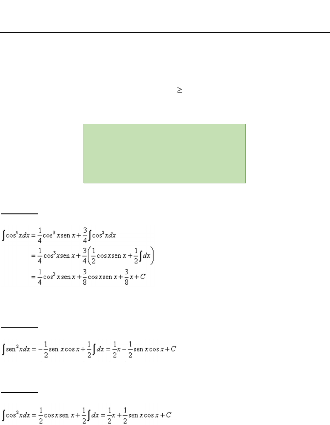 INTEGRAIS DE FUNÇÕES TRIGONOMÉTRICAS Integrais de potência de senos e cossenos A integração por partes pode ser usada para obter as fórmulas de redução para integrais. Estas fórmulas expressam uma integral com potência de função em termos de uma integral que envolve uma potência mais baixa daquela função. Por exemplo, se n for um inteiro positivo e n 2, então a integração por partes pode ser usada para obter as fórmulas de redução. ● xdxsen n n xxsen n xdxsen nnn 21 1 cos. 1 ● xdx n n senxx n xdx nnn 21 cos 1 .cos 1 cos Exemplo 1 Exemplo 2 Exemplo 3 Exemplo 4 Calcule ∫ sen xdx 𝑠𝑒𝑛 𝑥𝑑𝑥 = − 1 3 𝑠𝑒𝑛 𝑥𝑐𝑜𝑠𝑥 + 2 3 𝑠𝑒𝑛𝑥𝑑𝑥 = − 𝑠𝑒𝑛 𝑥𝑐𝑜𝑠𝑥 − 𝑐𝑜𝑠𝑥 + 𝑐 Integração de potências de tangentes e de secantes O procedimento para integração de potências de tangente e de secante segue paralelamente os do seno e cosseno. A ideia é usar as seguintes fórmulas de redução para reduzir o expoente do integrando até que a integral resultante possa ser calculada: ● xdxtg n xtg xdxtg n n n 2 1 1 ● xdx n n n tgxx xdx n n n 2 2 sec 1 2 1 .sec sec Exemplo 5 𝑡𝑔 𝑥𝑑𝑥 = 1 2 𝑡𝑔 𝑥 − 𝑡𝑔𝑥𝑑𝑥 = 𝑡𝑔 𝑥 − 𝑙𝑛|𝑠𝑒𝑐𝑥| + 𝑐 Exemplo 6 ∫ 𝑠𝑒𝑐 𝑥𝑑𝑥 = 𝑠𝑒𝑐𝑥𝑡𝑔𝑥 + ∫ 𝑠𝑒𝑐𝑥𝑑𝑥 = 𝑠𝑒𝑐𝑥𝑡𝑔𝑥 + 𝑙𝑛|𝑠𝑒𝑐𝑥 + 𝑡𝑔𝑥| + 𝑐 Exemplo 7 ∫ 𝑡𝑔 𝑥𝑑𝑥 = 𝑡𝑔 𝑥 − ∫ 𝑡𝑔²𝑥𝑑𝑥 = 𝑡𝑔 𝑥 − (𝑡𝑎𝑔𝑥 − ∫ 𝑡𝑔 𝑥𝑑𝑥) = 𝑡𝑔 𝑥 − 𝑡𝑎𝑔𝑥 + 𝑥 + 𝑐 Integração de produtos de senos e cossenos Se m e n são inteiros positivos, então a integral xdxxsen nm cos. pode ser calculada de diversas maneiras, dependendo de m e n serem pares ou ímpares. xdxxsen nm cos. Existem regras que devemos seguir quando aparecem problemas da seguinte forma, elas são: xdxxsen nm cos. Procedimento ímpar é n ● Separe um fator de xcos . ● Aplique a identidade: xsenx 22 1cos . ● Faça a substituição: senxu . ímpar é m ● Separe um fator de senx . ● Aplique a identidade: xxsen 22 cos1 . ● Faça a substituição: xu cos . par é par é n m ● Aplique as identidades: )2cos1( 2 12 xxsen )2cos1( 2 1 cos2 xx . Exemplo 8 Exemplo 9 ∫ 𝑠𝑒𝑛 𝑥𝑐𝑜𝑠 𝑥 𝑑𝑥 = ∫ 𝑑𝑥 = ∫(1 − 𝑐𝑜𝑠²2𝑥)𝑑𝑥 = ∫ 𝑑𝑥 − ∫ 𝑐𝑜𝑠²2𝑥𝑑𝑥 = 𝑥 − ∫ 𝑑𝑥 = 𝑥 − ∫ 𝑑𝑥 − ∫ 𝑐𝑜𝑠4𝑥𝑑𝑥 = 𝑥 − 𝑥 − 𝑠𝑒𝑛4𝑥 + 𝑐 = 𝑥 − 𝑠𝑒𝑛4𝑥 + 𝑐 Exemplo10 ∫ 𝑠𝑒𝑛³𝑥𝑐𝑜𝑠𝑥𝑑𝑥 = ∫ 𝑠𝑒𝑛 𝑥 𝑠𝑒𝑛𝑥 𝑐𝑜𝑠𝑥𝑑𝑥 = ∫(1 − 𝑐𝑜𝑠 𝑥) 𝑠𝑒𝑛𝑥 𝑐𝑜𝑠𝑥𝑑𝑥 𝑢 = 𝑐𝑜𝑠𝑥 𝑑𝑢 = −𝑠𝑒𝑛𝑥𝑑𝑥 ∫ −(1 − 𝑢 )𝑢𝑑𝑢 = − ∫(𝑢 − 𝑢 )𝑑𝑢 = − + + 𝑐 = − + + 𝑐 Produtos de tangentes e secantes Abaixo aprenderemos a calcular integrais de produtos de tangentes e secantes, que serão encontradas da seguinte maneira: xdxxtg nm sec. Precisamos observar o “m” e o “n” da função para sabermos como resolver, podemos observar a tabela abaixo: xdxxtg nm sec. Procedimento par é n ● Separe um fator de x2sec . ● Aplique a identidade: 1sec 22 xtgx . ● Faça a substituição: tgxu . ímpar é m ● Separe um fator de tgxx.sec . ● Aplique a identidade: 1sec22 xxtg . ● Faça a substituição: xu sec . ímpar é par é n m ● Use a identidade 1sec22 xxtg para reduzir o integrando às potencias de xsec . ● Use as fórmulas de redução. Exemplo 11 Exemplo 12 Exemplo 13 Integrais da forma: ∫ 𝑠𝑒𝑛(𝑚𝑥) cos(𝑛𝑥) 𝑑𝑥, ∫ 𝑠𝑒𝑛(𝑚𝑥) cos(𝑛𝑥) 𝑑𝑥 e ∫ 𝑐𝑜𝑠(𝑚𝑥) cos(𝑛𝑥) 𝑑𝑥 Podem ser encontradas usando as identidades trigonométricas: ● 𝑠𝑒𝑛𝛼. 𝑐𝑜𝑠𝛽 = [𝑠𝑒𝑛(𝛼 − 𝛽) + 𝑠𝑒𝑛(𝛼 + 𝛽)] ● 𝑠𝑒𝑛𝛼. 𝑠𝑒𝑛𝛽 = [𝑐𝑜𝑠(𝛼 − 𝛽) − 𝑐𝑜𝑠(𝛼 + 𝛽)] ●𝑐𝑜𝑠𝛼. 𝑐𝑜𝑠𝛽 = [𝑐𝑜𝑠(𝛼 − 𝛽) + 𝑐𝑜𝑠(𝛼 + 𝛽)] Exemplo 14 ∫ 𝑠𝑒𝑛7𝑥 𝑐𝑜𝑠3𝑥 𝑑𝑥 = ∫ 𝑠𝑒𝑛(7𝑥 − 3𝑥) + 𝑠𝑒𝑛(7𝑥 + 3𝑥) 𝑑𝑥 = ∫(𝑠𝑒𝑛4𝑥 + 𝑠𝑒𝑛10𝑥)𝑑𝑥 = − 𝑐𝑜𝑠4𝑥 − 𝑐𝑜𝑠10𝑥 + 𝑐
