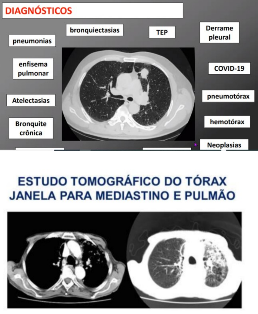 Imagem Aplicada a Prática Clínica TEP – COVID x Vidro Fosco – Mosaico – Enfisema - Nas patologias de hoje o RX não é o melhor para diagnóstico, neste caso o melhor é a TC. - A esquerda temos uma janela de mediastino, a direita uma janela de pulmão. - A janela de mediastino é a de escolha para ver TEP (tromboembolismo pulmonar). · TROMBOEMBOLISMO PULMONAR (TEP): SINAIS MAIS PROVÁVEIS PELO RX – não é o mais indicado): Sinal de Pala: aumento do calibre da artéria pulmonar, provocando opacidade. Sinal ou Corcova de Hampton: opacidade triangular mais próxima da borda (representa um infarto da área pulmonar pois o TEP não foi removido). Sinal de Westermark: obstrução das pequenas veias, tornando difícil a sua visualização, chegando até a desaparecer. Pode estar localizada em qualquer lugar do pulmão. TOMOGRAFIA: - Setas vermelhas indicam o local da TEP (esses locais eram pra estar brancos por inteiro, a TEP é representada pela área cinza). - Trombo em sela: aparece na bifurcação e tem esse formato em forma de linha, é mais sutil e pode até sumir em algumas situações. - Tomar cuidado com a diluição arterial de contraste (ver vídeo). https://www.youtube.com/watch?v=nu2XIHGXwwY · CORONAVÍRUS: ACHADOS IMPORTANTES NA TC: - Opacidade em vidro fosco evoluindo para área de consolidação (é quase sempre certa essa evolução). - Predominantemente em região periférica e posterior, e na maioria das vezes poupa a região subpleural. - Dilatação dos bronquíolos. - Acomete praticamente todos os lobos. - Acometimento multifocal e aspecto de mosaico em determinadas áreas. - Visualiza-se broncograma aéreo (característico das áreas consolidadas). Considerações: - Achados inespecíficos, ou seja, características imaginológicas observadas me outras doenças (ex: pneumonia em organização – POC). - É importante correlacionar com os achados clínicos, propedêutica, epidemiologia. RX e TC contribuem para essa investigação. - Imagem da direita – janela de pulmão: sombras mais “brancas” indistintas nas áreas periféricas, mais presentes nas regiões posteriores dos pulmões direito e esquerdo. É um parênquima mais opacificado em relação a transparência do parênquima normal (representada pelas setas pretas). - Imagem da esquerda – janela de pulmão: lesões principalmente nos lobos médios e posterior. No pulmão esquerdo é possível a visualização de uma grande opacidade (seta branca) e também se visualizam alguns broncogramas aéreos. - Na imagem da direita é a mesma visualização de grande opacidade na área de pulmão esquerdo. - Na imagem da direita, sua visualização também é possível. Opacidade em vidro fosco: aumento da atenuação pulmonar sem obscurecer o contorno de estruturas vasculares e brônquicas. - Preenchimento parcial o espaço aéreo e/ou colapso parcial de estruturas vasculares – achado inespecífico. Aumento da transparência pulmonar-mosaico: - Aparência em retalho de regiões com atenuações distintas que pode representar doença parenquimatosa de pequenas vias aéreas ou vascular oclusiva. - Aprisionamento aéreo secundário à obstrução brônquica ou bronquiolar produz redução da atenuação que se acentuam nas imagens de TC obtidas em fase expiratória – faz inspiratório e expiratório para comparação. - Na doença de pequenas vias aéreas e vascular oclusiva as áreas com atenuação diminuída são as anormais e geralmente contêm vasos pulmonares em número e tamanho menor que o pulmão normal adjacente, que pode ter atenuação normal ou aumentada (por causa do redirecionamento do fluxo sanguíneo). - O padrão de atenuação em mosaico pode também ser produzido por doença pulmonar parenquimatosa, caracterizada por opacidade em vidro fosco - as áreas de maior atenuação representam as regiões acometidas e as outras zonas caracterizam focos de pulmão preservado. - Imagem representando o mosaico. Áreas de aprisionamento de ar estão mais escuras na parte anterior do pulmão esquerdo, para avaliar faz inspiratório e expiratório. - TC de tórax com reconstruções coronal (em A) e sagital (em B) mostrando áreas de diferentes atenuações no parênquima pulmonar. Os cortes em expiração podem evidenciar o aprisionamento aéreo. Observar também opacidades reticulares (cobrinhas brancas fininhas) e bronquiectasias nas bases pulmonares. AUMENTO DA TRANSPARÊNCIA PULMONAR: Aprisionamento aéreo> - Retenção de excesso de gás (ar) em todo ou em parte do pulmão especialmente durante a expiração – resultado de uma obstrução parcial ou completa de vias aéreas ou secundaria a uma anormalidade focal da complacência pulmonar. - Reconhecido na fase expiratória como uma redução da atenuação do parênquima pulmonar. - Observar o aprisionamento na imagem de expiração (direita) demonstrada pelas setas brancas. · MOSAICO: - Radiografia de tórax, com achado de espessamento de trama vasobrônquica e TC de tórax com achado de infiltrado com vidro fosco bilateral, entremeado de parênquima normal e algumas áreas esparsas de consolidação, sendo este achado um sugestivo da chamada pavimentação em mosaico. - A pavimentação em mosaico é um padrão radiológico que pode ser encontrado na TC de alta resolução de pulmões, que consiste em áreas de opacidade em vidro fosco, com septos interlobulares espessados de intermeio. - A sua descrição clássica é em pacientes com proteinose alveolar pulmonar, mas este mesmo padrão também é descrito em pacientes com pneumocistose, carcinoma bronquíolo-alveolar, pneumonia lípidica, edema pulmonar entre outras condições. - Imagem de vidro-fosco na parte mais centro-lobular no pulmão direito (áreas mais esbranquiçadas) e áreas reticulares. · ENFISEMA PULMONAR: - Destruição alveolar. - Forma aprisionamento de ar em determinados espaços que antes eram ocupados por alvéolos. - Avaliar a presença de enfisema em pacientes n