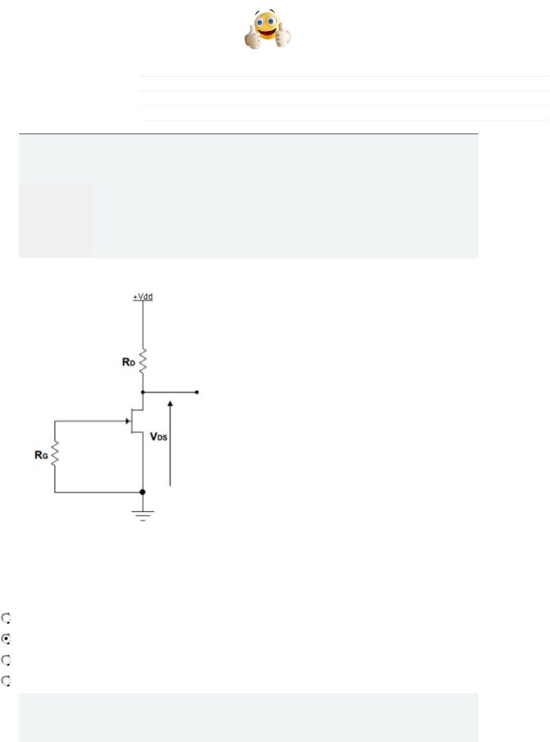 Amigo se o conteúdo foi útil para você dê o seu, vai me ajudar bastante. Obrigado! Iniciado em terça, 23 Nov 2021, 20:31 Estado Finalizada Concluída em terça, 23 Nov 2021, 20:35 Tempo empregado 3 minutos 46 segundos Avaliar 10,00 de um máximo de 10,00(100%) Parte superior do formulário Questão 1 Completo Atingiu 5,00 de 5,00 Marcar questão Texto da questão Para o Amplificador a seguir, calcule Vds: DADOS: Idss = 6mA Vp = - 4 V Vdd = 12 V Rd = 1K Escolha uma opção: 4V 6,0V 5V 3V Questão 2 Completo Atingiu 5,00 de 5,00 Marcar questão Texto da questão Para o FET do circuito abaixo, determine Id (em m A) para Vgs=-2V: Resposta: Parte inferior do formulário Amigo se o conteúdo foi útil para você dê o seu, vai me ajudar bastante. Obrigado! 2,5