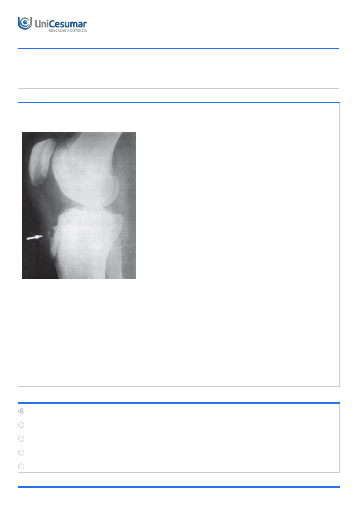 12/12/2021 22:53 Unicesumar - Ensino a Distância 1/7 ATIVIDADE 2 - SAÚDE - ANATOMIA HUMANA - 51/2021 Período:08/03/2021 08:00 a 27/04/2021 23:59 (Horário de Brasília) Status:ENCERRADO Nota máxima:1,00 Gabarito:Gabarito será liberado no dia 28/04/2021 00:00 (Horário de Brasília) Nota obtida:0,80 1ª QUESTÃO Um menino com 8 anos de idade apresenta dor na região de crescimento do joelho direito com aumento de volume na tuberosidade da tíbia. O exame radiológico (vista lateral) demonstra toda a região de extremidade (seta) com imagem de irregularidade do contorno ósseo. Fonte: MAGGE, D. J. Avaliação músculo-esquelética. São Paulo: Manole, 2005. Baseado nesse achado, analise as afirmativas a seguir. I. A região apontada pela seta representa a epífise proximal da tíbia, e sua parte central é chamada de diáfise. II. Ossos como a tíbia são chamados de ossos curtos ou triangulares e têm predomínio do comprimento em relação à largura e à espessura. III. Enquanto a epífise proximal fica mais distante do cíngulo do membro, a epífise distal fica mais próxima dele. É correto o que se afirma em: ALTERNATIVAS I, apenas. III, apenas. I e II, apenas. II e III, apenas. I, II e III. 2ª QUESTÃO 12/12/2021 22:53 Unicesumar - Ensino a Distância 2/7 A drenagem linfática manual ou mecânica tem sido amplamente utilizada com o objetivo de aumentar o volume e a velocidade da linfa a ser transportada pelos vasos e ductos linfáticos, por meio de manobras que imitam o bombeamento fisiológico. Ela tem influência direta no aumento da oxigenação dos tecidos, favorece a eliminação de toxinas e metabólitos, aumenta a absorção de nutrientes por meio do trato digestório, aumenta a quantidade de líquidos a ser eliminada, melhora as condições de absorção intestinal, dentre outras funções. Adaptado de: https://www.sbd.org.br/dermatologia/pele/procedimentos/drenagem-linfatica/19/. Acesso em: 2 abr. 2020. Frente a essas informações, avalie as afirmações a seguir e assinale a alternativa correta. ALTERNATIVAS A linfa é um líquido incolor presente no espaço intersticial, resultante das trocas entre o sangue dos capilares e o tecido, sendo coletada pelos vasos linfáticos, que a transporta para o sangue. Do mesmo modo que o sangue, a linfa é bombeada através dos vasos linfáticos pelo coração, contudo, como o seu fluxo é menos intenso, o procedimento de drenagem linfática melhora a sua circulação. Como a linfa é essencialmente formada pelo excesso de fluído que saiu do capilar, mas não retornou à circulação sanguínea, sua composição é idêntica à do plasma, contendo água, proteínas, eletrólitos, leucócitos, hemácias e plaquetas. Considerando que os vasos linfáticos estão localizados superficialmente, logo abaixo da pele, as manobras realizadas pelos profissionais de saúde no sentido de melhorar a drenagem da linfa é possível. A linfa coletada pelos vasos e ductos linfáticos é destinada para a circulação sanguínea, onde terminam o ducto linfático direito e o ducto torácico, nas artérias subclávias direita e esquerda, respectivamente. 3ª QUESTÃO O sistema circulatório permite o transporte de substâncias, regulação térmica e atividade imunológica em virtude da função cardíaca, que propele o sangue ao longo de uma extensa rede vascular. O átrio direito forma a borda direita do coração e recebe sangue rico em dióxido de carbono por meio de vasos sanguíneos específicos. Diante dessa informação, analise as afirmações e assinale a que for correta. BARBOSA, C. P. Anatomia Humana. Maringá: Unicesumar, 2019. ALTERNATIVAS O sangue retorna para o átrio direito por meio das veias pulmonares direitas e esquerdas. O retorno sanguíneo para o átrio direito ocorre por meio da aorta ascendente e aorta descendente. O sangue retorna ao átrio direito pelas veias cava superior e inferior. O retorno do sangue para o átrio direito ocorre por meio do tronco pulmonar. O sangue retorna para o átrio direito por meio das coronárias direita e esquerda. 4ª QUESTÃO 12/12/2021 22:53 Unicesumar - Ensino a Distância 3/7 De acordo com Watanabe e Erhart (2009), além do canal alimentar, o sistema digestório apresenta órgãos anexos que auxiliam indiretamente na digestão, pois, embora os alimentos não transitem por tais órgãos, eles produzem secreções contendo enzimas essenciais à digestão. WATANABE, L. S.; ERHART, E. A. Erhart: elementos de anatomia humana. 10. ed., São Paulo: Atheneu, 2009. Sobre o que compõe o sistema digestório, assinale a alternativa correta: ALTERNATIVAS O timo é considerado um órgão anexo do sistema digestório, pois secreta a timosina. Esta secreção é lançada no duodeno e age, principalmente, sobre gorduras. O fígado é considerado um órgão anexo do sistema digestório, pois secreta a bile. Esta secreção é lançada no duodeno e age, principalmente, sobre gorduras. O pâncreas é considerado um órgão anexo do sistema digestório, pois secreta a bile. Esta secreção é lançada no duodeno e age, principalmente, sobre gorduras. O pâncreas é considerado um órgão anexo do sistema digestório, pois secreta o suco pancreático. Esta secreção é lançada no duodeno e age, principalmente, sobre os carboidratos. As glândulas salivares são consideradas órgãos anexos do sistema digestório, pois secretam a saliva. Esta secreção é lançada diretamente na cavidade oral e age, principalmente, sobre as proteínas. 5ª QUESTÃO 12/12/2021 22:53 Unicesumar - Ensino a Distância 4/7 Observe a imagem a seguir, atentando-se para as estruturas anatômicas numeradas de 1 a 7. Fonte: Shutterstock. BARBOSA, C. P. Anatomia Humana. Maringá: Unicesumar, 2019. Em referência à imagem anterior, assinale a alternativa correta: ALTERNATIVAS A estrutura representada pelo número 7 é o rim. A estrutura representada pelo número 6 é o útero. A estrutura representada pelo número 5 produz o hormônio 