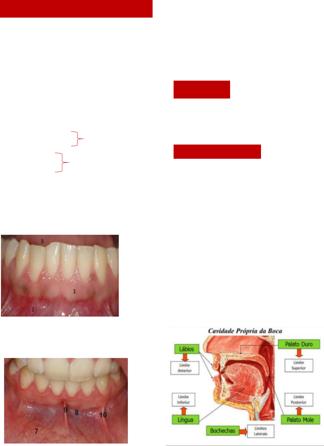 Anatomia Lavínia Prado Boca → Primeiro segmento do sistema digestório → Via de ingestão de alimentos → Abertura pela qual o alimento entra no tubo digestivo → Comunicação com o meio externo e interno (faringe) Divisão da Boca: Processos Alveolares Mucosas Arcos Dentais Vestíbulo da boca Cavidade própria da boca 1. Mucosa alveolar 2. Vestíbulo da boca 3. Cavidade própria da boca Vestíbulo da boca 7. Mucosa labial 8. Fórnice de vestíbulo 9. Freio labial inferior 10. Freio lateral Vestíbulo da Boca: é o espaço semelhante a uma fenda entre os dentes e a gengiva e os lábios e as bochechas – espaço virtual, só visualizados de os lábios forem puxados Cavidade Própria da Boca: é o espaço entre os arcos dentais superior e inferior, onde fica a língua Boca Delimitada por 6 paredes: Parede anterior (1) – lábio Paredes laterais (2) – bochechas Parede superior (1) – palato duro Paredes posterior (1) – palato mole Paredes inferior (1) – soalho de boca Anatomia da cavidade oral Anatomia Lavínia Prado Estruturas Externas dos Lábios Parede Anterior: (formada pelos lábios) 1. Sulco nasolabial 2. Sulco labiomentoniano 3. labiomarginal Processo de envelhecimento ( sulcos mais marcados) 1. Sulco nasolabial 2. Sulco labiomentoniano Estruturas Externas dos Lábios Parede Anterior: (formada pelos lábios) 1. Filtro 2. Tubérculo do lábio 3. Vermelhão do lábio 4. Rima da boca 5. Ângulo da boca 6. Comissura labial Parede Anterior: (formada pelos lábios) 1. Gengiva livre 2. Gengiva inserida Parede Anterior: (formada pelos lábios) 1.Junção mucogengival 2.Papila interdental Anatomia Lavínia Prado 1. Papila retromolar 2. Papila interdental Freio labial superior – 1 1. Freio lateral superior 2. Freio lateral inferior VESTÍBULO DA BOCA 7 – Mucosa labial 8 – Fórnice de vestíbulo 9 – Freio labial inferior 10 – Freio lateral inferior Freio labial lateral superior – 1 Freio labial lateral inferior – 2 Freio labial de baixa inserção Necessidade de alívio na peça protética – adaptação Freio labial -Antes da frenectomia Após frenectomia Anatomia Lavínia Prado Parede Lateral: (Bochechas) Corpo adiposo da bochecha - 1 Prega pterigomandibular – 2 Papila parotídea – 3 Região do Palato duro: a) Papila incisiva b) Pregas palatinas transversas c) Rafe palatina d) Mucosa 1. Pregas palatinas transversas 2. Papila incisiva 3. Rafe palatina Retalho palatino Necrose palatina por anestesia Parede Posterior: (Palato Mole) Região do Palato Mole: 1. Arco palatoglosso 2. Arco palatofarígeo 3. Tonsilas palatinas 4. Prega pterigomandibular 5. Úvula 6. Istmo da garganta Parede Inferior: ( Língua e Soalho de Boca) Parede Inferior: Soalho de boca 1. Prega franjada 2. Carúncula sublingual 3. Prega sublingual 4. Freio da língua
