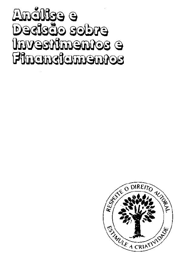 EDITORA ATLAS S.A. Rua Conselheiro Nébias, 1384 (Campos Elísios) 01203-904 São Paulo (SP) Tel.: (011) 221-9144 (PABX) http://www.editora-atlas.com.br PAULO ROBERTO VAMPRÉ HUMMEL MAURO ROBERTO BLACK TASCHNER Engenharia Econômica -Teoria e Prática Ampliada com Modelo de Determinação da Inflação Interna da Empresa e Modelo de Resolução com Taxa de Inflação Múltipla 4ª Edição SÃO PAULO EDITORA ATLAS S.A. — 1995 © 1986 by EDITORA ATLAS S.A. Rua Conselheiro Nébias, 1384 (Campos Elísios) 01203-904 São Paulo (SP) Tel.: (011) 221-9144 (PABX) 1. ed. 1986; 2. ed. 1988; 3. ed. 1992; 4. ed. 1995; 33 tiragem ISBN 85-224-1220-0 Impresso no Brasil/Printed in Brazil Depósito legal na Biblioteca Nacional conforme Decreto nº 1.825, de 20 de dezembro de 1907. TODOS OS DIREITOS RESERVADOS - É proibida a reprodução total ou parcial, de qualquer forma ou por qualquer meio. A violação dos direitos de autor (lei nº 9.610/98) é crime estabelecido pelo artigo 184 do Código Penal. Capa: Paulo F. Leite Dados Internacionais de Catalogação na Publicação (CIP) (Câmara Brasileira do Livro, SP, Brasil) Hummel, Paulo Roberto Vampré, - Análise c decisão sobre investimentos c financiamentos: engenharia econômica: teoria c prática / Paulo Roberto Vampré Hummel, Mauro Roberto Black Taschner. — 4. cd. ampl. com modelo de determinação da inflação interna da empresa e modelo de resolução com taxa de inflação múltipla. — São Paulo : Atlas, 1995. Bibliografia ISBN 85-224-1220-0 1. Engenharia econômica 2. Investimentos — Análise 3. Investimentos - Brasil 4. Matemática financeira 1. Taschner, Mauro Roberto Black, — II. Título. 95-0025 CDD-658.152 Índices para catálogo sistemático: 1. Análise de desempenho: Investimentos: Administração financeira 658.152 2. Investimentos: Análise financeira: Administração de empresas 658.152 Dedicamos este livro a nossas mulheres e filhos, a quem agradecemos pela paciência e pelo estí- mulo com que sempre nos brindaram. Os Autores Sumário Prefácio, 11 Apresentação à segunda edição, 13 Apresentação à primeira edição, 15 Parte 1 TEORIA BÁSICA DA ENGENHARIA ECONÔMICA, 19 1 INTRODUÇÃO Â ENGENHARIA ECONÔMICA, 21 1.1 Introdução, 21 1.2 Planejamento de estudos econômicos, 23 1.2.1 Uma decisão por sentimento, 23 1.2.2 Uma análise econômica, 24 1.2.3 Decisão: escolha entre alternativas, 24 1.3 Princípios fundamentais da Engenharia Econômica, 25 1.3.1 Não existe decisão a ser tomada considerando-se alternativa única, 25 1.3.2 Só se podem comparar alternativas homogêneas para se po- der comparar o seu resultado, 25 1.3.3 Apenas as diferenças de alternativas são relevantes, 26 1.3.4 Os critérios para decisão entre alternativas econômicas devem reconhecer o valor no tempo do dinheiro, 26 1.3.5 Não devem ser esquecidos os problemas relativos ao raciona- mento do capital, 26 1.3.6 Decisões separáveis devem ser tomadas separadamente, 26 1.3.7 Deve-se sempre atribuir certo peso para os graus relativos de incerteza associados às previsões efetuadas, 27 1.3.8 As decisões devem levar também em consideração os eventos qualitativos não quantif icáveis monetariamente, 27 1.3.9 Realimentação de informações, 27 7 1.3.10 Dados econômicos/gerenciais, 27 1.4 Limitações do estudo, 28 2 CONCEITOS BÁSICOS, 29 2.1 Equivalência, 29 2.2 Juros, 31 2.3 Taxa de juros, 31 2.4 Juros compostos, 32 2.4.1 Juros nominais, 32 A — Pagamento de juros antecipados, 32 B — Pagamento de juros sobre o total e hão sobre o saldo devedor, 33 2.5 Conceitos adicionais, 33 2.5.1 Fluxo de caixa, 33 2.5.2 Símbolos, 34 3 CÁLCULO DE JUROS COMPOSTOS, 35 3.1 Cálculos dos fatores de juros compostos, 35 3.1.1 Fator de valor futuro para pagamento único, 35 3.1.2 Fator de valor atual para pagamento único, 37 3.1.3 Fator de valor futuro de uma série uniforme de pagamentos, 38 3.1.4 Fator de fundo de amortização, 40 3.1.5 Fator de valor atual para série uniforme, 41 3.1.6 Fator de recuperação de capital, 42 3.1.7 Fatores para série gradiente, 44 Exercícios, 46 4 MÉTODOS EQUIVALENTES PARA COMPARAÇÃO DE ALTERNATIVAS, 49 4.1 Introdução, 49 4.2 Custo anual, 50 4.2.1 Alternativas com mesma vida econômica, 50 4.2.2 Alternativas com vidas econômicas diferentes, 53 4.3 Método do valor presente, 57 4.3.1. Alternativas com vidas econômicas iguais, 58 4.3.2 Alternativas com vidas econômicas diferentes, 61 4.4 Método da taxa de retorno - comparação de alternativas com investi- mentos iguais, 66 4.5 Taxa de retorno — comparação de alternativas com investimentos dife- rentes: Taxa de retorno incrementai, 69 Exercícios, 738 Parte 2 APLICAÇÕES PRÁTICAS, 79 5 ANÁLISE DE ALTERNATIVAS MÚLTIPLAS, 81 5.1 Introdução, 81 5.2 Análise de problemas de alternativas mutuamente exclusivas sem limi- tação de capital, 82 5.3 Comparação de alternativas mutuamente exclusivas tecnicamente,com disponibilidade de capital, porém sem retorno, 84 5.4 Análise de problemas de alternativas múltiplas considerando-se grupos não exclusivos de alternativas mutuamente exclusivas tecnicamente, com limitação de capital, 85 Exercícios, 93 6 SUBSTITUIÇÃO DE EQUIPAMENTO, 98 6.1 Introdução, 98 6.2 Problema relativo a compra de equipamento similar, 99 6.3 Problema onde não haverá reposição de equipamento, 100 6.4 Problema em que haverá reposição com equipamento idêntico, 102 6.5 Substituição de equipamento devido a mudanças nas exigências de serviço, 104 6.6 Considerações a respeito da análise de investimento antes ou depois do Imposto de Renda, 106 6.7 Problema de substituição de equipamento usado, mas com vida útil remanescente por um equipamento diferente, 107 6.8 Análise de quando se deve substituir um equipamento em utilização por outro modelo tecnicamente superior, 112 Exercícios, 118 7 LEASING, 123 7.1 Conceito, 123 7.2 Vantagens do leasing, 124 7.3 Desvantagens do leasing, 124 7.4 Operação do leas