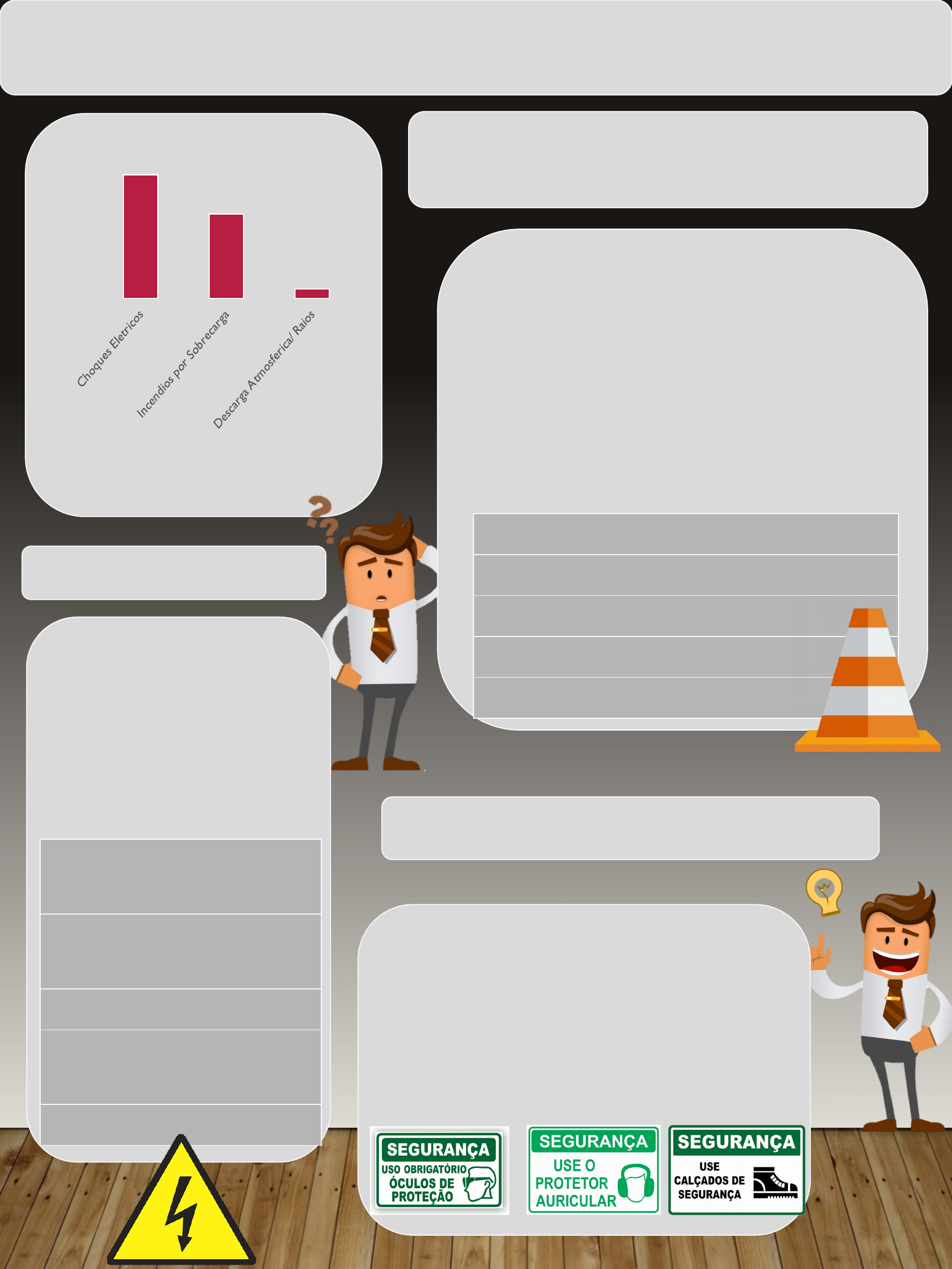 Como Evitar? De acordo com a NR 6 é dever de todos os empregadores fornecer Equipamentos de Proteção Individual [ EPI ] Capacete de Segurança Classe B Luva Isolante de Alta Tensão Óculos de Proteção Vestimenta Antichamas Protetor Auricular Oque são Equipamentos de Proteção Coletiva? [ EPC ] Cones Fitas de Sinalização Extintores de Incêndio Manta Isolante Grade Metalica Dobrável Diferentemente dos EPIs, Os equipamentos de proteção Coletiva garantem tanto a segurança Dos colaboradores quanto a de outras Pessoas presentes no local, Também Chamados de EPCs, eles são muito Importantes, principalmente em áreas Onde há bastante movimento. Sempre faça o uso do EPI Para sua segurança, sempre que For preciso frequentar qualquer Ambiente que ofereça risco use os Equipamentos de proteção Adequados para sua função e fique Atento a sinalização do local! Como prevenir acidentes no ambiente de trabalho? Em 2021 dos 853 acidentes de choque elétrico, 691 tiveram vítimas fatais 1 Acidentes Eletricos na Industria Brasileira Acidentes Eletricos na Industria Choques Eletricos Incendios por Sobrecarga Descarga Atmosferica/ Raios 56.7 38.799999999999997 4.3