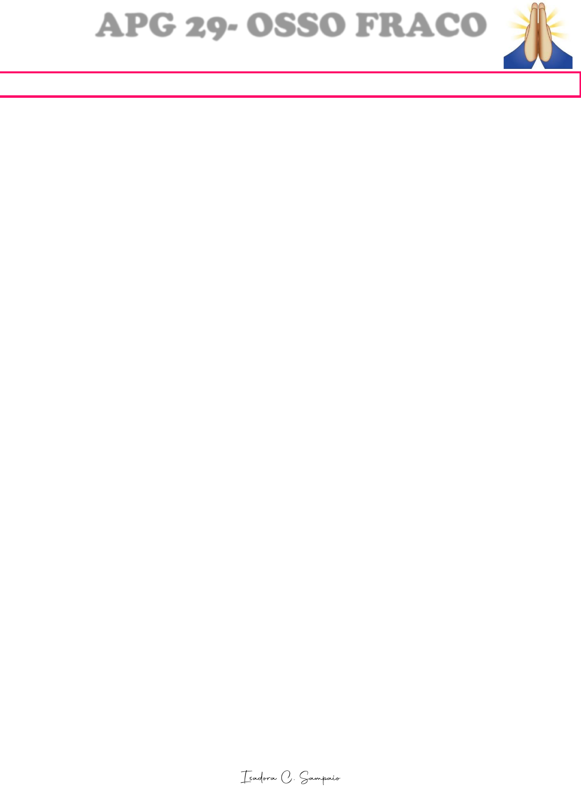Função do osso na homeostasia do cálcio Os ossos são o principal reservatório de cálcio do corpo, armazenando 99% do cálcio corporal total. Controlar as taxas de reabsorção de cálcio do osso para o sangue e de depósito de cálcio do sangue no osso é uma maneira de manter o nível de cálcio sanguíneo. Tanto as células nervosas quanto as musculares dependem de um nível estável de íons cálcio (Ca 2+ ) no líquido extracelular para funcionar de maneira adequada. A coagulação sanguínea também requer Ca 2+ . Ademais, muitas enzimas precisam de Ca 2+ como cofator (uma substância extra necessária para que uma reação enzimática ocorra). Por isso, o nível plasmático de Ca 2+ é muito bem regulado entre 9 e 11 mg/100 mℓ. Mesmo pequenas variações na concentração de Ca 2+ fora dessa faixa podem ser fatais –parada cardíaca se a concentração estiver muito elevada, assim como parada respiratória se o nível cair muito. A função do osso na homeostasia do cálcio é ajudar a “tamponar” o nível de Ca 2+ sanguíneo, liberando Ca 2+ no plasma sanguíneo (usando os osteoclastos) quando o nível diminui e absorvendo Ca 2+ (usando os osteoblastos) quando o nível aumenta. A troca de Ca 2+ é regulada por hormônios, sendo o paratormônio (PTH), secretado pelas glândulas paratireoides o mais importante deles. Esse hormônio aumenta o nível de Ca 2+ sanguíneo. A secreção de PTH opera via sistema de retroalimentação (feedback) negativa. Se algum estímulo faz com que o nível sanguíneo de Ca 2+ caia, as células da glândula paratireoide (receptores) detectam essa alteração e intensificam sua produção de uma molécula conhecida como monofosfato de adenosina cíclico (AMP cíclico). O gene para o PTH no núcleo de uma célula da glândula paratireoide (o centro de controle) detecta o aumento intracelular do AMP cíclico. Em consequência disso, a síntese de PTH aumenta e mais PTH é liberado no sangue. A presença de níveis mais elevados de PTH aumenta a quantidade e a atividade dos osteoclastos (efetores), acelerando o ritmo de reabsorção óssea. A liberação resultante de Ca 2+ do osso para o sangue trás de volta o nível sanguíneo de Ca 2+ ao normal. O PTH também atua nos rins (efetores) para diminuir a perda de Ca 2+ pela urina, aumentando a calcemia. Além disso, o PTH estimula a formação de calcitriol (a forma ativa da vitamina D), um hormônio que promove a absorção de cálcio dos alimentos do sistema digestório para o sangue. Essas duas ações também ajudam a elevar o nível de Ca 2+ do sangue. Um outro hormônio atua para diminuir o nível de Ca 2+ sanguíneo. Quando o Ca 2+ do sangue sobe acima do normal, células parafoliculares na glândula tireoide secretam calcitonina (CT). A CT inibe a atividade dos osteoclastos, intensifica a captação de Ca 2+ sanguíneo pelo osso e acelera a deposição de Ca 2+ nos ossos. O resultado final é que a CT promove a formação óssea e diminui o nível de Ca 2+ do sangue. Apesar desses efeitos, a função da CT na homeostasia do cálcio normal é incerta, pois pode estar completamente ausente sem causar sintomas. Todavia, a calcitonina proveniente do salmão é efetiva no tratamento da osteoporose porque retarda a reabsorção óssea. APG 29- OSSO FRACO METABOLISMO OSSEO Envelhecimento e tecido ósseo Desde o nascimento até a adolescência, mais tecido ósseo é produzido do que perdido durante a remodelação óssea. Em adultos jovens, as taxas de deposição e reabsorção óssea são mais ou menos as mesmas. Com o declínio do nível dos hormônios sexuais na meia-idade, especialmente depois da menopausa, ocorre diminuição da massa óssea porque a reabsorção óssea realizada pelos osteoclastos ultrapassa a deposição óssea feita pelos osteoblastos. Na velhice, a perda óssea por reabsorção ocorre mais rápido do que o ganho. Uma vez que os ossos das mulheres geralmente são menores e menos compactos do que os dos homens, a perda de massa óssea nos idosos tipicamente exerce um efeito adverso maior sobre as mulheres. Esses fatores contribuem para a incidência mais elevada de osteoporose em mulheres. O envelhecimento exerce dois grandes efeitos sobre o tecido ósseo: perda de massa óssea e fragilidade. A perda de massa óssea resulta da desmineralização, que consiste na perda de cálcio e outros minerais da matriz óssea extracelular. Essa perda normalmente começa depois dos 30 anos nas mulheres, acelera bastante por volta dos 45 anos com a diminuição dos níveis de estrogênio e persiste, com cerca de 30% do cálcio dos ossos perdidos por volta dos 70 anos. Uma vez iniciada a perda óssea na mulher, cerca de 8% da massa óssea é perdida a cada 10 anos. Nos homens, em geral, a perda de cálcio não começa antes dos 60 anos de idade e cerca de 3% de massa óssea é perdida a cada 10 anos. A perda de cálcio dos ossos é um dos problemas na osteoporose. O segundo grande efeito do envelhecimento sobre o sistema esquelético, a fragilidade, decorre de uma taxa mais baixa da síntese de proteína. Lembre-se de que a parte orgânica da matriz extracelular óssea, sobretudo as fibras de colágeno, confere ao osso sua resistência à tração. A perda da resistência à tração faz com que os ossos se tornem muito frágeis e suscetíveis à fratura. Em algumas pessoas idosas, a síntese de fibras de colágeno é mais lenta, em parte devido à produção menor do hormônio de crescimento. Além do aumento da suscetibilidade a fraturas, a perda de massa óssea também ocasiona deformidade, dor, diminuição da altura e perda dos dentes. Exercício e tecido ósseo Dentro de um certo limite, o tecido ósseo possui a capacidade de alterar sua resistência em resposta a alterações de estresse mecânico. Quando submetido à tensão, o tecido ósseo se torna mais forte pelo aumento da deposição de sais minerais e da produção de fibras de colágeno pelos osteoblastos. Sem a tensão m