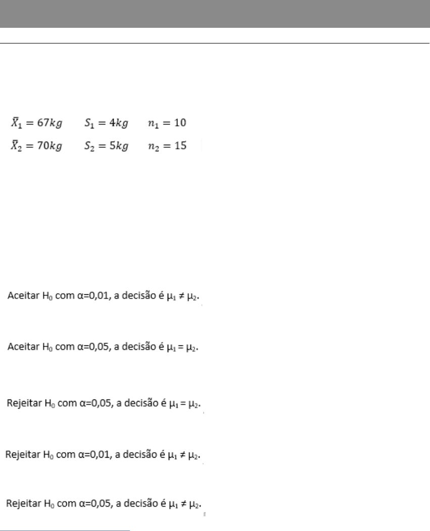 Prova Online Disciplina: 100987 - MÉTODOS QUANTITATIVOS ESTATÍSTICOS Abaixo estão as questões e as alternativas que você selecionou: Top of Form QUESTÃO 1 Para verificar se as médias de dois grupos de pessoas podem ser consideradas iguais, calculamos as médias e os desvios-padrões das duas amostras, obtendo-se os seguintes valores de pesos: Considerando o teste bilateral, assinale a alternativa que apresenta a decisão correta. a ) b ) c ) d ) e ) Ver justificativa da resposta QUESTÃO 2 Determine o IC de 95% para a média da população dos pesos de pessoas com base nas observações de uma amostra de 9 pessoas cujas medidas resultaram em uma média amostral de 70kg e um desvio-padrão de 5kg. Assinale a alternativa correta. a ) (66,2; 73,8). b ) (66,3; 73,7). c ) (67,0; 73,0). d ) (66,7; 73,3). e ) (66,9; 73,1). Ver justificativa da resposta QUESTÃO 3 Duas urnas têm bolas pretas e brancas segundo a configuração a seguir: Sorteia-se uma urna ao acaso e dela se extrai uma bola ao acaso, verificando-se que a bola é preta. Qual é a probabilidade de a bola ter vindo da urna 1? Assinale a alternativa correta. a ) 7/23 b ) 3/7 c ) 9/21 d ) 7/21 e ) 9/23 Ver justificativa da resposta QUESTÃO 4 Preencha as lacunas com as palavras adequadas. ___________ do parâmetro ? é qualquer ___________ das observações da amostra, g(X1, X2, ...,Xn). O valor de g(X1, X2, ..., Xn) para uma particular amostra é chamado de __________. Assinale a alternativa correta. a ) Um estimador, função, estimativa. b ) Uma função, estimador, estimativa. c ) Um estimador, estimativa, função. d ) Uma estimativa, função, estimador. e ) Uma estimativa, estimador, função. Ver justificativa da resposta QUESTÃO 5 Uma fila de banco recebe clientes com uma taxa de 30 clientes por hora em um processo de Poisson. Qual é a probabilidade de chegarem exatamente 30 clientes em uma hora? Assinale a alternativa correta. a ) 0,075. b ) 0,082. c ) 0,072. d ) 0,062. e ) 0,052. Ver justificativa da resposta QUESTÃO 6 As técnicas da análise exploratória de dados (AED) ou estatística descritiva contribuem para aumentar a eficácia da análise estatística de forma fácil e rápida. As principais técnicas da AED são: (I) Tabelas de frequência; (II) Gráficos estatísticos; (III) Medidas descritivas. Assinale a alternativa correspondente às asserções corretas. a ) I e III. b ) Somente III. c ) I e II. d ) I, II e III. e ) II e III. Ver justificativa da resposta QUESTÃO 7 Relacione a coluna da esquerda com a coluna da direita acerca de métodos de estimação: I.Método que funciona de forma a encontrar aquele valor do parâmetro que maximiza a probabilidade de obter a amostra observada. (a) Método dos momentos II.Método que consiste em montar um sistema de equações com tantas equações quanto forem os parâmetros a estimar. (b) Método da máxima verossimilhança III.Método desenvolvido por Fisher em 1920. Assinale a alternativa que relaciona corretamente os itens das duas colunas. a ) I(b); II(a); III(b). b ) I(a); II(b); III(b). c ) I(b); II(a); III(a). d ) I(a); II(b); III(a). e ) I(a); II(a); III(b). Ver justificativa da resposta QUESTÃO 8 Assinale a alternativa que completa corretamente as lacunas da sentença a seguir. Além da mediana que divide um grupo de dados ordenados em duas partes iguais, existem outras medidas que também são chamadas de separatrizes porque dividem um rol em quatro partes de 25%, dividem um rol em dez partes de 10% e dividem o rol em 100 partes de 1%. Essas medidas são chamadas respectivamente de __________, ____________, ___________. a ) decis, quartis e percentis. b ) quartis, decis e percentis. c ) decis, percentis e quartis. d ) quartis, percentis e deices. e ) percentis, decis e quartis. Ver justificativa da resposta QUESTÃO 9 Sobre o coeficiente de correlação pode-se afirmar que: Assinale a alternativa correspondente às asserções corretas. a ) Somente II. b ) Somente I. c ) I e III. d ) II e III. e ) I e II. Ver justificativa da resposta QUESTÃO 10 Associe as informações da coluna à esquerda com as técnicas apresentadas na coluna à direita: I.Possibilita melhor visualização das principais características de uma amostra. II.Fornece informações importantes sobre o conjunto de dados, como tendência central e variabilidade. III.Apropriada para resumir um grande conjunto de dados, agrupando informações em categorias. (a) Tabelas de frequências (b) Gráficos (c) Medidas descritivas Assinale a alternativa correta. a ) I (c); II (a); III (b). b ) I (a); II (b); III (c). c ) I (b); II (c); III (a). d ) I (b); II (a); III (c). e ) I (a); II (c); III (b). Ver justificativa da resposta QUESTÃO 11 Os testes adequados para a comparação de duas amostras independentes são: I.Teste Z; II.Teste "t" de Student; III.Teste de Wilcoxon. Assinale a alternativa correspondente às asserções corretas. a ) II e III. b ) I e III. c ) Somente I. d ) Somente II. e ) I e II. Ver justificativa da resposta QUESTÃO 12 Assinale a alternativa que completa corretamente a sentença. Na expressão para o cálculo do tamanho da amostra a margem de erro está associada a: a ) ?/2 b ) ?/e c ) ? d ) Z?/2 e ) e Ver justificativa da resposta QUESTÃO 13 Qual é o coeficiente que mede a associação entre dois conjuntos de atributos quando um ou ambos os conjuntos são medidas em escala nominal? Assinale a alternativa correta. a ) Coeficiente de explicação. b ) Coeficiente de correlação de Pearson. c ) Coeficiente de determinação. d ) Coeficiente de contingência. e ) Coeficiente de correlação de Spearman. Ver justificativa da resposta QUESTÃO 14 Considere as asserções a seguir: (I) As variáveis aleatórias discretas assumem valores inteiros; (II) A soma de todos P(X = x) pode ser qualquer valor inteiro positivo; (III) Para uma variável aleatória discreta X a probabilidade de X estar entre os valores "a" e "b" é a integral definhada de f(x) entre "a" e "b". Ass