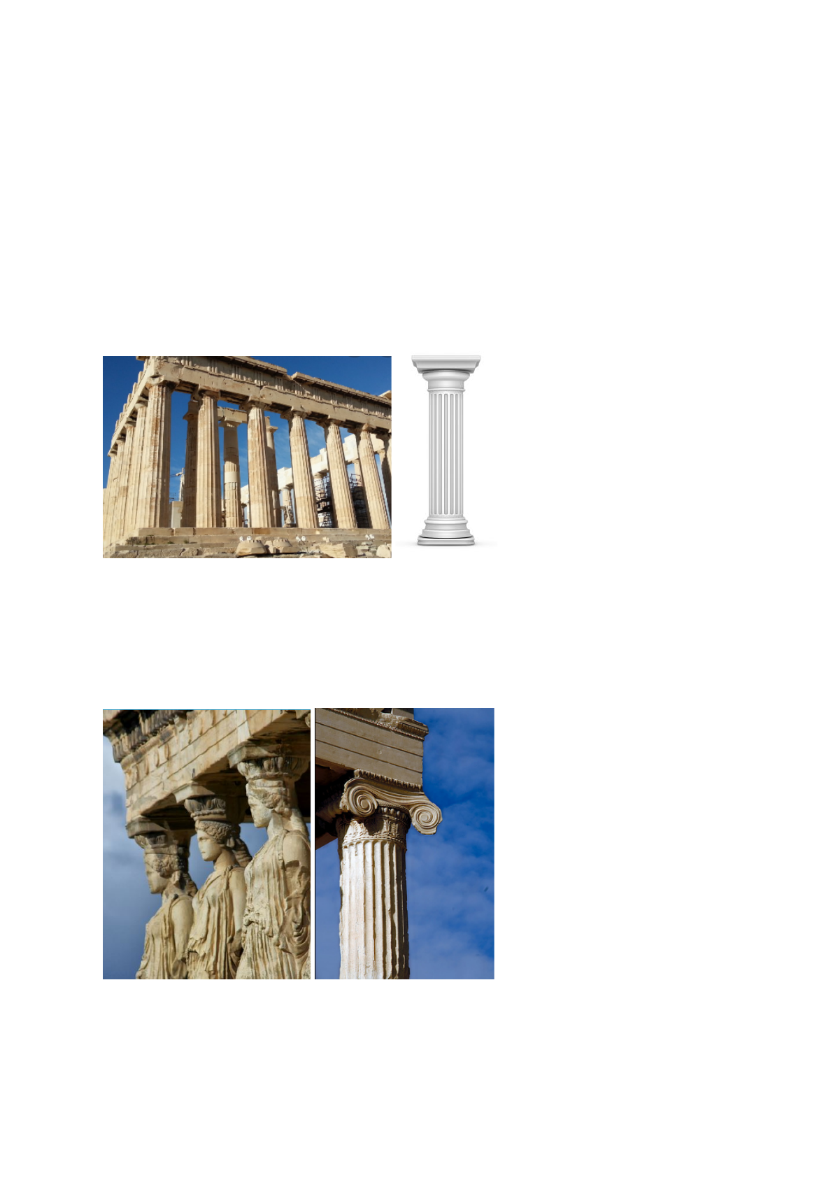 Colunas gregas - tipos: ● Dóricas ● Jônicas ● Coríntias Dóricas: os dóricos eram povos guerreiros, povos helênicos que provocaram a diáspora grega. Vários povos tiveram que migrar com a sua chegada, entre eles, os jônicos. Os dóricos, portanto, deram origem a Esparta, sendo os antepassados dos espartanos. As colunas gregas dóricas procuram passar a ideia de poder, força, então as colunas são mais fechadas em cima, imperiosas e, como foram as primeiras, são mais simples dos que as jônicas e coríntias. Jônicas: as colunas jônicas já são muito mais elaboradas. Elas são maiores do que as dóricas e elas tem uma base maior. Em cima elas têm formatos de pergaminhos. Estas se situavam mais em Atenas. O adorno aqui é maior e elas têm variações: há um tipo de coluna no mundo grego, que são as cariátides, que são estátuas e esculturas de mulheres que substituem o lugar da coluna. As cariátides são um tipo de coluna jônica. Coríntias: Corinto era outra força do mundo grego, uma cidade muito rica e muito importante, pois possuía dois grandes portos, e seu comércio era muito forte. Por ser muito rica, as colunas são as mais elaboradas, são as maiores das três, com mais com adornos, formatos de pergaminhos em cima, com flores, folhas, enfim, são bem detalhadas. As três: