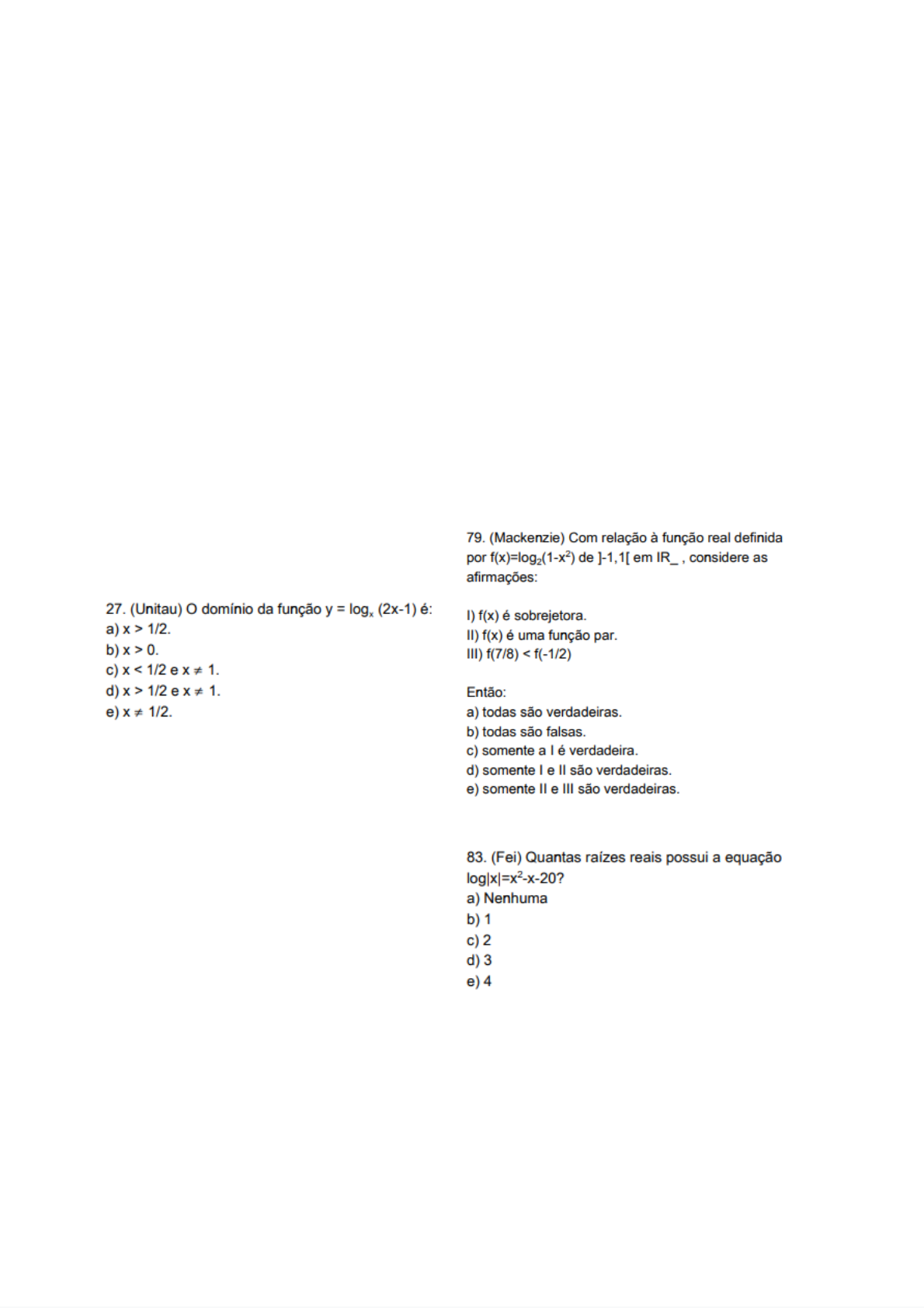 Logaritm�� Equaçõe�, funçõe� � inequaçõe� 1. (Pucsp) Em 1996, uma indústria iniciou a fabricação de 6000 unidades de certo produto e, desde então, sua produção tem crescido à taxa de 20% ao ano. Nessas condições, em que ano a produção foi igual ao triplo da de 1996? (Dados: log 2 = 0,30 e log 3 = 0,48) a) 1998 b) 1999 c) 2000 d) 2001 e) 2002 2. 3. (Fei) Se log 2 = a e log 3 = b, escrevendo log 32/27 em função de a e b obtemos: a) 2a + b b) 2a - b c) 2ab d) 2a/b e) 5a - 3b 4. (Uel) Supondo que exista, o logaritmo de a na base b é a) o número ao qual se eleva a para se obter b. b) o número ao qual se eleva b para se obter a. c) a potência de base b e expoente a. d) a potência de base a e expoente b. e) a potência de base 10 e expoente a. 5. (Ufmg) Os valores de x que satisfazem a equação logₓ (ax + b) = 2 são 2 e 3. Nessas condições, os respectivos valores de a e b são a) 4 e - 4 b) 1 e - 3 c) - 3 e 1 d) 5 e - 6 e) - 5 e 6 6. (Uel) A soma das características dos logaritmos decimais dados por log 3,2; log 158 e log 0,8 é igual a a) -1 b) 0 c) 1 d) 3 e) 5 7. 8. 9. (Ufrs) Dada a expressão S = log 0,001 + log 100, o valor de S é: a) -3 b) -2 c) -1 d) 0 e) 1 10. 11. 12. (Mackenzie) A partir dos valores de A e B mostrados na figura adiante, podemos concluir que: a) A = B/3 b) A = B c) B = A/3 d) A/3 = B/5 e) A/5 = B/3 13. 14. (Fuvest) A figura a seguir mostra o gráfico da função logaritmo na base b. O valor de b é: a) 1/4. b) 2. c) 3. d) 4. e) 10. 15. Um jardineiro cultiva plantas ornamentais e as coloca à venda quando estas atingem 30 centímetros de altura. Esse jardineiro estudou o crescimento de suas plantas, em função do tempo, e deduziu uma fórmula que calcula a altura em função do tempo, a partir do momento em que a planta brota do solo até o momento em que ela atinge sua altura máxima de 40 centímetros. A fórmula é h = 5·log 2 ( t + 1), em que t é o tempo contado em dia e h , a altura da planta em centímetro. A partir do momento em que uma dessas plantas é colocada à venda, em quanto tempo, em dia, ela alcançará sua altura máxima? a) 63 b)96 c)128 d)192 e)255 16.Com o avanço em ciência da computação, estamos próximos do momento em que o número de transistores no processador de um computador pessoal será da mesma ordem de grandeza que o número de neurônios em um cérebro humano, que é da ordem de 100 bilhões. Uma das grandezas determinantes para o desempenho de um processador é a densidade de transistores, que é o número de transistores por centímetro quadrado. Em 1986, uma empresa fabricava um processador contendo 100 000 transistores distribuídos em 0,25 cm 2 de área. Desde então, o número de transistores por centímetro quadrado que se pode colocar em um processador dobra a cada dois anos (Lei de Moore). Disponível em: www.pocket-lint.com. Acesso em: 1 dez. 2017 (adaptado). Considere 0,30 como aproximação para log 10 2. Em que ano a empresa atingiu ou atingirá a densidade de 100 bilhões de transistores? A) 1999 B) 2002 C) 2022 D) 2026 E) 2146 17) Admita que um tipo de eucalipto tenha expectativa de crescimento exponencial, nos primeiros anos após seu plantio, modelado pela função y(t) = a t -1 , na qual y representa a altura da planta em metro, t é considerado em ano, e a é uma constante maior que 1 . O gráfico representa a função y . Admita ainda que y (0) fornece a altura da muda quando plantada, e deseja-se cortar os eucaliptos quando as mudas crescerem 7,5 m após o plantio. O tempo entre a plantação e o corte, em ano, é igual a A) 3. B) 4. C) 6 . D) log 2 7. E) log 2 15. 18)Uma liga metálica sai do forno a uma temperatura de 3 000 °C e diminui 1% de sua temperatura a cada 30 min. Use 0,477 como aproximação para log 10 (3) e 1,041 como aproximação para log 10 (11). O tempo decorrido, em hora, até que a liga atinja 30 °C é mais próximo de A) 22. B) 50. C) 100. D) 200. E) 400. 1. E 2.D 3.E 4.B 5.D 6.C 7.A 8.E 9.C 10.C 11.D 12.C 13.D 14.D 15.C 16.B 17.D 18.E