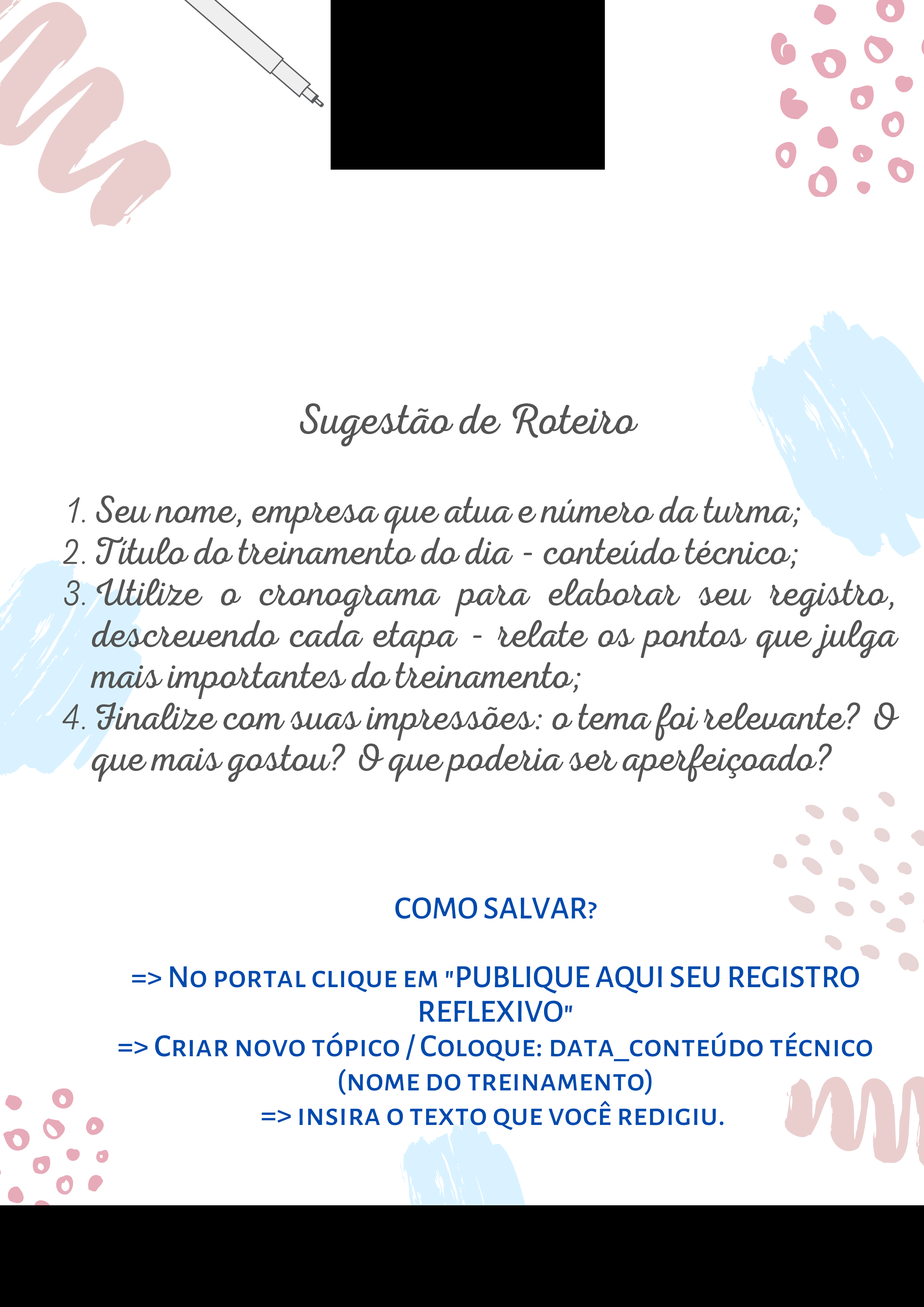 Diário de Bordo ou Registro Reflexivo (como está no portal) é um relatório detalhado do treinamento, com suas impressões / aprendizado. Instrutora Juliana Kanashiro (11) 997885968 juliana.kanashiro@espro.org.br DIÁRIO DE BORDO ORIENTAÇÕES Seu nome, empresa que atua e número da turma; Título do treinamento do dia - conteúdo técnico; Utilize o cronograma para elaborar seu registro, descrevendo cada etapa - relate os pontos que julga mais importantes do treinamento; Finalize com suas impressões: o tema foi relevante? O que mais gostou? O que poderia ser aperfeiçoado? Sugestão de Roteiro 1. 2. 3. 4. COMO SALVAR? => No portal clique em "PUBLIQUE AQUI SEU REGISTRO REFLEXIVO" => Criar novo tópico / Coloque: data_conteúdo técnico (nome do treinamento) => insira o texto que você redigiu.