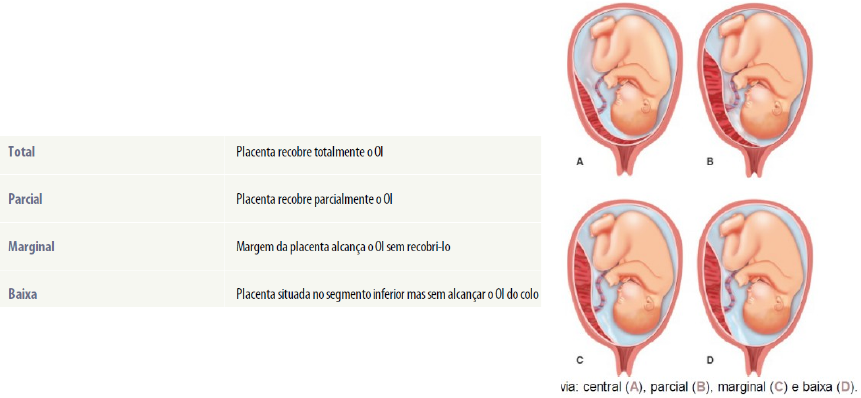 Tema 6 – Sangramento de segunda metade da gestação Placenta prévia Considera-se placenta prévia aquela situada total ou parcialmente no segmento inferior do útero. Sua incidência no termo da gravidez é de 0,5 a 1,0%. Classificação Fatores de risco A cesárea anterior constitui o fator de risco mais importante para a placenta prévia e o risco aumenta progressivamente com o número de procedimentos. Constituem outros fatores de risco: qualquer cicatriz uterina, idade materna avançada, multiparidade, tabagismo e gravidez gemelar. Quadro clínico e diagnóstico Hemorragia. É um sinal pontual e o mais importante. A hemorragia indolor, de sangue vermelho, brilhante, desvinculada de quaisquer esforços ou traumatismos, ocorre em mais de 90% dos casos, em geral despontando no último trimestre. Habitualmente, as perdas se sucedem, hemorragias cada vez mais importantes, pausas que se amiúdam, espoliação maciça pela intensidade ou que, somadas as crises, exsanguinam lentamente a gestante. Exame físico. A palpação é capaz de identificar a estática fetal alterada: situações oblíquas e transversas (15%), apresentação pélvica (15%) e cefálicas altas, por motivo da interposição da placenta entre a cabeça e o andar superior da bacia. A ausculta do abdome revela batimentos cardíacos e a cardiotocografia (CTG) demonstra ser boa a vitabilidade fetal. A exploração digital do canal cervical está proscrita, pois há muito perdeu validade em face da precisão do diagnóstico ultrassonográfico. Exame especular. Confirma, sob visão direta, que a hemorragia tem origem no canal cervical. Parto. A hemorragia tende a crescer de intensidade com o progresso da dilatação, que é proporcional à superfície da placenta descolada. Nas placentas baixas, o sangue tende a deter-se quando se realiza a amniotomia. Secundamento. O acretismo é comum; as retenções placentárias são habituais; a deficiente miocontração do segmento inferior é outro fator a provocar dificuldades nos 3 o e 4 o períodos (atonia e hemorragia). Puerpério. Restos placentários podem permanecer aderidos e se infectar, especialmente pela proximidade entre a zona de inserção e a vagina. A subinvolução uterina e a anemia favorecem o aparecimento da infecção puerperal. Ultrassonografia O diagnóstico da placenta prévia deve ser realizado por ultrassonografia transabdominal de 20 a 24 semanas, mas a confirmação é feita pela ultrassonografia transvaginal, muito mais precisa que a abdominal, bem aceita pela paciente e segura, pois não causa sangramento. Estima-se que cerca de 90% das placentas prévias diagnosticadas na ultrassonografia de 2 o trimestre resolvam-se no exame de 36 semanas, pela expansão do segmento inferior no 2 o e no 3 o trimestre, fenômeno conhecido como “migração placentária”. A despeito de 2/3 das mulheres com placenta prévia sangrarem no período anteparto, esses raramente são episódios graves a ponto de exigirem interrupção da gravidez. Acredita-se que as mulheres com placenta prévia que apresentam sangramento (sintomáticas) e que permaneçam hemodinamicamente estáveis possam ser conduzidas ambulatorialmente. O achado de área sonolucente na margem placentária que recobre o orifício interno (OI) do colo (seio marginal) eleva em 10 vezes o risco de hemorragia grave anteparto. O colo com comprimento < 3 cm, pela ultrassonografia de 3 o trimestre, indica possibilidade elevada de cesárea de emergência, antes de 34 semanas, por sangramento importante anteparto. Pacientes que apresentam distância entre a borda da placenta e o OI ≥ 2 cm podem ser candidatas ao parto vaginal. Aquelas com essa distância < 4 cm (placenta baixa) apresentarão sangramento intenso no pós-parto. Placenta acreta e vasa prévia Duas condições estão intimamente associadas à placenta prévia: placenta acreta e vasa prévia. Elas elevam sobremaneira a morbiletalidade materna e fetal; a acreta, a da mãe; e a vasa prévia, a do feto. Placenta acreta O acretismo placentário descreve placentas anormalmente implantadas, invasivas ou aderidas. A classificação do acretismo baseia-se na profundidade da invasão: placenta acreta adere ao miométrio; increta invade o miométrio; e percreta perfura o peritônio, alcançando, por vezes, órgãos vizinhos como a bexiga e os paramétrios. A placenta acreta corresponde a 80% dos casos de acretismo; a increta, a 15%, e a percreta, a 5%. A incidência de placenta prévia no termo da gravidez é de 0,5 a 1,0%. A elevação do número de cesáreas aumenta a taxa de placenta prévia, e a de acreta acompanha. Quanto maior o número de cesáreas anteriores, maior o risco de placenta acreta. Incidência de acretismo em casos com pplacenta prévia de acordo com o número de cesáreas anteriores Número de cesáreas anteriores Risco de acretismo com placenta prévia (%) 0 3 1 11 2 40 ≥3 >60 Fatores de risco O fator de risco mais importante para o acretismo é a placenta prévia em mulheres cesareadas (placenta prévia-cesárea); e o risco aumenta com o número de procedimentos. A placenta prévia-acreta-cesárea ocorre pela deficiência de decídua basal na zona da cicatriz uterina. Quadro clínico / Ultrassonografia Os principais achados sonográficos sugestivos de acretismo incluem: perda/irregularidade da zona hipoecoica retroplacentária, adelgaçamento do miométrio (< 1 cm), lagos placentários anômalos com fluxo turbulento ao Doppler colorido, hipervascularização ou disrupção da interface serosa-parede vesical com protrusão do tecido placentário para dentro da bexiga. Tanto a ultrassonografia quanto a ressonância magnética (RM) são altamente sensíveis e específicas para diagnosticar ou excluir a placenta acreta. A ultrassonografia é o procedimento de escolha pela praticidade e pelo baixo custo, com sensibilidade de 77 a 87% e especificidade de 96 a 98%). Vasa prévia Na condição conhecida como vasa prévia, os vasos umbilicais curs