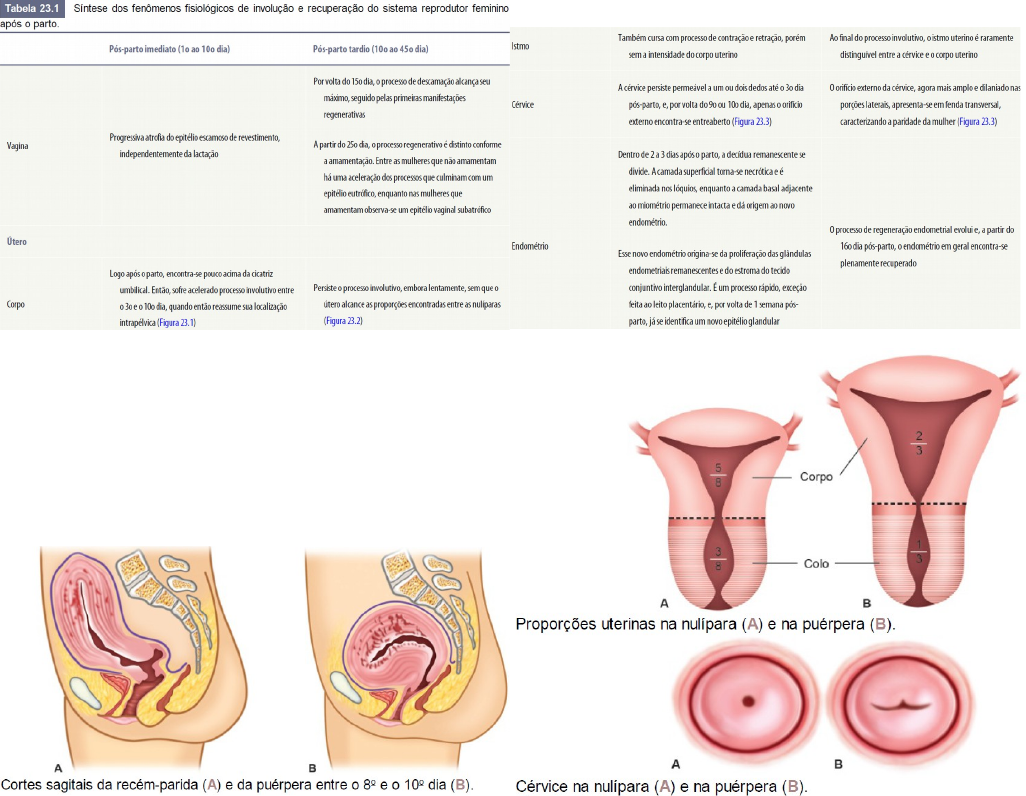 Tema 10: Puerpério e lactação Puerpério O puerpério, também denominado pós-parto, é o período que sucede o parto e, sob o ponto de vista fisiológico, compreende os processos involutivos e de recuperação do organismo materno após a gestação. Embora o caráter gradual e progressivo assumido por essas manifestações torne o puerpério um período de demarcação temporal imprecisa, é aceitável dividi-lo em: pós-parto imediato, do 1º ao 10º dia; pós-parto tardio, do 10º ao 45º dia; e pós-parto remoto, além do 45º dia. Muitos estudos assumem como pós-parto os 12 meses que sucedem o parto. Além da relevância desses mecanismos fisiológicos para o restabelecimento do estado pré-gravídico da mulher, o puerpério é também caracterizado por marcantes mudanças em diversos outros aspectos da vida feminina, sejam eles conjugais, familiares, sociais ou profissionais. Fisiologia do puerpério Sistema reprodutor Enquanto, no pós-parto imediato, prevalece a crise genital, caracterizada por eventos catabólicos e involutivos das estruturas hiperplasiadas e/ou hipertrofiadas pela gravidez, no pós-parto tardio evidenciam-se mais claramente a transição e a recuperação genital, com progressiva influência da lactação. Em relação à involução uterina, ressalte-se a atuação conjunta de diversos mecanismos fisiológicos, que, em última instância, garantem a involução da matriz uterina e evitam quadros de hemorragia pós-parto. Dentre eles, assumem maior importância: · A retração e contração uterinas, as quais acarretam acentuada anemia miometrial e consequente má nutrição e hipoxia celular, e estão também associadas a trombose e obliteração de vasos parietais formados ao longo da gestação. Imediatamente após o parto, mais especificamente com a saída da placenta, esses fenômenos de retração e contração são os principais responsáveis pela hemostasia da ferida placentária e por evitar os quadros de hemorragia pós-parto. É o denominado globo de segurança, o qual permite que as ligaduras vivas de Pinard causem acentuada constrição dos vasos miometriais parietais · O reflexo uteromamário, o qual permite que esses eventos involutivos uterinos ocorram mais intensamente nas mulheres que amamentam. A estimulação dos mamilos e da árvore galactófora acarreta contrações uterinas, identificadas pelas mulheres como cólicas (tortos), em virtude da liberação de ocitocina na circulação sanguínea · O remodelamento dos vasos pélvicos, aqui representados pela circulação uterina e ovariana, cujos calibres retornam progressivamente ao pré-gravídico e contribuem para um estado de isquemia do tecido miometrial hipertrofiado. Esse processo é influenciado significativamente tanto pela contração e retração miometrial quanto pelo desaparecimento da fístula arteriovenosa, representada pela circulação uteroplacentária · O desaparecimento súbito, em crise, dos hormônios placentários. O pós-parto remoto (após 45 dias) é caracterizado pelo retorno da ovulação e da menstruação, eventos marcadamente influenciados pela lactação. Entre as mulheres que não amamentam a menstruação retorna, em média, por volta do 45º dia pós-natal e, ao contrário do que se pensava, é precedida pela ovulação. Nas lactantes, todavia, esses prazos dependem da duração e da frequência do aleitamento. Lóquios A involução e a regeneração do leito placentário, de toda a decídua e das demais superfícies genitais ocorrem, inicialmente, por meio da eliminação de grande quantidade de elementos deciduais e células epiteliais descamados, que, associados a eritrócitos e bactérias, compõem, então, o que denominamos lóquios. Ao longo dos três ou quatro primeiros dias pós-parto, temos os lóquios sanguíneos (lochia cruenta, lochia rubra), em função da considerável presença de sangue. A partir de então, a diminuição do conteúdo sanguíneo leva a lóquios progressivamente serossanguíneos (lochia fusca) – de coloração acastanhada – e, posteriormente, serosos (lochia serosa, lochia flava). Por volta do 10º dia, os lóquios apresentam conteúdo líquido reduzido e significativa quantidade de leucócitos, assumem coloração esbranquiçada ou discretamente amarelada (lochia alba) e mantêm-se dessa forma por 4 a 8 semanas. Em geral, o volume total dos lóquios ao longo de todo esse período varia entre 200 e 500 mℓ. Sistema endócrino No fim da gestação, os níveis de estrogênio e progesterona estão muito elevados, assim como os de prolactina (PRL). Com a saída da placenta, ocorre queda imediata dos esteroides placentários a níveis muito baixos e leve diminuição dos valores de PRL, que permanecem ainda bastante elevados. As gonadotrofinas e os esteroides sexuais atingem seus menores valores nas primeiras 2 a 3 semanas pós-parto. Já os níveis de gonadotrofina coriônica humana (hCG) retornam ao normal 4 a 6 semanas após o parto. Na ausência da lactação, nas primeiras semanas pós-parto, tanto o hormônio luteinizante (LH) como o hormônio foliculoestimulante (FSH) mantêm-se com valores muito baixos, para logo começarem a se elevar lentamente. No início do puerpério, os níveis de estrogênio mantêm-se baixos, e a progesterona não é detectável. A recuperação das gonadotrofinas até os níveis prévios da gravidez depende da ocorrência ou não da amamentação. A amamentação pode inibir a fertilidade pela ação direta do estímulo do mamilo sobre o hipotálamo por via neuroendócrina, elevando a PRL e inibindo o FSH e o LH. Sistema urinário Algum grau de trauma vesical é comum em partos vaginais, especialmente entre mulheres cujos trabalhos de parto foram mais demorados. Embora comumente não cursem com repercussão clínica, esses traumas (especialmente do nervo pudendo), associados à capacidade aumentada e à relativa insensibilidade da bexiga no período pós-parto, podem atuar conjuntame