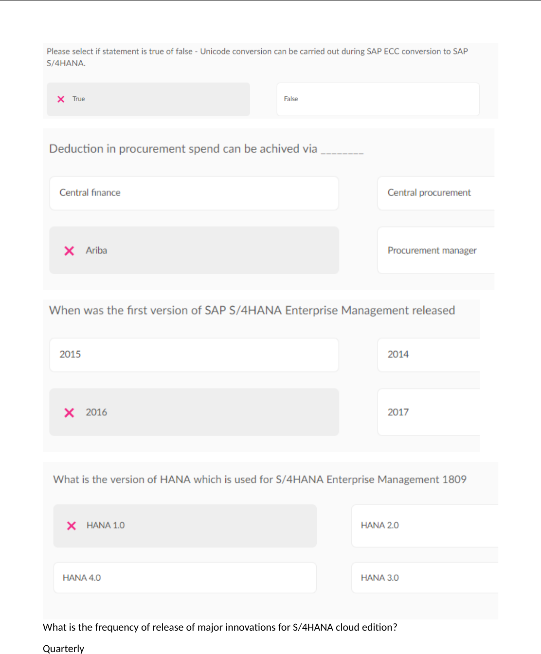 What is the frequency of release of major innovations for S/4HANA cloud edition? Quarterly This study source was downloaded by 100000840182750 from CourseHero.com on 01-16-2022 02:40:17 GMT -06:00 https://www.coursehero.com/file/42084410/SAP-S4HANA-Awareness-Answersdocx/ https://www.coursehero.com/file/42084410/SAP-S4HANA-Awareness-Answersdocx/ Fill in the blanks: ____ is the SAP tool used during prepare phase to check the technical feasibility of moving from SAP ECC to SAP S/4HANA. Software Update Manager (SUM) Please specify if the statement is true or false - 'SAP ACTIVATE consists of three components.' True Specify if SAP Guided Configuration is available for SAP S/4HANA on-premise edition. True What is the first version of SAP S/4HANA Enterprise Management? 1511 What is the version of HANA which is used for S/4HANA Enterprise Management 1809 HANA 2.0 Which was the first application released on SAP HANA? Business wharehouse. Reduced data footprint and faster throughput is one of the many benefits of SAP S/4HANA. True. Which of the below mentioned tools are used during S/4HANA conversion SAP Maintenance Planner Which data management suite provides agile management of data operations in a diverse landscape across organization? SAP Data hub Please select the statements which are true for SAP S/4HANA Cloud edition? Available as software-as-a-service Is automation considered for SAP S/4HANA assessment True Combination of intelligent technologies, services and industry expertise that can help optimize business processes and resources. SAP Leonardo Select the components of TCS assessment framework for SAP S/4HANA All of the options Please select the statements which are true for SAP ACTIVATE? This study source was downloaded by 100000840182750 from CourseHero.com on 01-16-2022 02:40:17 GMT -06:00 https://www.coursehero.com/file/42084410/SAP-S4HANA-Awareness-Answersdocx/ https://www.coursehero.com/file/42084410/SAP-S4HANA-Awareness-Answersdocx/ It is an adoption framework for S/4HANA Please specify if the statement is true or false - 'SAP Best Practices are guidelines provided published on sap.com and refers to lessons learnt from various projects' True Please select the statements which are correct for conversion of SAP ECC to SAP S/4HANA Both options - Universal Journal is mandatory change AND Most of the GUI transactions are still available for use in SAP S/4HANA Please select if statement is true of false - Unicode conversion can be carried out during SAP ECC conversion to SAP S/4HANA. True Select the new applications/ features which are embedded in S/4HANA and is not available in SAP ECC. Credit management. Select the method which cannot be used for transition of SAP ECC to SAP S/4HANA. Replace data Select the key concept on which SAP S/4HANA Embedded Analytics is based on. Virtual Data Models (VDM) based on Core Data Services (CDS) Deduction in procurement spend can be achived via Ariba When was the first version of SAP S/4HANA Enterprise Management released 2016 Who is responsible for upgrade of SAP S/4HANA Cloud Edition which is deployed on SAP's public cloud. SAP Please select if statement is true of false - Unicode conversion can be carried out during SAP ECC conversion to SAP S/4HANA. False This study source was downloaded by 100000840182750 from CourseHero.com on 01-16-2022 02:40:17 GMT -06:00 https://www.coursehero.com/file/42084410/SAP-S4HANA-Awareness-Answersdocx/ Powered by TCPDF (www.tcpdf.org) https://www.coursehero.com/file/42084410/SAP-S4HANA-Awareness-Answersdocx/ http://www.tcpdf.org