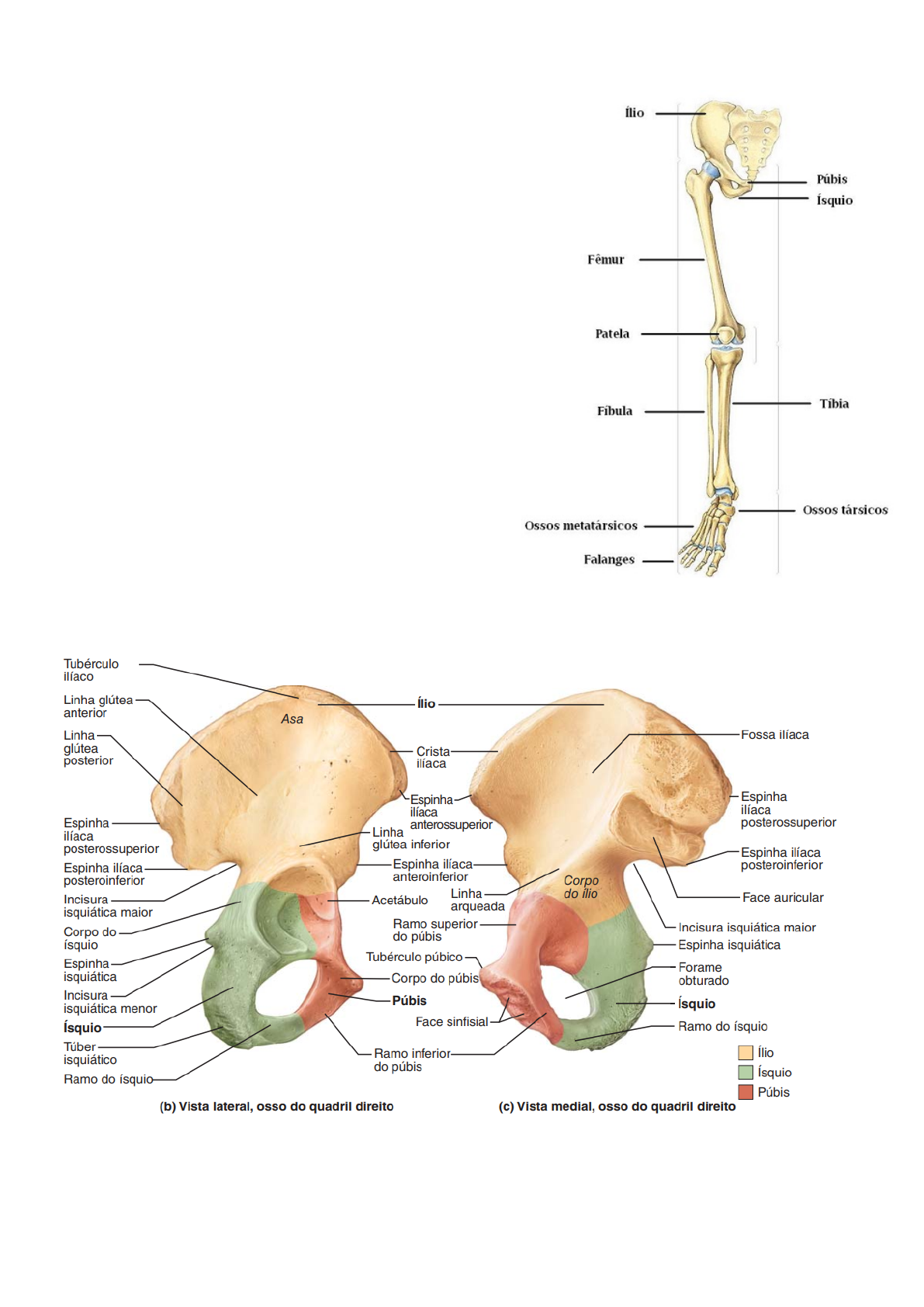 Luana Bianchetti Mosack Membro Inferior 31 ossos Articulações da cintura pélvica: sínfise púbica + sacroilíaca Coxa: fêmur + patela (osso sesamóide) - articulação do quadril/ coxofemoral Perna: tíbia (medial) e fíbula (lateral) Pé: 3 partes - 7 ossos do tarso, 5 metatarsos e 14 falanges Cíngulo do membro inferior: ílio, ísquio e púbis É um anel ósseo, em forma de bacia, que une a coluna vertebral aos dois fêmures. As principais funções do cíngulo do membro inferior são: ● Sustentar o peso da parte superior do corpo nas posições sentada e ortostática ● Transferir o peso do esqueleto axial para o esqueleto apendicular inferior para ficar de pé e caminhar ● Proporcionar fixação aos fortes músculos da locomoção e postura, bem como àqueles da parede abdominal, resistindo às forças geradas por suas ações Cartilagem trirradiada - encontrada no ílio em formação Fossa do acetábulo - onde se encaixa o osso fêmur ílio sempre para cima Púbis é sempre anterior ísquio para posterior No período fetal a fossa do acetábulo contém cartilagem hialina e é completamente fechada por volta de 25 anos. Luana Bianchetti Mosack Forame obturado - membrana obturatória → abaixo da fossa do acetábulo - ramo ísquio e ramo púbico Face auricular → articulação para o sacro Linha arqueada: vista medial, é importante para a divisão da pelve em maior e menor Acima da linha → pelve maior (falsa) Abaixo da linha → pelve menor (verdadeira) Articulação do púbis esquerdo com o direito → sínfise púbica - disco interpúbico, ligamento púbico inferior e superior Tem um pouco de movimento no parto - dilatação Atletas com desregulação muscular podem ter lesão de púbis Tuberosidade/ Túber isquiático - fixação de 3 músculos - isquiotibiais Espinha isquiática: demarca a divisão das incisuras isquiáticas, serve de ligação para ligamentos - formação dos forames isquiáticos maior e menor Articulação lombossacral - fibrocartilaginosa, movimento de deslizamento Articulação do quadril: coxofemoral - sinovial esferóidea Diferenciação da pelve feminina e masculina - ângulo subpúbico é menor nos homens, formato do forame obturado Luana Bianchetti Mosack Plexo sacral Nervo glúteo superior - glúteo médio, glúteo mínimo e tensor da fáscia lata Nervo glúteo inferior - glúteo máximo Nervo Pudendo - inerva a região do períneo, músculos e sensibilidade - passa pelo forame isquiático maior faz uma alça e retorna para a pelve pelo forame isquiático menor, passa colado à espinha isquiática Espinha isquiática - sulco para o nervo pudendo Transita pelos dois forames isquiáticos, inervação da musculatura e da sensibilidade para a região do períneo é anestesiado em situações cirúrgicas Nervo esplâncnico - inerva as vísceras da pelve Luana Bianchetti Mosack Vascularização da pelve Ramos anteriores: ● artéria glútea inferior - entre o segmento S1 e S2 ● artéria pudenda interna ● artéria retal média ● artérias vesicais superiores - ramos da artéria umbilical ● artéria obturatória ● artéria vesical inferior - no homem irriga a bexiga e a próstata Nas mulheres: não tem artéria vesical inferior, será chamada de artéria uterina. Ramos posteriores: são parietais ● artéria iliolombar ● artéria sacral lateral ● artéria glútea superior - imediatamente abaixo do tronco lombossacral - união nervosa entre plexo lombar e plexo sacral Drenagem venosa Pela veia ilíaca interna e por plexos venosos subdurais - predominantemente na região posterior da pelve. Luana Bianchetti Mosack Fêmur Fóvea - ligamento do acetábulo O ângulo de inclinação permite maior mobilidade do fêmur na articulação do quadril porque coloca a cabeça e o colo mais perpendiculares ao acetábulo na posição neutra. Côndilos - fossa intercondilar: onde passam os ligamentos cruzados Articulação do joelho → articulação tibiofemoral (2) + articulação femoropatelar (1) Luana Bianchetti Mosack Tíbia Fossa maleolar articulações tibiofibulares Membrana interóssea: articulação sindesmose Articulação talocalcânea (subtalar) inversão e eversão do pé Luana Bianchetti Mosack M. Psoas maior + M. Psoas menor + M. ilíaco → saem da coluna lombar e vão em direção ao membro inferior - se fixam no trocanter menor do fêmur Ação: contração desses músculos o fêmur vai para anterior - flexão de coxa Quadríceps femoral: grupo muscular - Ação: extensão do joelho/ extensão da perna M. Reto femoral - Flexão do quadril, origem na espinha ilíaca ântero-inferior M. Vasto lateral M. Vasto intermédio M. Vasto medial Formam o tendão patelar Tuberosidade da tíbia - Patela → ligamento patelar M. Sartório - “músculo invisível” função estabilizadora M. Tensor da Fáscia lata - Trato iliotibial -Ação: abdução da coxa Região Glútea: M. Glúteo Máximo M. Glúteo médio M. Glúteo mínimo Músculos inter trocantéricos - Fossa trocantérica - Rotação externa/lateral do fêmur M. Piriforme M. Gêmeo superior M. Obturador interno M. Gêmeo inferior M. quadrado femoral Luana Bianchetti Mosack Região Posterior da coxa - Isquiotibiais → Flexão da perna M. Bíceps femoral - flexão do joelho e extensão do quadril (biarticular) M. Semitendinoso - flexão da perna e extensão da coxa (biarticular) M. Semimembranoso - flexão da perna (biarticular) Adutores: M. Pectíneo M. Adutor Longo M. Adutor Curto M. Adutor Magno M. Grácil Pata de Ganso: Sartório, grácil e semitendinoso Vascularização Ligamento inguinal - limite entre a pelve e o membro inferior Artéria femoral - inicia depois do ligamento inguinal Trígono femoral - triângulo logo abaixo do ligamento inguinal - limites: adutor longo, sartório, ligamento inguinal - Artéria femoral fica no centro - NAV A veia, na região do trígono, sempre recebe a veia safena magna. O músculo iliopsoas é um músculo do assoalho do trígono. Luana Bia