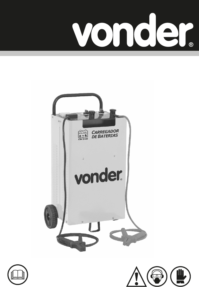 Manual de instruções Leia antes de usar Manual de instruciones Lea antes de usar Im ag en s ilu st ra ti va s/ Im ág en es il us tr at iv as CBV 5200 CARREGADOR DE BATERIA Cargador de bateria MANUAL DE INSTRUÇÕES • ATENÇÃO: Caso este equipamento apresente alguma não conformidade, encaminhe o mesmo para a assistência técnica autorizada. • Ao utilizar os Carregadores de Baterias, devem ser seguidas as precauções básicas de segurança para evitar riscos de choque elétrico e acidentes. 2 • Leia este manual antes de utilizar o Carregador de Baterias. • Guarde o manual para uma consulta posterior ou para repassar as informações para outras pessoas que venham a operar o Carregador de Baterias. Proceda conforme as orientações deste manual. 1 - Orientações gerais 2 - Símbolos Cuidado/Atenção Leia o Manual de Operações/ Instruções Alerta de segurança (riscos de acidentes), e atenção durante o uso Antes de utilizar o Carregador de Baterias, leia o manual de instruções Símbolo Nome Explicação Não descarte peças e partes do produto no lixo comum, procure separar e encaminhar para a coleta seletiva. Informe-se em seu município sobre locais ou sistemas de coleta seletiva. Use EPI (Equipamento de Proteção Individual) Risco de choque elétrico Instruções de ligação elétrica Utilize Equipamento de Proteção Individual adequado para cada tipo de trabalho Manuseie com cuidado: Risco de choque elétrico Seguir as instruções para a correta instalação do carregador Polo positivo Polo negativo Uso interno Carregador de baterias Monofásico - Carregador de baterias Conectar o polo positivo da bateria Conectar o polo negativo da bateria Descarte seletivo Utilize este equipamento em ambientes internos Tabela 1 – Símbolos e seus significados Prezado usuário: Este manual contém detalhes de instalação, funcionamento, operação e manutenção do Carregador de Baterias CBV 5200. O Carregador de Baterias CBV 5200 é indicado para recarregar baterias automotivas do tipo chumbo ácida de 12 V e 24 V. Este carregador de baterias quando ligado em 127 V~ é indicado para carregar baterias de 12 V e 24 V na faixa de 60 Ah a 750 Ah, e em 220 V~ para baterias de 12 V e 24 V na faixa de 100 Ah a 750 Ah. 3 3 - Instruções de segurança ATENÇÃO: Este aparelho não se destina à utilização por pessoas (inclusive crianças) com capacidades físicas, sensoriais ou mentais reduzidas, ou por pessoas com falta de experiência e conhecimento, a menos que tenham recebido instruções referentes à utilização do aparelho ou estejam sob a supervisão de uma pessoa responsável pela sua segurança. • O Carregador de Baterias não deve ser utilizado por crianças ou pessoas que não tenham lido e compreendido este manual; • Manter este aparelho longe do alcance de crianças. Recomenda-se que as crianças sejam vigiadas para assegurar que elas não estejam brincando com o aparelho. • USO INTERNO – Atenção utilizar este equipamento apenas em ambientes internos, mantenha-o protegido da chuva. • Nunca recarregue baterias do tipo não recarregáveis; • Sempre verifique se o carregador está desligado e com o plugue fora da tomada antes de conectar ou desconectar as garras de carga da bateria; • Durante a carga, as baterias produzem gases explosivos. Providencie ventilação adequada, e nunca fume ou permita faíscas ou fogo próximo ao local de carregamento de baterias; • Manter o equipamento em local plano durante a operação, manuseio, transporte e estocagem. A queda brusca do carregador poderá causar danos ao mesmo; • Se durante a utilização acontecer uma queda ou quebra de alguma parte do equipamento, desligue-o imediatamente e leve a uma Assistência Técnica Autorizada VONDER mais próxima. ATENÇÃO: As instruções a seguir devem ser seguidas para a instalação elétrica do carregador de bateria: 1 - A instalação da energia elétrica deve ser feita por um profissional qualificado e de acordo com a norma IEC 60364-1; 2 Antes de ligar o equipamento na rede elétrica verifique se a tensão da rede elétrica é compatível com a do carregador de baterias; 3 - Instale um disjuntor para o Carregador de Baterias, este disjuntor terá a função de interromper o fornecimento de energia elétrica para o carregador sempre que necessário; 4 - O carregador de bateria só deve ser conectado a uma tomada com ligação a terra. 1 - Nunca transporte o Carregador de Baterias segurando pelo cabo elétrico e também nunca puxe o cabo elétrico para desconectar o plugue da tomada. Proteja o cabo elétrico ou extensão de calor, óleo ou superfícies abrasivas e cortantes. 2 - O cordão de alimentação elétrica deve estar sempre em perfeitas condições e sem nenhuma anomalia ou qualquer outro sinal de não conformidade. Se for encontrado qualquer avaria no cordão, encaminhe o carregador imediatamente à uma Assistência Técnica Autorizada VONDER mais próxima. 3 - Adaptações nos plugues podem resultar em riscos de choque elétrico. 4 - Nunca toque no plugue ou nas garras com luvas, mãos e roupas molhadas, ou trabalhe em ambientes alagados ou sob chuva. 5 - Verifique se os cabos estão corretamente conectados antes de ligar o equipamento à rede elétrica. 3.1 - Segurança na operação ATENÇÃO: Utilize EPI (equipamento de proteção individual) como: luvas de proteção, botas e demais roupas de proteção. 3.2 - Segurança na ligação elétrica ATENÇÃO: • Risco de choque elétrico • Não utilize este equipamento sem antes ler este manual de instruções. • Não utilizar em caravanas e veículos similares. ATENÇÃO: Ao iniciar a utilização examine cuidadosamente o Carregador de Baterias, verif icando se o mesmo apresenta alguma anomalia ou não conformidade de funcionamento. Caso seja encontrado alguma anomalia ou não conformidade encaminhe o carregador para uma assistência técnica mais próxima. ATENÇÃO: Certifique-se que o carregado
