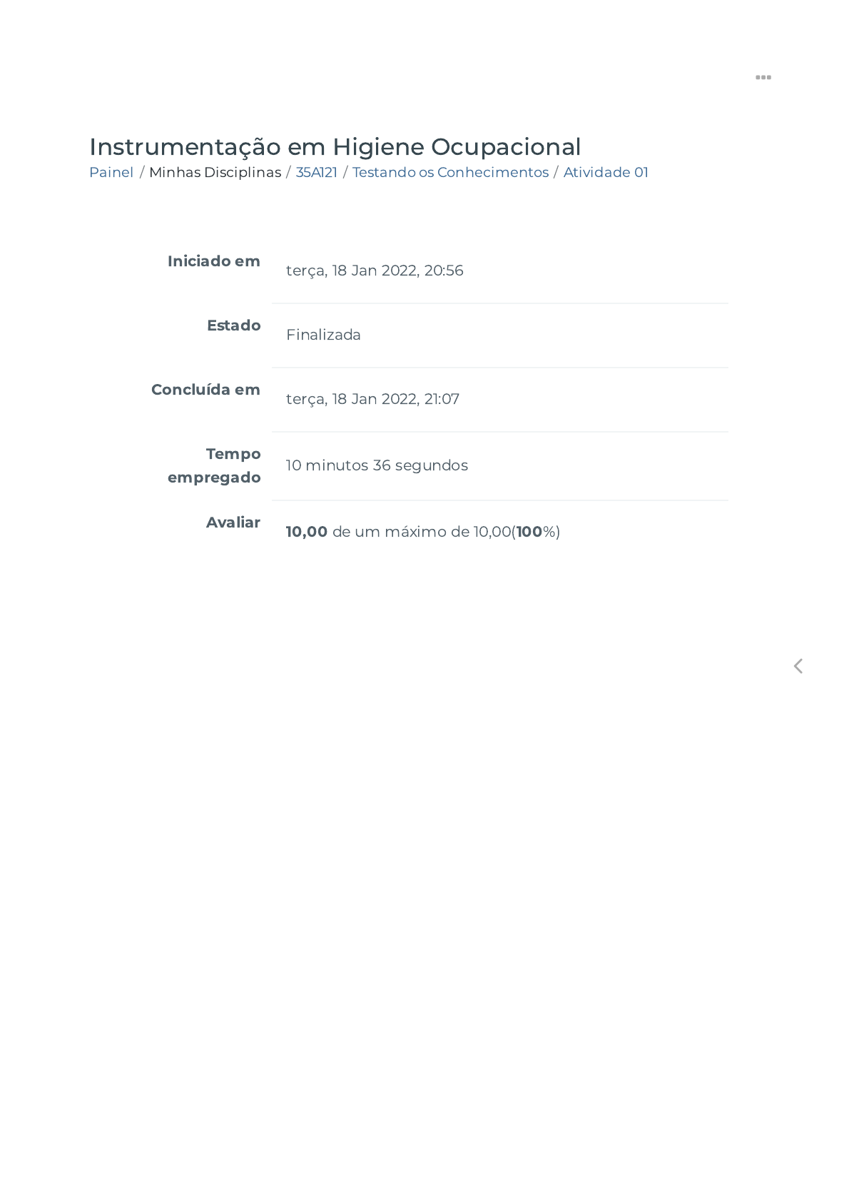 18/01/2022 21:07 Atividade 01 https://ava.politecnicabr.com.br/mod/quiz/review.php?attempt=2526266 1/12 Painel / Minhas Disciplinas / 35A121 / Testando os Conhecimentos / Atividade 01 Instrumentação em Higiene Ocupacional Iniciado em terça, 18 Jan 2022, 20:56 Estado Finalizada Concluída em terça, 18 Jan 2022, 21:07 Tempo empregado 10 minutos 36 segundos Avaliar 10,00 de um máximo de 10,00(100%) https://ava.politecnicabr.com.br/my/ https://ava.politecnicabr.com.br/course/view.php?id=1043 https://ava.politecnicabr.com.br/course/view.php?id=1043#section-9 https://ava.politecnicabr.com.br/mod/quiz/view.php?id=34385 https://ava.politecnicabr.com.br/ 18/01/2022 21:07 Atividade 01 https://ava.politecnicabr.com.br/mod/quiz/review.php?attempt=2526266 2/12 Questão 1 Correto Atingiu 1,00 de 1,00 Lesões, doenças dermatológicas como as ulcerações, frostbite, fenômeno de Raynaud e enregelamento dos membros são os principais sintomas da exposição ao agente físico: Escolha uma opção: a. Vibração b. Calor c. Ruído d. Frio https://ava.politecnicabr.com.br/ 18/01/2022 21:07 Atividade 01 https://ava.politecnicabr.com.br/mod/quiz/review.php?attempt=2526266 3/12 Questão 2 Correto Atingiu 1,00 de 1,00 Existem três metodologias básicas para se fazer a avaliação da radiação. A metodologia que durante inspeção no local de trabalho determina-se o tempo médio utilizado em cada raiogra�a (equipamento ou fonte de funcionamento) é: Escolha uma opção: a. Dosimetria b. Ponto teórico c. Pontual d. Calculo teórico https://ava.politecnicabr.com.br/ 18/01/2022 21:07 Atividade 01 https://ava.politecnicabr.com.br/mod/quiz/review.php?attempt=2526266 4/12 Questão 3 Correto Atingiu 1,00 de 1,00 Na avaliação da exposição ocupacional ao agente físico frio deve-se considerar três fatores principais: Temperatura do ar, velocidade do vento e atividade física realizada pelo trabalhador. Quais equipamentos são utilizados para medir a temperatura do ar e a velocidade do vento respectivamente? Escolha uma opção: a. Termômetro de bulbo úmido e termômetro de bulbo natural b. Termômetro de bulbo seco e anemômetro c. Anemômetro e termômetro de bulbo úmido d. Termômetro de bulbo seco e dosímetro de vento https://ava.politecnicabr.com.br/ 18/01/2022 21:07 Atividade 01 https://ava.politecnicabr.com.br/mod/quiz/review.php?attempt=2526266 5/12 Questão 4 Correto Atingiu 1,00 de 1,00 Corresponde a um grupo de trabalhadores que experimentam exposição semelhante, tanto do ponto de vista das condições ambientais, como das atividades físicas desenvolvidas, de modo que o resultado fornecido seja representativo da exposição de todos os trabalhadores que compõem o mesmo grupo. Escolha uma opção: a. Grupo homogêneo de exposição b. Ciclo de Exposição c. Grupo de exposição ao risco ocupacional d. Grupo de medição ambiental https://ava.politecnicabr.com.br/ 18/01/2022 21:07 Atividade 01 https://ava.politecnicabr.com.br/mod/quiz/review.php?attempt=2526266 6/12 Questão 5 Correto Atingiu 1,00 de 1,00 A vibração consiste em movimento inerente aos corpos dotados de massa e elasticidade. O corpo humano possui uma vibração natural. Se uma freqüência externa coincide com a freqüência natural do sistema, ocorre a ressonância, que implica em ampli�cação do movimento. Segundo NR-15 a exposição a vibrações acima do LT é considerada insalubre de grau médio, isto é, deve-se conceder ao empregado um adicional de 20% do salário mínimo aos seus proventos. Quanto à avaliação quantitativa de vibrações utilizando o Transdutor Piezoelétrico para medição de aceleração absoluta. São itens que não podem faltar em um laudo técnico: Escolha uma opção: a. Tempo de exposição, metodologia de avaliação e certi�cados de calibração b. Instrumental utilizado, resultado da avaliação quantitativa e metodologia de avaliação c. Medidas de prevenção ao risco. Instrumental utilizado e análise de risco d. Neutralização da insalubridade, medidas de eliminação do risco e tempo de exposição https://ava.politecnicabr.com.br/ 18/01/2022 21:07 Atividade 01 https://ava.politecnicabr.com.br/mod/quiz/review.php?attempt=2526266 7/12 Questão 6 Correto Atingiu 1,00 de 1,00 A gravidade da exposição ocupacional ao frio deve levar em consideração a temperatura do ar e a velocidade do vento e da atividade física. A velocidade do ar proporciona um agravamento signi�cativo na exposição a baixas temperaturas. A combinação entre a velocidade do ar e a temperatura de bulbo seco é denominada de temperatura equivalente. Quanto maior for à velocidade do vento e menor a temperatura do local de trabalho, maior deverá ser o isolamento da roupa protetora, e menor o tempo no qual o trabalhador pode �car exposto. Com referencia no texto é correto a�rmar: Escolha uma opção: a. A temperatura do ar é medida com um termômetro de bulbo úmido comum em graus célsius com graduação positiva su�ciente para a temperatura utilizada (preferencialmente 20°C) b. A temperatura do ar é medida com um termômetro de bulbo seco comum em graus célsius com graduação negativa su�ciente para a temperatura utilizada (preferencialmente - 50°C). c. A velocidade do vento deve ser medida por meio de anemômetros, que devem medir na escala de metros por segundo (m/s) d. A velocidade do vento deve ser medida por meio de termoanemômetros, que devem medir na escala de kilômetro por segundo (k/s) https://ava.politecnicabr.com.br/ 18/01/2022 21:07 Atividade 01 https://ava.politecnicabr.com.br/mod/quiz/review.php?attempt=2526266 8/12 Questão 7 Correto Atingiu 1,00 de 1,00 Em ambientes interno como é feito o cálculo do IBUTG? Escolha uma opção: a. IBUTG = 0,3 TBN x 0,7 TG b. IBUTG = 0,7 TBN + 0,3 TG c. IBUTG = 0,7 TBN x 0,3 TG d. IBUTG = 0,3 TBN + 0,7 TG https://ava.politecnicabr.com.br/ 18/01/2022 21:07 Atividade 01 https://ava.politecnicabr.com.br/mod/quiz/review.php?attempt=252626