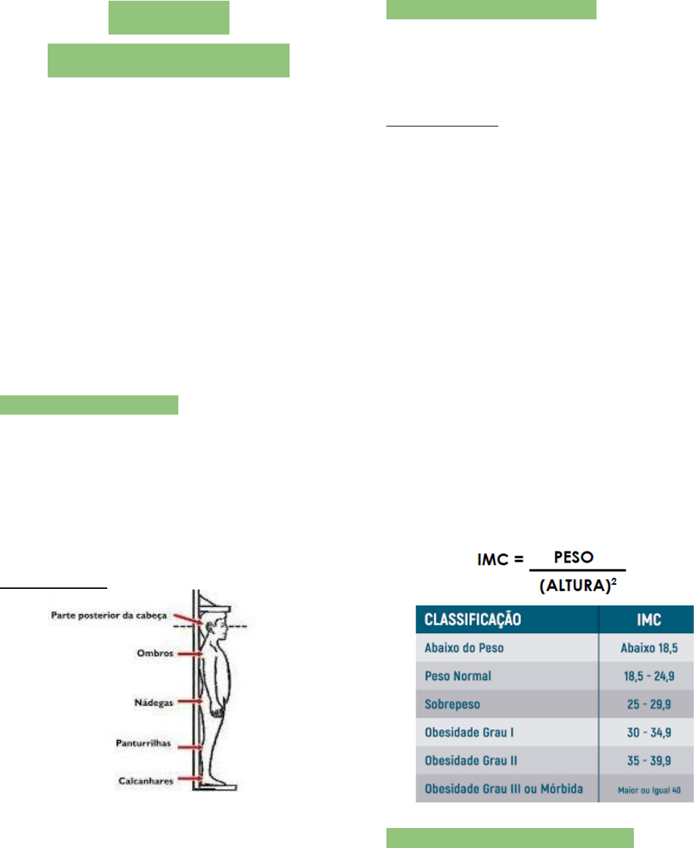Medidas Antropométricas Flávia Licia Mendes de Assis • A antropometria estuda as medidas e proporções do corpo humano. • Utilizadas para o diagnóstico do estado nutricional (desnutrição, sobrepeso e obesidade). • Avaliação do risco para doenças (diabetes mellitus, hipertensão arterial e cardiopatias). • Crescimento e desenvolvimento em bebês e crianças. 1- Aferição da Altura • Estatura: Expressão para comprimento ou altura. • Comprimento: Para a estatura de crianças > 2 anos. • Altura: Para a estatura de crianças > 2 anos, adolescentes, adultos, idosos... Semiotécnica • Posicionar em pé de forma ereta; • Sem adornos na cabeça e pés descalços; • Posicionar o dorso junto a haste de medição; • Membros superiores pendentes; • Calcâneos unidos e as pontas dos pés pouco afastadas entre si; • Paciente permanecer imóvel. • Retirar o paciente e aferir a marcação. • Registrar em ficha ou prontuário. 2- Peso (Massa Corporal) Calibração Adequada Se necessário, girar lentamente o calibrador, até que a agulha e o fiel estejam nivelados. Semiotécnica • Interrogar peso aproximado; • Posicionar em pé de forma ereta; • Menor quantidade de vestimenta possível e pés descalços; • Membros superiores pendentes; • Pés pouco afastados entre si; • Peso distribuído em ambas as pernas; • Paciente permanecer imóvel; • Aferir o valor e registrar em prontuário/ caderneta. Índice de Massa Corporal (IMC) • Método que relaciona peso e estatura, para avaliar a adiposidade e disposição ao sobrepeso. • Complementar a outras medidas antropométricas e meios diagnósticos quando necessário. 3- Circunferência Abdominal Melhor preditor de morbimortalidade cardiovascular se comparado ao IMC. Medida logo acima da crista ilíaca Valores normais: • Homens: 102 cm • Mulheres: 88 cm 4- Circunferência Da Cintura Reflete o conteúdo de gordura visceral. Masculino • Normal: -94 cm • Aumentado: 94 a 102 cm • Muito aumentado: +102 cm Feminino • Normal: -80 cm • Aumentado: 80 a 88 cm • Muito Aumentado: +88 cm 5- Relação Cintura-Quadril Valores normais: • Mulheres: < 0,8 • Homens: < 0,95