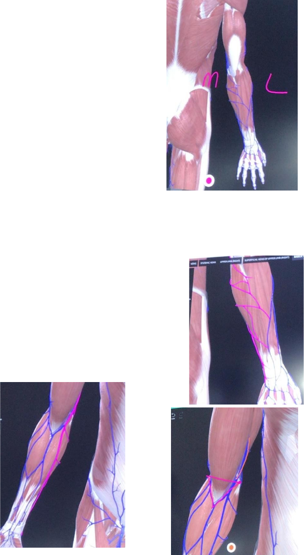 Anatomia V.Membro Superior 🡪 Veias calibrosas, acima das fáscias – superficial 🡪 Veias após a fascia – veias profundas 🡪 A retirada da pele nos mostra uma tela subcutânea, entrelaçado as veias. PELE – TELA SUBCUTANEA envolvendo as VEIAS A veia é um elemento estreito que circula por uma superfície revestida de gordura, ou seja, as veias estão imersas nesse conteúdo adiposo – essas são as veias superficiais. 🡪 Após remover a tela subcutânea, vemos os músculos. Sobre os músculos há a fáscia superficial (cada musculo tem a sua) e tem uma fáscia geral que recobre todo o corpo PELE – TELA SUBCUTANEA – VASOS SUPERFICIAIS – FÁSCIA SUPERFICIAL - MÚSCULOS 🡪 Se rebater os músculos, mais profundamente encontraremos outras veias – veias profundas · Antes da fáscia superficial – veias superficiais · · Depois da fáscia supericial – veias profundas 🡪 Nas veias começamos na periferia e levamos até o centro. Iniciamos com vasos finos que se tornam mais calibroso – as veias vão tributar – levar seu conteúdo de um vaso de menor calibre para um vaso de maior calibre. 🡪 Na região superficial vemos duas veias nas faces laterais e mediais do antebraço: - Uma segue na face medial - Outra na face lateral Esses vasos trabalham coma a drenagem da parte dorsal da mão. Portanto a face dorsal da mão será drenada a partir de uma junção de veias denominada rede venosa dorsal. E ela converge para dois vasos importantes Veia basílica (face medial do braço) e Veia cefálica (parte lateral do braço) · Essa rede venosa coleta sangue do dorso da mão – depois segue pela medial (basilica do antebraço) e pela lateral (veia cefálica) VEIA BASÍLICA DO ANTEBRAÇO 🡪 Ela transita pelo antebraço e pelo braço, e alguns acontecimentos estão no cotovelo, portanto podemos dizer que a basílica tem partes: A rede venosa dorsal será drenada pela face medial do braço através da Veia basílica do antebraço, tendo sua origem na base do quinto metacarpo ascende pela face dorsal do antebraço (mais fina) até o terço médio do antebraço, onde ela se curva medialmente e ganha a face anterior do antebraço e segue anteriormente até a fossa cubital (mais calibrosa) 🡪 Ela passa próximo (medialmente) a fossa cubital (não adentra) trocando o seu nome de veia basílica do antebraço para – Veia basílica (laranja) 🡪 A veia basílica entra no sulco bicipta medial na face medial do bíceps e segue ascendentemente. 🡪 Durante o percurso nesse sulco, aproximadamente o terço médio do braço, sobre a fáscia superficial ela encontra uma região onde ela consegue atravessar a fáscia superficial pelo hiato basílico (abetura na fascia) ela se torna uma veia profunda. · A veia basílica é superficial até o terço médio do braço. Do terço médio do braço ela é superficial, mas indo para o terço proximal ela é mais profunda. VOLTANDO PARA A MÃO NA FACE DORSAL VEIA CEFÁLICA DO ANTEBRAÇO 🡪 Essa veia encontra-se na face lateral e tem seu inicio na base do primeiro metacarpo ou em uma região denominada de tabaqueira anatômica. Ela segue dorsalmente até o terço médio do antebraço, nesse terço médio ela gira e se torna anterior, ela segue lateralmente a fosse cubital, trocando o seu nome para veia cefálica, ela ganha o sulco bicipital lateral, até o ponto de inserção do músculo deltoide, então ela sai do sulco do bíceps, contorna o musculo deltoide no sulco deltopeitoral e segue por ele, até uma região denominada trigono clavipeitoral. Obs: Platismo – músculo que sai da mandíbula e se insere na pele – extrai ele para ver o músculo que está realmente no pescoço TRIGONO CLAVIPEITORAL – clavícula + músculo peitoral maior + deltoide Essa veia cefálica vai até o trigono clavipeitoral, onde perfura a fáscia superficial e torna-se profunda CONCLUINDO O COMPARTIMENTO SUPERFICIAL 🡪 A veia basílica e cefálica do antebraço apresentam uma comunicação na face anterior do cotovelo, feita por uma veia chamada Veia intermédia do cotovelo – na face anterior da fossa. Essa comunicação pode ser feita de vários modos. 1º possibilidade: intermedia do cotovelo (verde água) ligando a basílica do antebraço a cefálica do antebraço. O volume de sangue passa da basílica do antebraço para a cefálica do antebraço, esse sangue então tributando na veia cefálica vai estar junto do sangue que já passava normalmente pela cefálica, portando ela precisará de um calibre aumentando já que há o desvio de sangue de dois locais nela e a veia basílica passa a ser o vaso mais fino já que a maioria do sangue é desviado.Concluído: na face anterior do antebraço teremos a veia intermedia do antebraço ela tributa para a veia intermedia do cotovelo que tributa para a cefálica do antebraço 2º possiblidade: inverso 🡪 Sai da cefálica do antebraço e drena para a basílica do antebraço. O sangue da face lateral do antebraço é drenado parte dele pela cefálica e parte pela basílica, portanto quem vai aumentar o calibre é a basílica. Concluído: na face anterior do antebraço teremos a veia intermedia do antebraço ela tributa para a veia intermedia do cotovelo que tributa para a basílica do antebraço 3º Possibilidade: não há a mudança de calibre entre veia cefálica e basílica. A posição da estrutura que liga – veia intermédia é em V. O vaso que drena o sangue da face anterior do antebraço - chamada de veia intermedia do antebraço pode distribuir o volume igualmente tanto para a cefálica quanto para a basílica. Concluído: na face anterior do antebraço teremos a veia intermedia do antebraço ela tributa para a veia intermedia do cotovelo que se organiza em forma de V, tributando tanto para a cefálica quanto para a basílica de antebraço. Prova: descreva a drenagem superficial do membro superior, começa desde a rede venosa dorsal e escolher uma dessas opções VEIAS PROFUNDAS 🡪 Tem de r
