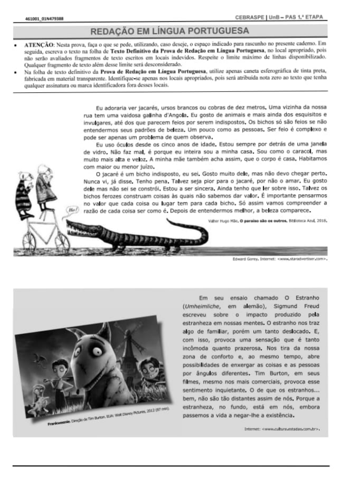 CEBRASPEJUnB-PAS 1 ETAP REDAÇÃO EM LÍNGUA PORTUGUESA ATENCAO Nesta prova, Tacu o que se pedc utando, cao dc não serdo avaliados firagmentos de texto escritos em locais indevidos. Respeite o limite máximo de linhas disponibilizado Dualquer fragmento de texto além desse limite sera desconsiderado. Na folha de texto defimitivo da Prava de Redação em Lingua Partuguesa, utilie upenas canta esterograicade ta prta, fabricada em material transparente. ldentifiqucese apenas nos locais apropriados. pois sera atrbuda notia Zero ao lexio que enhia Eu adoraria ver jacarés, ursos brancos ou cobras de dez metros. Uma vizinha da nossaa rua tem uma vaidosa gainha d'Angola. Eu gosto de animais emas ainda dos esquisitose ugares, Ote dos que parecem reioS por serem indispostos, Os bichos so são feios se nãoo entendermos seus padröes de beleza. Um pouco como as pessoas, Ser feio é complexo e pode ser apenas um probema de quem observa, Eu e inteira sa 1aa0e, Estou sempre por deträs de uma janela Sou como o caracol, mas muito mais ata e veloz. A minha mãe também acha assim, queo corpo é casa. Habitamos O jacare e um bicho indisposto, eu sel. Gosto muito dele, mas nao devo chegar perto Nunca vi, jä disse, Tenho pena. Tavez seja pior par o jacare, por nao o amar, tu 905to dele mas não sel se constrói, Estou a ser sincera, Ainda tenho que ler sobre isso,. Talvez os bichos ferozes construam coisas as quais nao sabemos dar valor. E impontante pens3mos eoiea Fer romo é. Depois de entendermos melhor, a eza comnarece. ão de cada coisa ser como e. Depois a Opr s s outros, ftioteca Atul 2018, tdwerd rey, Intermet: <mwm.staradvertiser om Em seu ensaio chamado O Estranh0 (Umheimliche, em alemão), Sigmund Freud escreveu sobre o impacto produzido pela estranheza em nossas mentes. O estranho nos traz algo de tamliar, porèm um tanto deslocado. E, com Iss0, provoca uma sensaçao que e tanto incomoda quanto prazerosa, Nos tira da nossa zOna de contorto , do mesmo tempo, abre possibilidades de enxergar as coIsias e as pessoas por angulos diferentes. Tim Burton, em seus hmes, mesimo nos mais comerciais, provoca esse sentimento inquietante. O de que os estranhos. Dem, nao sa0 tao distantes a5sim de nos. Porque a stranez0, no unao, ta enos, bora pssermos a vida a negar-ine a existencid. Pranke oman ranhez ttemet:ww.cuhrnstadaocom.br> CEBRASPE UnE-PAS 1." ETAPA saby vocé não precisa De um saldo de beleza Num saläo de beleza A Sud Dedeza e bem maior DO que quauer beeza De quaquer salao. Mundo veho decadente mundo Alnda na0 aprendeu verdadeira beleza beleza que poe mesa que delta na cama A beleza do erro uro do engano Da imperfeiçao.. Zeca bakire, Salio de belets. "Nao hå beleza perfeita que não contenha algo de estranho nas suas proporções Na cultura japonesa, wabé-sabi é um ideal est�tico que pode ser definido como a beleza das coisas inperfeitas, impermanentes e incompletas, uma beleza das coisas modestas e simples, uma beleza das coisas não comvencionais. Considerando essa intormagáo e os iextos aprescntados, redyja um textO dissertalivo-arguamentanvo acefa ds segunie icma. APRENDERA VER A BELEZA NO DIFERENTE ENEM: Tema fobrigatório):uupzacdax a lx elena n_dixADso UNB: PAS 1:X PAS 2: PAS 3: 1 somtaG Balo odoxa cmplada m Acule XVIL tbrodn0 hisinoa dauacampnnana qua acauasma rudode.ena doircãa cuaia a octiaxia 1te -padxn aatticen srcludotn innttudn hecadad jomopclocm domeoniin dipranstib do bernm CamaLdunadmlelgn Primainame 120 Koltax quo_ o8 Jme da huled ummdnenan odrs do lelapa enom stalëlocidea Ne PRisdia romarctintoAen cAmmpla an 10 umszOhAMAm Cnhidexodan 8 9 mu0hoMNn_moib 19- Q mih. sia Cmytoa n auo a padkmpc�n dua Igaza Ja t 12cgm Que idodoea mnddocon bua apaxomca a po in de Qup Cmmidinade mminaemto pelo odoad eca 14 emammde o gamalhapcog do_Cuxg lotkm 1 apnazera 15 ome um olxeCiha poxa JmO CEoumisiaduquo ma 16 ouidsorilocoe dommin moLanie dihculin ndmmendouminXuaa 18 noca da srleng no udadL Q LomaL Ebaauclimúio 17 19 et 0comple xstRoa o. hitado uinut PuWoerondim m 20mimaquo noo lu gm 2ormao DLAwide ha. 2 Qu a d sccu20e do imhnxdusa qua ma _9mco 23 omm imha do pembominiedcxaa 23A odHoA_ impen pRla beudade o qun dlobem 24 KOdo spoLemcite e dpaxonpe6 edubcunaa do 25 eB entnmle depaqmdo-oa Jmgenlmcia do qua a JecAocdade Dromda a sex Delno deraoi alxangén da doclni 23O9 de semrule do elanA inecenbiduon Jsele coda raepoculox da moinxdu Jumiuo.Dba nm ua qoa OBSERVAÇÕES DA cORREÇÃÖ: