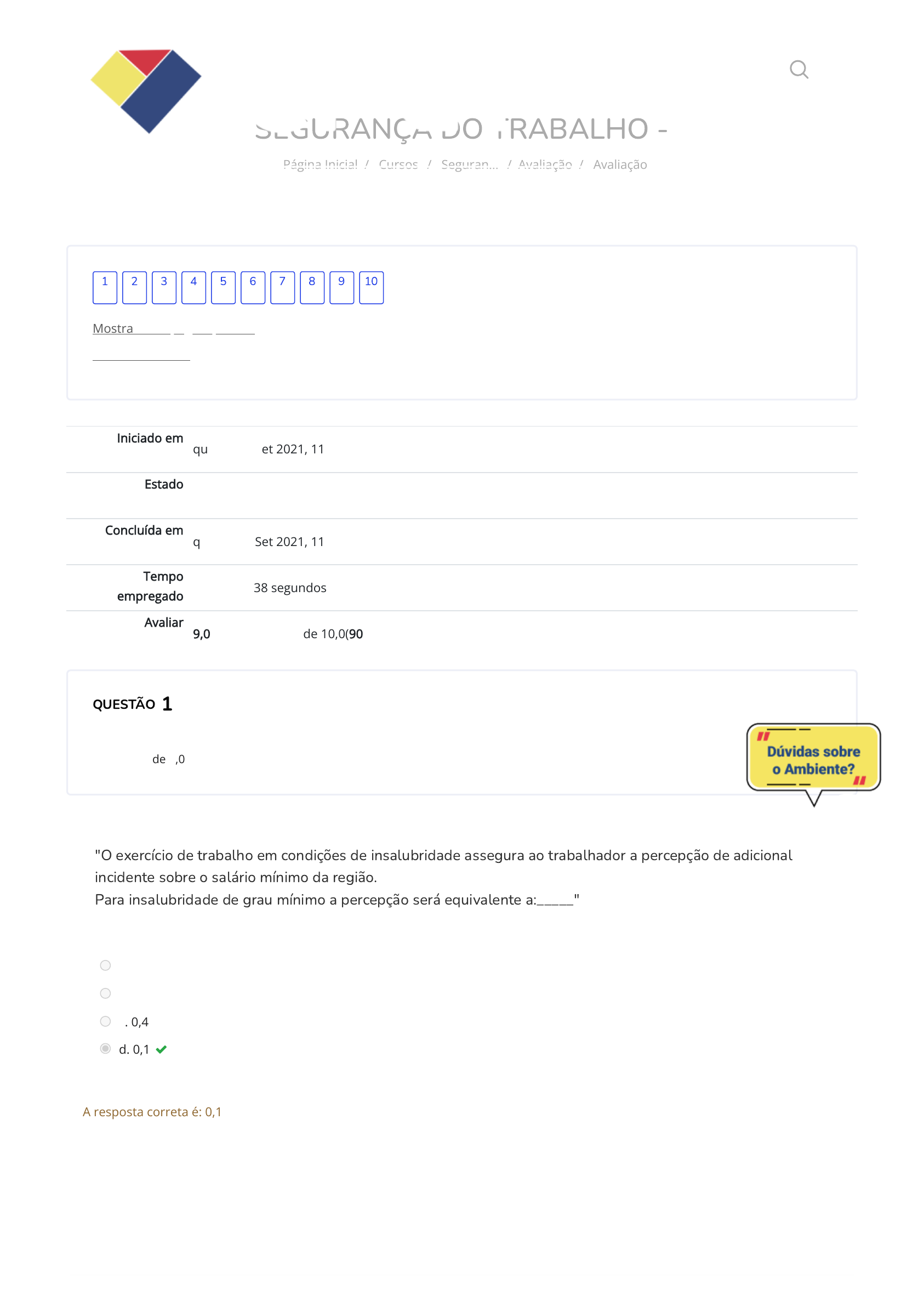 01/02/2022 11:43 Avaliação: Revisão da tentativa https://cpetead.com.br/mod/quiz/review.php?attempt=1794907&cmid=27277 1/6 SEGURANÇA DO TRABALHO - Página Inicial / Cursos / Seguran… / Avaliação / Avaliação Iniciado em quarta, 29 Set 2021, 11:44 Estado Finalizada Concluída em quarta, 29 Set 2021, 11:54 Tempo empregado 9 minutos 38 segundos Avaliar 9,0 de um máximo de 10,0(90%) QUESTÃO Correto Atingiu 1,0 de 1,0 Mostrar uma página por vez Terminar revisão 1 2 3 4 5 6 7 8 9 10 1 "O exercício de trabalho em condições de insalubridade assegura ao trabalhador a percepção de adicional incidente sobre o salário mínimo da região. Para insalubridade de grau mínimo a percepção será equivalente a:_____" Escolha uma opção: a. 0,2 b. 0,3 c. 0,4 d. 0,1 A resposta correta é: 0,1 https://cpetead.com.br/ https://cpetead.com.br/course/index.php https://cpetead.com.br/course/view.php?id=1340 https://cpetead.com.br/mod/quiz/view.php?id=27277 https://cpetead.com.br/mod/quiz/review.php?attempt=1794907&cmid=27277&showall=0 https://cpetead.com.br/mod/quiz/view.php?id=27277 https://cpetead.com.br/ 01/02/2022 11:43 Avaliação: Revisão da tentativa https://cpetead.com.br/mod/quiz/review.php?attempt=1794907&cmid=27277 2/6 QUESTÃO Correto Atingiu 1,0 de 1,0 QUESTÃO Correto Atingiu 1,0 de 1,0 2 As lesões por queimaduras podem ser de: Escolha uma opção: a. 1o, 2o e 3o graus. b. 1o e 2o graus. c. 2o e 3o graus. d. 1o, 2o, 3o e 4o graus. A resposta correta é: 1o, 2o e 3o graus. 3 "De acordo com a Norma Regulamentadora 7 - Programa de Controle Médico de Saúde Ocupacional:_____" Escolha uma ou mais: a. O Atestado de Saúde Ocupacional deverá conter, entre outras informações, a de�nição de apto ou inapto para a função especí�ca que o trabalhador vai exercer, exerce ou exerceu. b. Cabe ao empregado, mediante requerimento justi�cado, exigir, ao médico coordenador do programa, a realização de exames complementares em laboratório por ele indicado. c. Para cada exame realizado, o médico emitirá Atestado de Sanidade Funcional em três vias, sendo uma delas destinada à unidade descentralizada do Ministério do Trabalho e Emprego. d. O desenvolvimento do programa contempla os exames demissional, de mudança de função, de retorno ao trabalho, periódico e admissional, que inclui o teste de gravidez para as mulheres. A resposta correta é: O Atestado de Saúde Ocupacional deverá conter, entre outras informações, a de�nição de apto ou inapto para a função especí�ca que o trabalhador vai exercer, exerce ou exerceu. 01/02/2022 11:43 Avaliação: Revisão da tentativa https://cpetead.com.br/mod/quiz/review.php?attempt=1794907&cmid=27277 3/6 QUESTÃO Correto Atingiu 1,0 de 1,0 QUESTÃO Correto Atingiu 1,0 de 1,0 4 "Compete ao Serviço Especializado em Engenharia de Segurança e Medicina do Trabalho (SESMT), EXCETO:_____" Escolha uma opção: a. Manter permanente relacionamento com a CIPA, valendo-se ao máximo de suas observações, além de apoiá-la, treiná-la e atendê-la, conforme dispõe a NR 5. b. Responsabilizar-se tecnicamente pela orientação quanto ao cumprimento do disposto nas NRs aplicáveis às atividades executadas pela empresa e/ou seus estabelecimentos. c. Exigir do empregador, quando esgotados todos os meios conhecidos para a eliminação do risco e este persistir, mesmo reduzido, a compra de Equipamento de Proteção Individual (EPI), de acordo com o que determina a NR 6. d. Colaborar, quando solicitado, nos projetos e na implantação de novas instalações físicas e tecnológicas da empresa, exercendo a competência disposta na alínea “a”. A resposta correta é: Exigir do empregador, quando esgotados todos os meios conhecidos para a eliminação do risco e este persistir, mesmo reduzido, a compra de Equipamento de Proteção Individual (EPI), de acordo com o que determina a NR 6. 5 Portaria no 3.214, de 08 junho de 1978, aprovou as Normas Regulamentadoras do Ministério do Trabalho e Emprego (MTE). Está de acordo com essa portaria a seguinte NR: Escolha uma opção: a. NR 17 - Segurança e Saúde no Trabalho Aquaviário b. NR 29 - Segurança e Saúde no Trabalho Portuário c. NR 31 - Ergonomia d. NR 15 - Segurança e Saúde no Trabalho Portuário A resposta correta é: NR 29 - Segurança e Saúde no Trabalho Portuário 01/02/2022 11:43 Avaliação: Revisão da tentativa https://cpetead.com.br/mod/quiz/review.php?attempt=1794907&cmid=27277 4/6 QUESTÃO Incorreto Atingiu 0,0 de 1,0 QUESTÃO Correto Atingiu 1,0 de 1,0 6 O extintor de incêndio cujo procedimento de uso consiste em retirar o pino de segurança, empunhar e apertar o gatilho, e dirigir o difusor por toda a extensão do fogo, é o de: Escolha uma ou mais: a. Dióxido de Carbono b. PQS com pressão injetável. c. Água com pressão injetada. d. Espuma mecânica pressurizada. A resposta correta é: Dióxido de Carbono 7 A Portaria no 3.214, de 08 junho de 1978, aprovou as Normas Regulamentadoras do Ministério do Trabalho e Emprego (MTE). Está de acordo com essa portaria a seguinte NR: Escolha uma opção: a. NR 4 - Comissão Interna de Prevenção de Acidentes - CIPA b. NR 3 - Embargo e Interdição c. NR 6 - Serviço Especializado em Engenharia de Segurança e Medicina do Traba- lho - SESMT d. NR 5 - Programa de Controle Médico de Saúde Ocupacional - PCMSO A resposta correta é: NR 3 - Embargo e Interdição 01/02/2022 11:43 Avaliação: Revisão da tentativa https://cpetead.com.br/mod/quiz/review.php?attempt=1794907&cmid=27277 5/6 QUESTÃO Correto Atingiu 1,0 de 1,0 QUESTÃO Correto Atingiu 1,0 de 1,0 8 "Diante do quadro preocupante que se oferecia ao planeta e a todos os seres vivos, países de todo o mundo reuniram-se para discutir o ____________________, no Japão, em 1997, para �rmar o compromisso de redução da emissão de gases na atmosfera, principalmente pelos países mais industrializados do mundo, com atenção especial aos Estados Unidos, considerados um dos