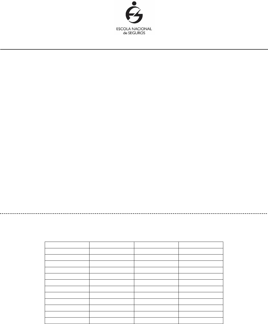 5 de Junho de 2019 63º EXAME PARA HABILITAÇÃO DE CORRETORES DE SEGUROS - 3ª PROVA DISCIPLINAS QUESTÕES LUCROS CESSANTES 1 a 10 RISCO E PRECIFICAÇÃO DE SEGUROS DE DANOS 11 a 15 SEGUROS AERONÁUTICOS E DE CASCOS MARÍTIMOS 16 a 25 SEGUROS COMPREENSIVOS 26 a 35 SEGUROS DE RISCOS RURAIS E EQUIPAMENTOS RURAIS 36 a 40 SEGUROS DE TRANSPORTES 41 a 50 TIPO B TIPO B Ao terminar toda a prova, copie as suas respostas, destaque este quadro e guarde-o com você. 1 - 14 - 27 - 40 - 2 - 15 - 28 - 41 - 3 - 16 - 29 - 42 - 4 - 17 - 30 - 43 - 5 - 18 - 31 - 44 - 6 - 19 - 32 - 45 - 7 - 20 - 33 - 46 - 8 - 21 - 34 - 47 - 9 - 22 - 35 - 48 - 10 - 23 - 36 - 49 - 11 - 24 - 37 - 50 - 12 - 25 - 38 - 13 - 26 - 39 - 63º EXAME PARA HABILITAÇÃO DE CORRETORES DE SEGUROS - 3ª PROVA - TIPO B TIPO B - 05/06/2019 CADERNO DE QUESTÕES #2170286 - PÁGINA 2 DE 11 INSTRUÇÕES Leia atentamente. Você recebeu do fiscal o seguinte material: um caderno de provas com 50 questões e uma folha de respostas personalizada para a Prova Objetiva. Observe na folha de respostas se o seu nome, nº de inscrição e CPF, contidos no campo de identificação, conferem com os seus dados. É obrigatório sua assinatura no campo específico da folha de respostas. ATENÇÃO! 1. Verifique o número de questões e folhas de sua prova. 2. Na folha de respostas, marque a opção com o caderno de prova que você recebeu para responder. 3. A folha de respostas não pode ser dobrada, amassada, rasurada, molhada, manchada, ter rabisco, rubrica, desenho, ou conter qualquer registro fora do local destinado à sua resposta, pois será inutilizada. 4. Para cada uma das questões, na folha de respostas, são apresentadas 5 (cinco) opções classificadas com as letras: (A), (B), (C), (D) e (E). 5. Você só deve assinalar uma única resposta, a que você julgar correta. 6. A maneira correta de marcar as respostas na folha é preencher, com caneta esferográfica de tinta preta ou azul, o interior do círculo correspondente à letra escolhida, sem ultrapassar os seus limites, conforme exemplo abaixo: 7. A indicação de mais de uma opção invalida a questão, mesmo que uma das respostas esteja correta. 8. A resposta em branco também será invalidada. 9. Qualquer outra marcação, por mais leve que seja, em círculo diferente da opção escolhida, também invalida a questão. 10. Será atribuída nota zero para cada questão invalidada. 11. O tempo disponível para esta prova é de 3 horas. 12. Reserve 15 (quinze) minutos, antes do prazo de término da prova, para o preenchimento da folha de respostas, a fim de evitar rasuras ou possíveis enganos. 13. Os candidatos não poderão levar a prova. O pontilhado na capa da prova destina-se a anotar o seu gabarito e tipo de prova. Ao término da prova, destaque a parte pontilhada e leve consigo. 14. A realização da prova é, estritamente, individual. 15. Ao terminar, entregue ao fiscal a folha de respostas e o caderno de provas. B O A P R O V A ! 63º EXAME PARA HABILITAÇÃO DE CORRETORES DE SEGUROS - 3ª PROVA - TIPO B TIPO B - 05/06/2019 CADERNO DE QUESTÕES #2170286 - PÁGINA 3 DE 11 LUCROS CESSANTES 1. MARQUE A ALTERNATIVA CORRETA Em relação à cobertura adicional de honorários de peritos contratados, no Seguro de Lucros Cessantes, podemos afirmar que: A) Para a definição do prêmio adicional, aplica-se a taxa básica do evento coberto, majorada na proporção da cláusula de rateio. B) Para que haja cobertura, a contratação dos peritos contadores deve ser feita pela seguradora, a fim de que os profissionais auxiliem na regulação do sinistro. C) É inaplicável o rateio, ou seja, essa cobertura adicional é a 1º Risco Absoluto. D) A cobertura deverá ser única para todos os eventos previstos na cobertura básica. E) Não existe limite para as verbas relativas às coberturas adicionais. _________________________________________________ 2. MARQUE A ALTERNATIVA CORRETA O objeto do Seguro de Lucros Cessantes é o(a): A) Lucro contábil e a margem de lucro. B) Despesa fixa e a despesa variável. C) Manutenção da operacionalidade e da lucratividade da empresa. D) Custo variável e o preço total de custo. E) Balanço Patrimonial e os relatórios financeiros. _________________________________________________ 3. ANALISE AS PROPOSIÇÕES A SEGUIR E DEPOIS MARQUE A ALTERNATIVA CORRETA A Cobertura de Impedimento de Acesso é uma garantia compreendida na cobertura básica do Seguro de Lucros Cessantes, portanto não há necessidade de pagamento de prêmio adicional, nem de se estabelecer verba específica. Nesse sentido, sobre caracterização dessa cobertura, podemos afirmar que: I) A interdição do local precisa ser decretada por autoridade competente. II) Independe do fato de que nenhum dos locais segurados tenha sofrido dano material. III) É necessário que o evento causador do dano material na vizinhança esteja garantido pela apólice do segurado. Agora assinale a alternativa correta: A) Somente I e III são proposições verdadeiras. B) Somente III é proposição verdadeira. C) Somente II e III são proposições verdadeiras. D) I, II e III são proposições verdadeiras. E) Somente I e II são proposições verdadeiras. _________________________________________________ 4. MARQUE A ALTERNATIVA CORRETA Na perspectiva dos Seguros de Lucros Cessantes, um exemplo de despesa variável é o(a): A) Aluguel. B) Conservação e manutenção. C) Seguro (exceto o de Transportes). D) Salário e ordenados. E) Consumo de matérias-primas. _________________________________________________ 5. MARQUE A ALTERNATIVA CORRETA Em relação ao conceito de Lucro Bruto, no contexto do Seguro de Lucros Cessantes, podemos afirmar que: A) É igual do lucro líquido operacional que consta das demonstrações contábeis. B) É composto exclusivamente pelas rendas de capital e pelas despesas a elas atribuíveis. C) É a soma do lucro líquido com as despesas fixas. D) É considerado bruto, pois são adicionadas as despesa