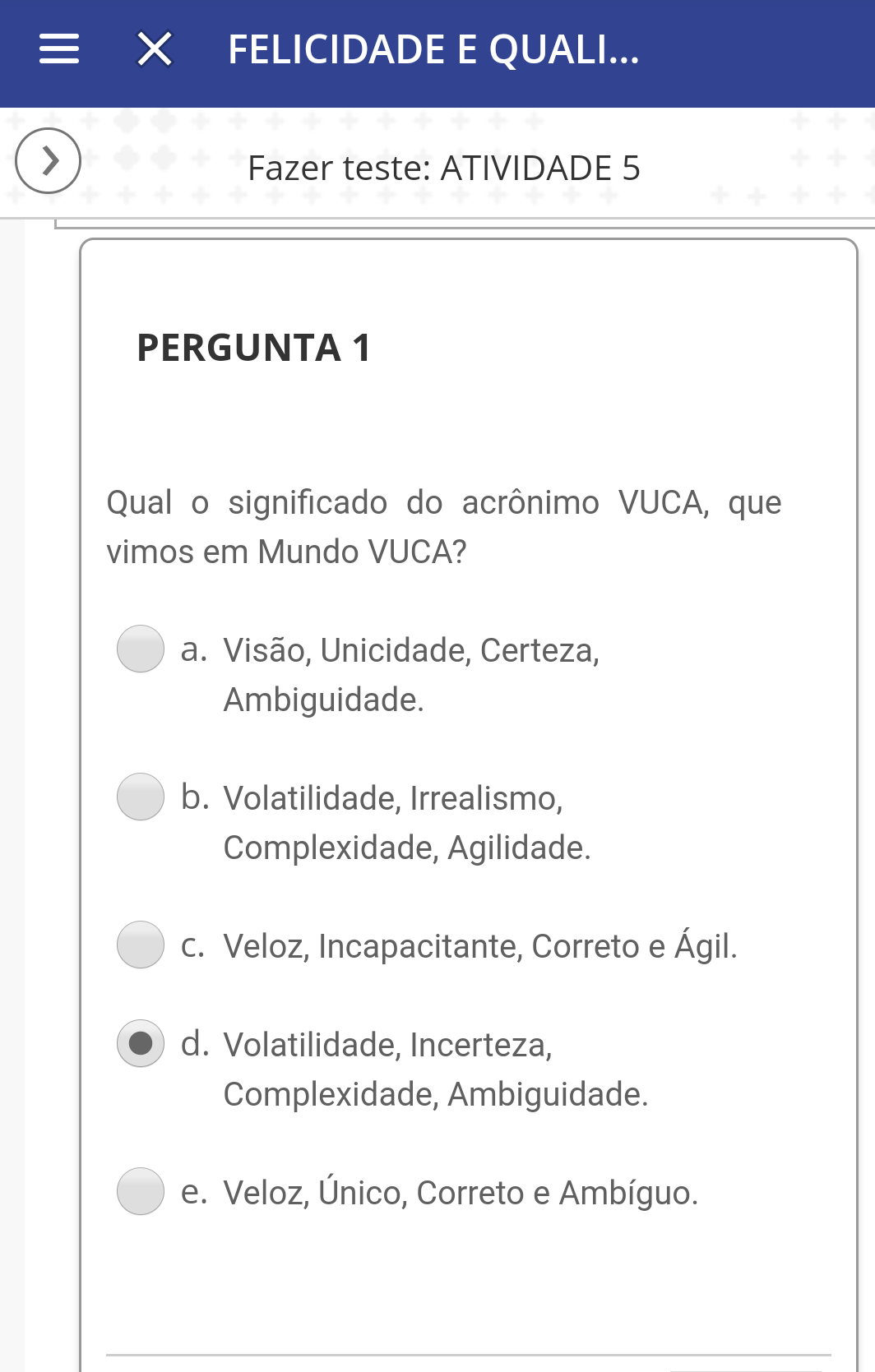 Qual o significado do acrônimo VUCA, que vimos em Mundo VUCA? a. Visão, Unicidade, Certeza, Ambiguidade. b. Volatilidade, Irrealismo, Complexidade, Agilidade. c. Veloz, Único, Correto e Ambíguo. d. Veloz, Incapacitante, Correto e Ágil. e. Volatilidade, Incerteza, Complexidade, Ambiguidade.